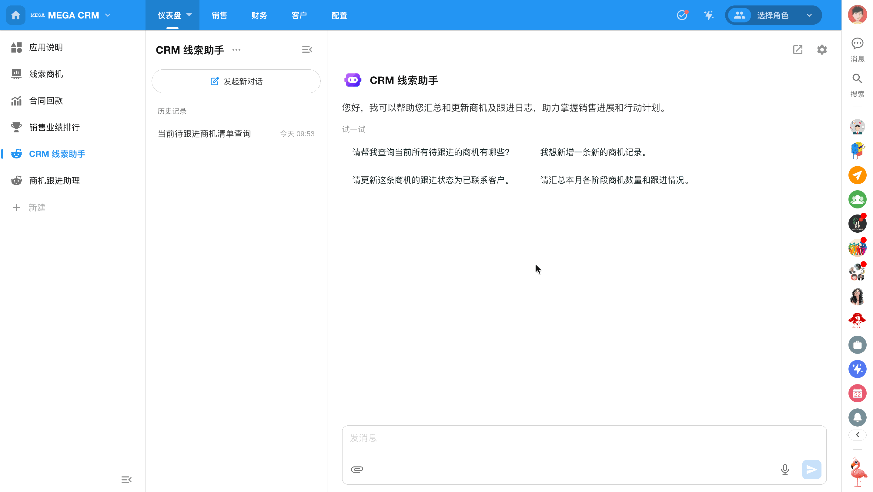 • 对话机器人:基于大语言模型的智能助手。可理解自然语言并即时调用工具完成查询、统计等任务,让你以对话驱动业务。