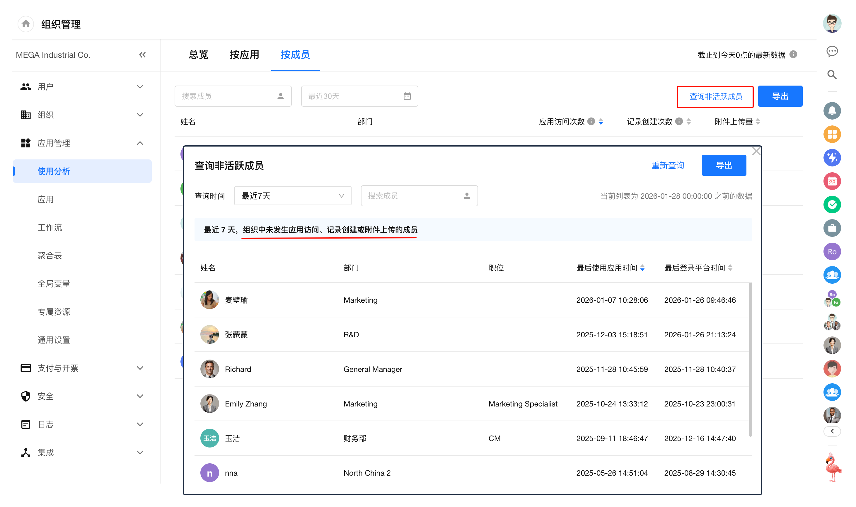 使用分析功能可以帮助管理者随时了解组织内应用的使用情况或成员的使用活跃度等多种指标,主要分两种:
