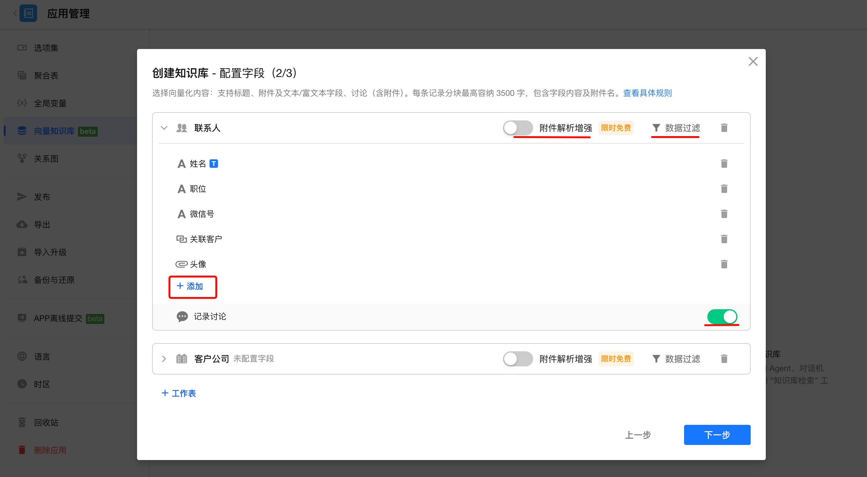 记录讨论: 开启后,记录下的讨论消息及附件也将纳入向量化范围,补充业务上下文。