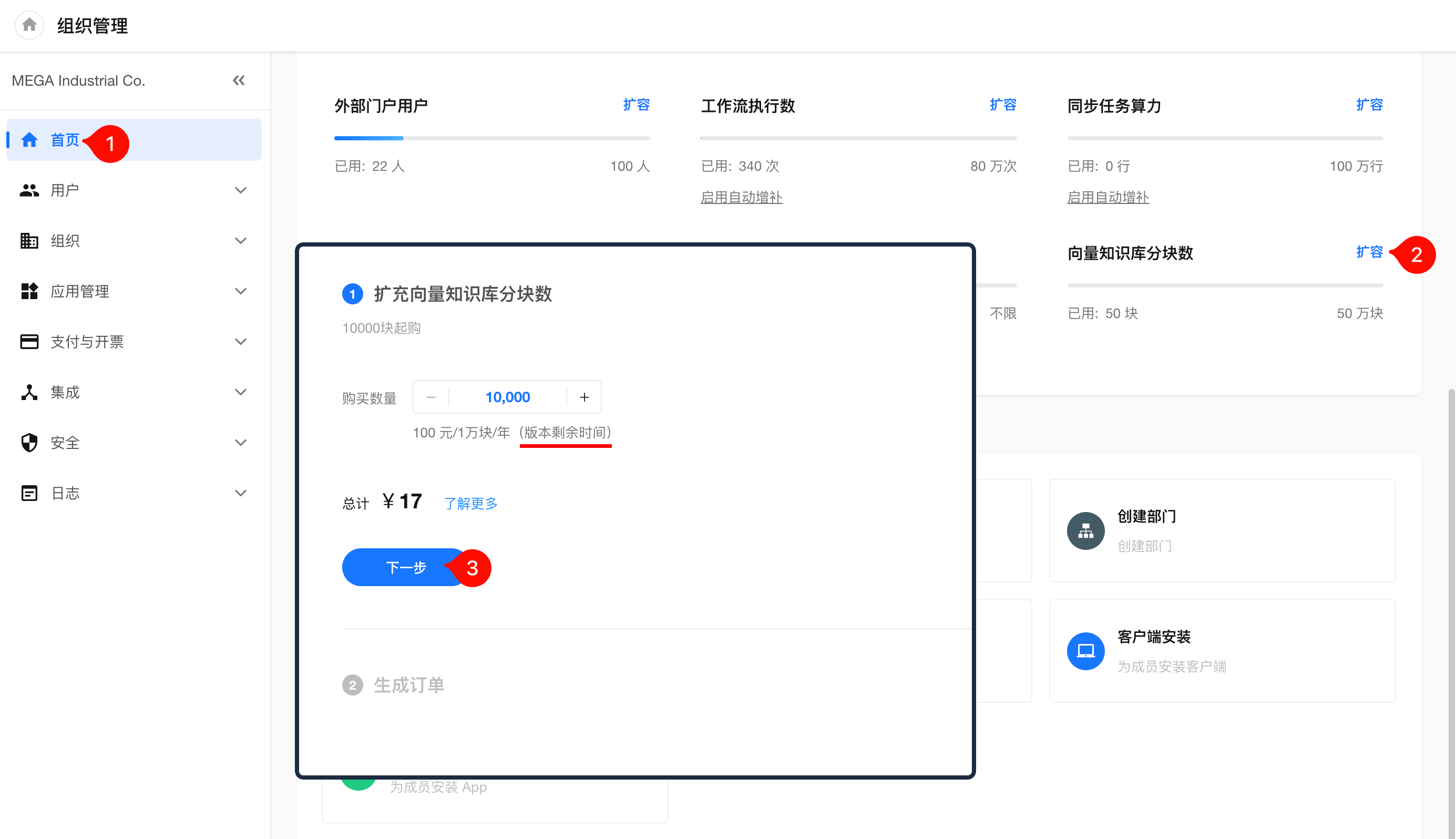 赠送配额用完后,可在组织管理后台购买分块扩充包。