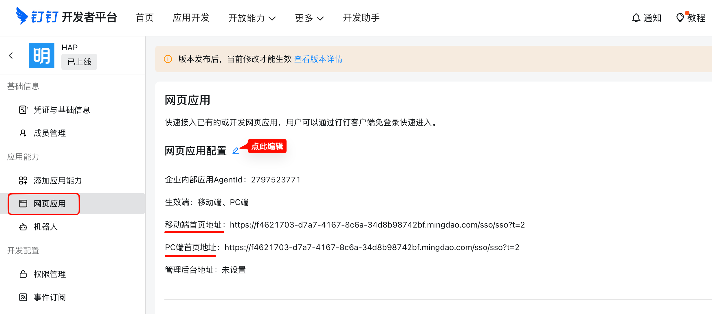 完成以上步骤后,钉钉的配置已经完成,接下来需要创建应用版本并发布应用,让成员可以使用,保存后直接发布生效。