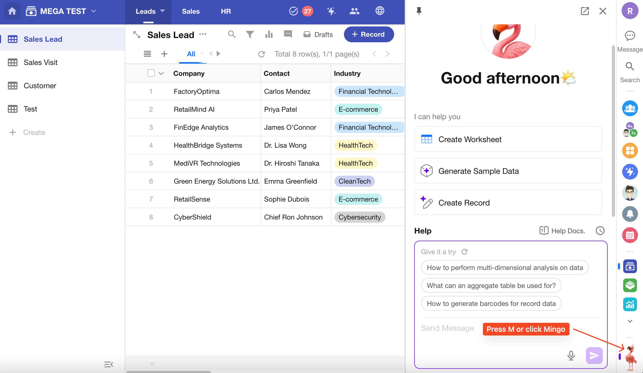 Mingo is your in-app AI assistant. While using the application, you can invoke Mingo anytime by pressing M to assist with app building and data entry.