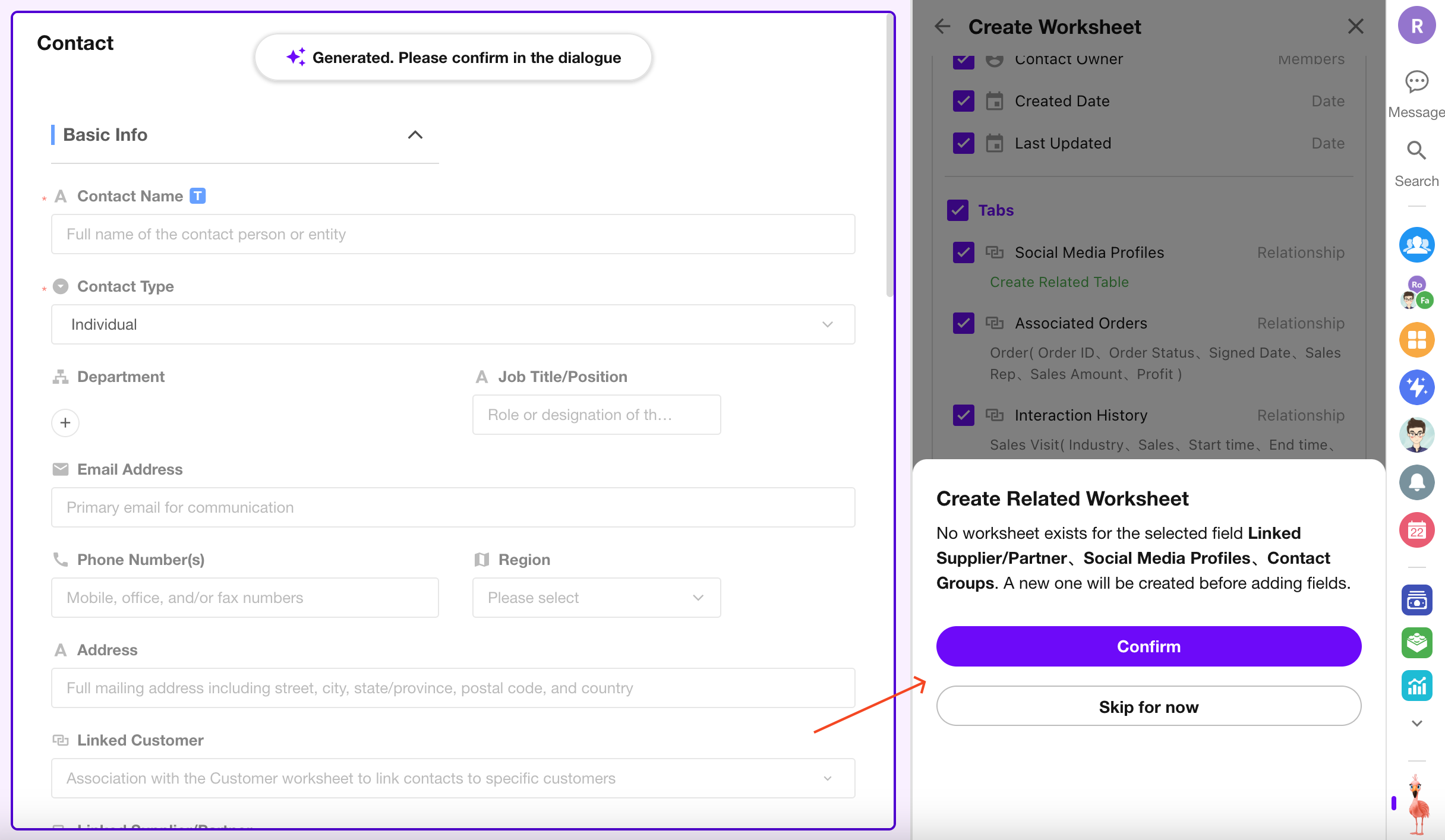 Mingo will generate a preview of the worksheet’s fields and relationships. Confirm to proceed, or refine the request via continued conversation with Mingo.