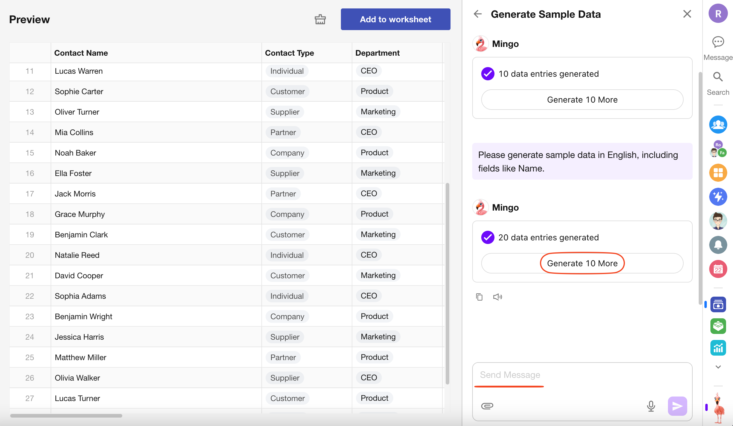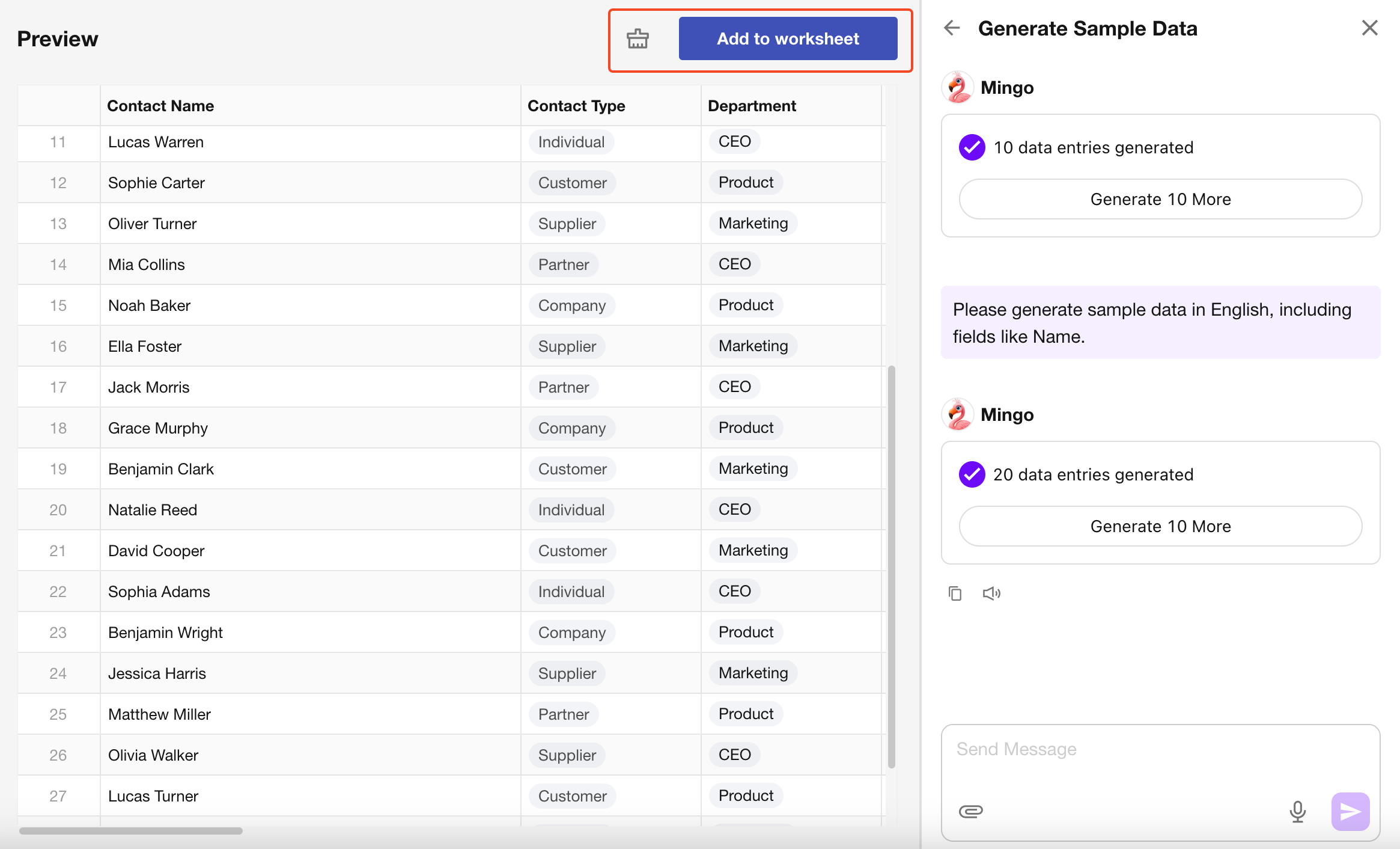 Mingo can generate high-quality sample data for worksheets to support testing and demonstration purposes.