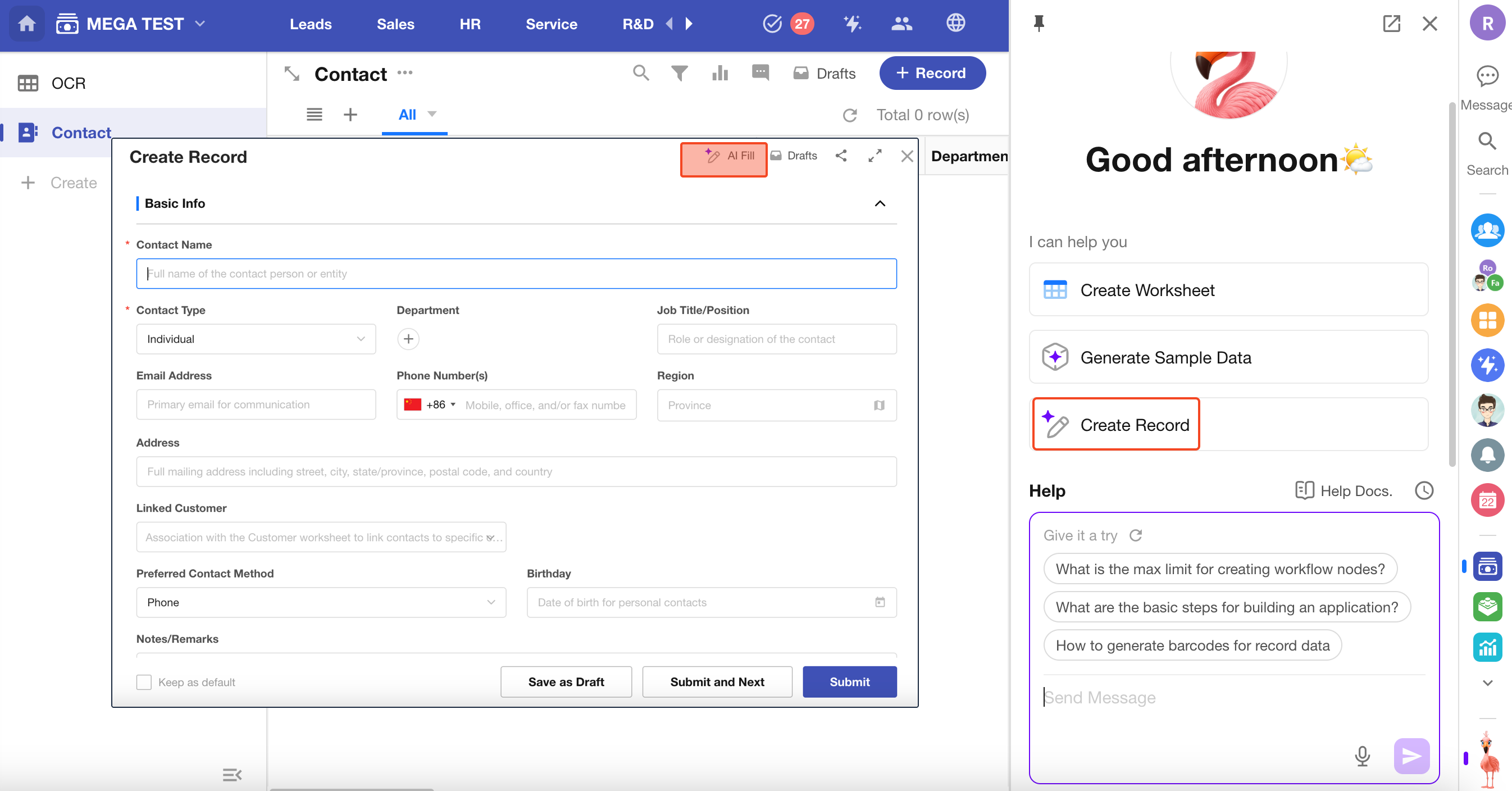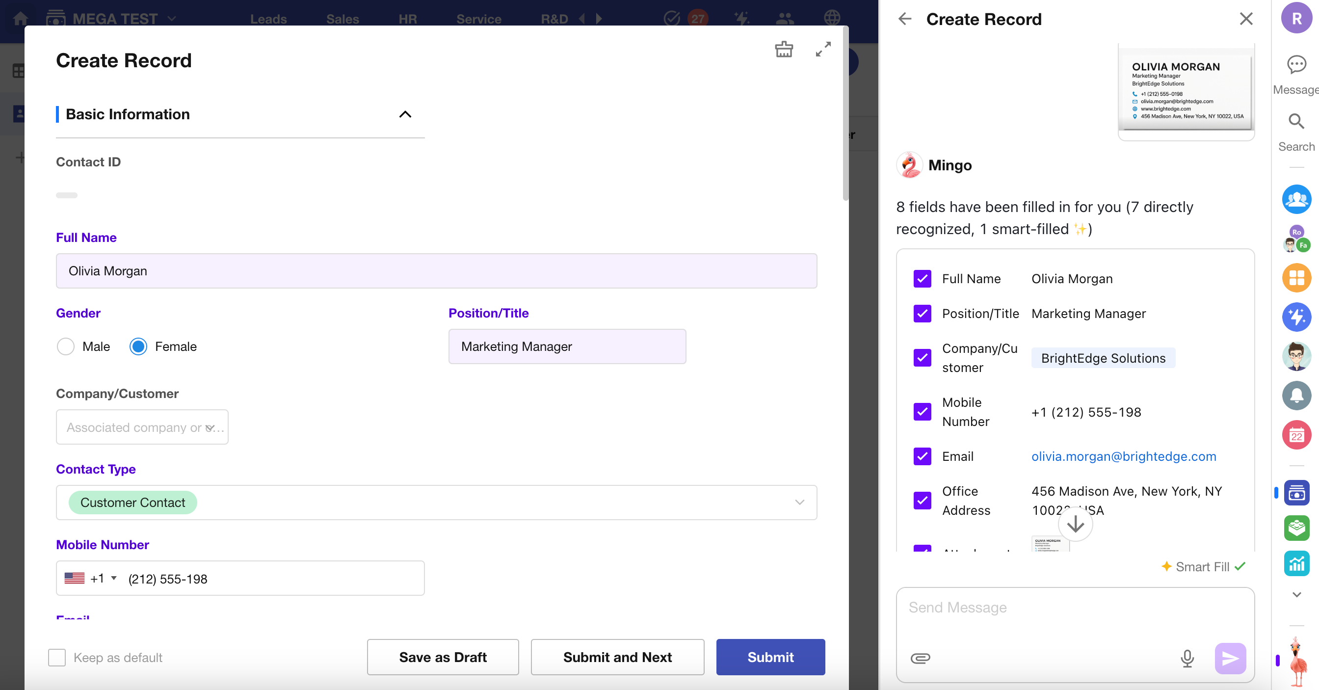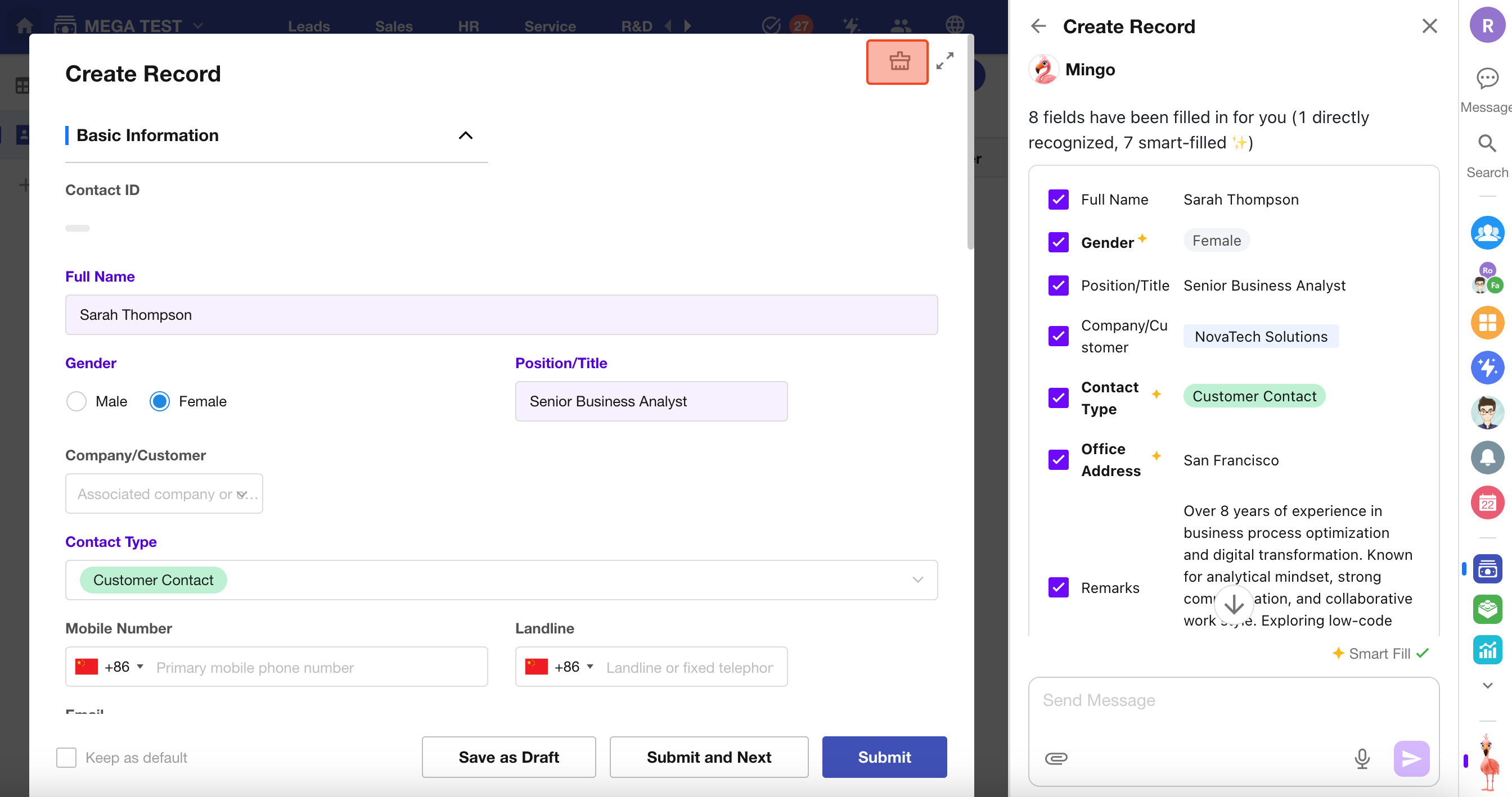 If Smart Fill is selected, Mingo will intelligently interpret your input and optionally search the web to fill in as many relevant fields as possible. Fields filled by AI will be marked with a “✨” icon.