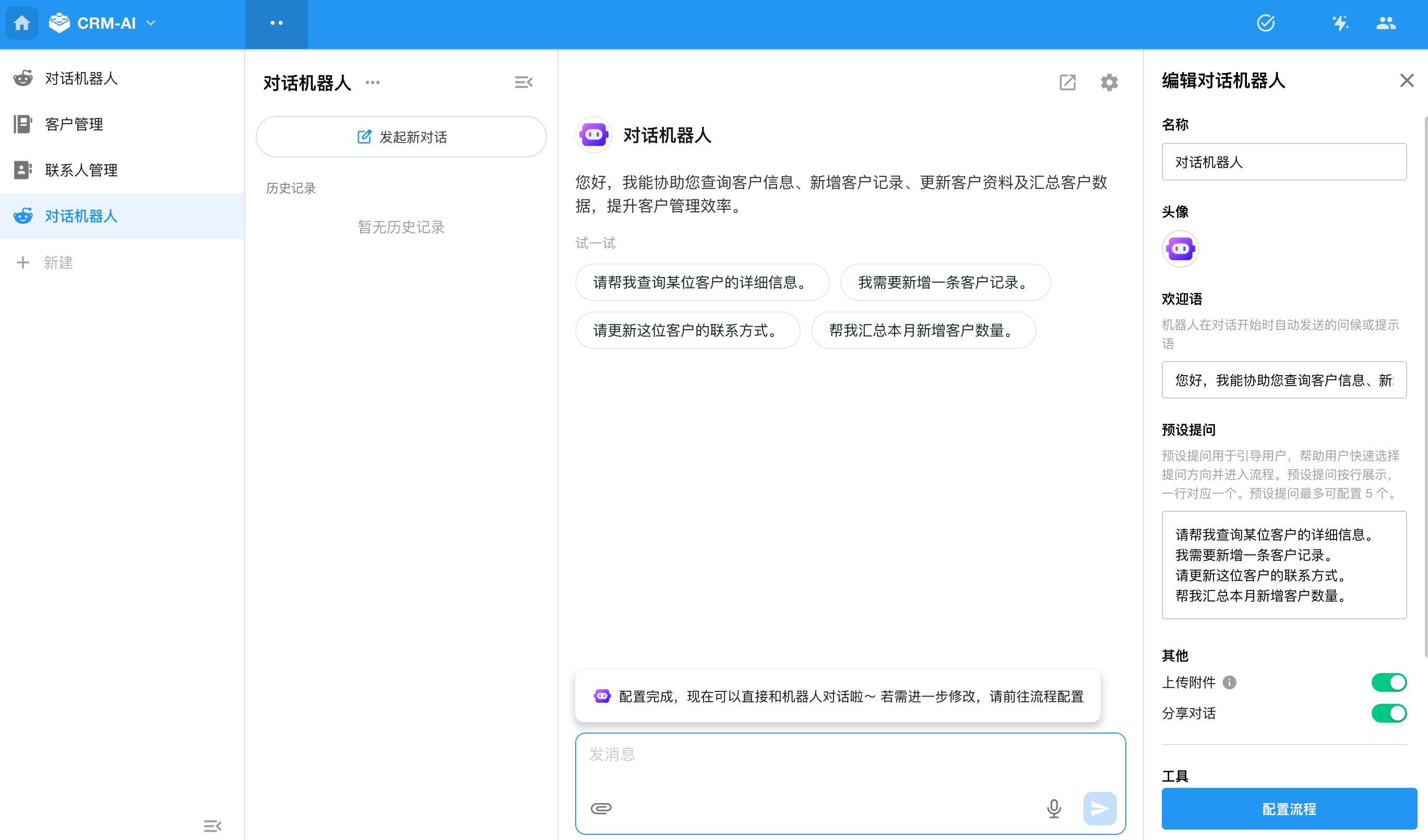 点击“配置流程”按钮,开始配置对话工作流。 后续修改流程,可点击对话窗口右上角的“设置”按钮 ,然后点击"配置流程" 进入流程配置页面。