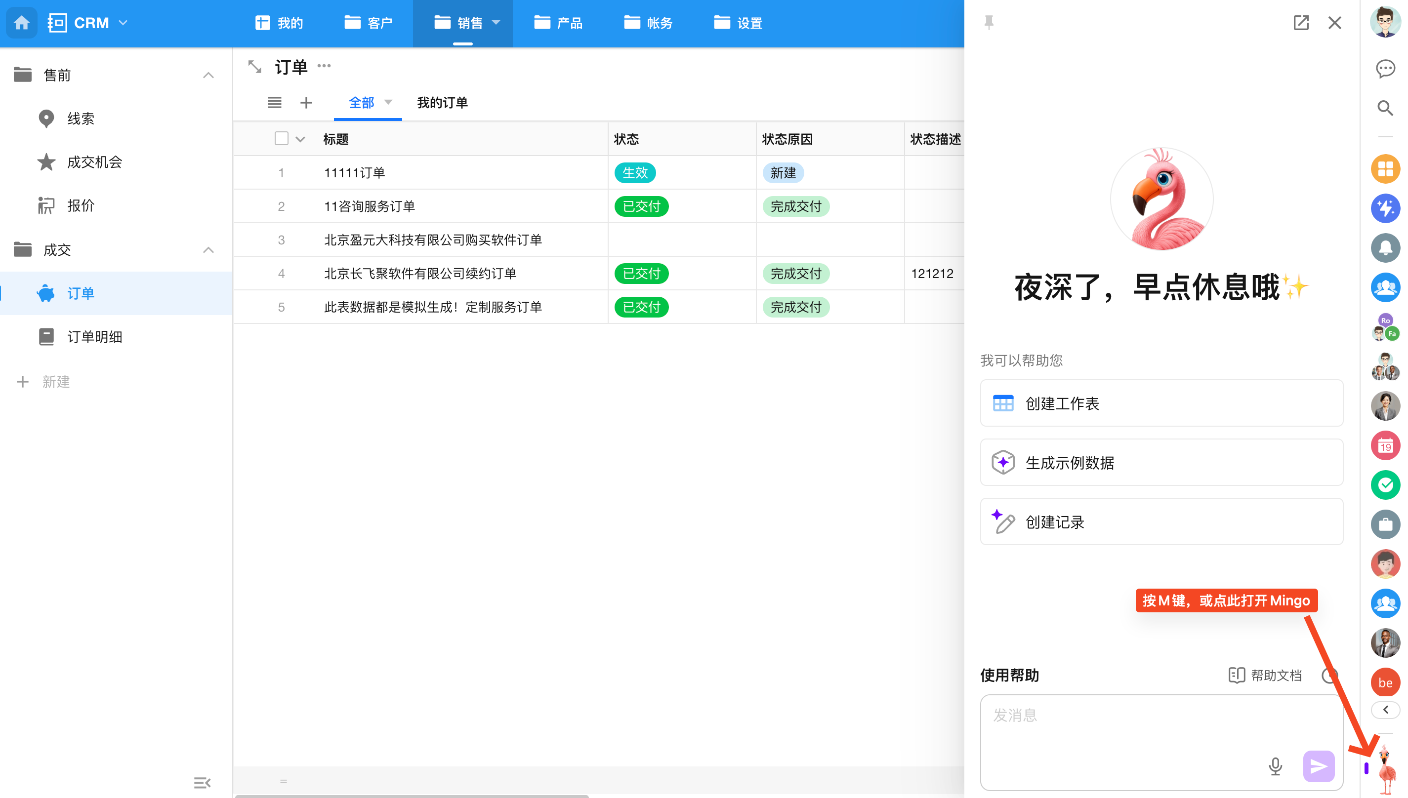 Mingo 是应用内的 AI 助手。在使用应用时,你可通过快捷键 M 随时呼出 Mingo,辅助搭建应用与录入数据。
