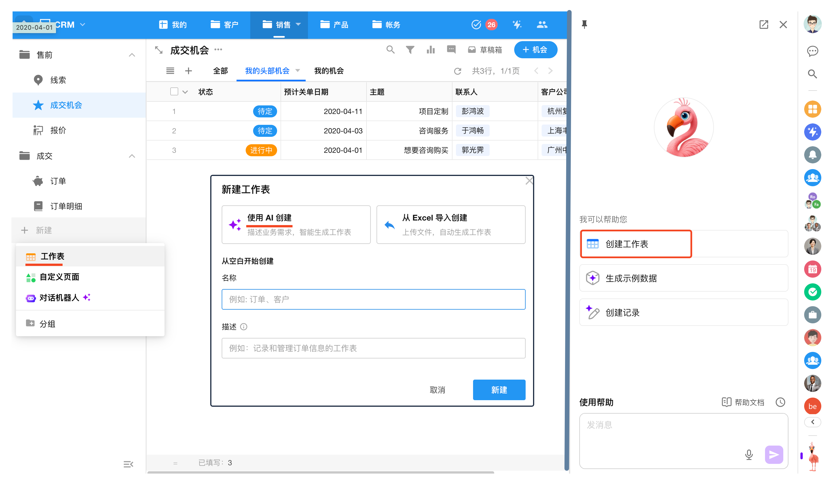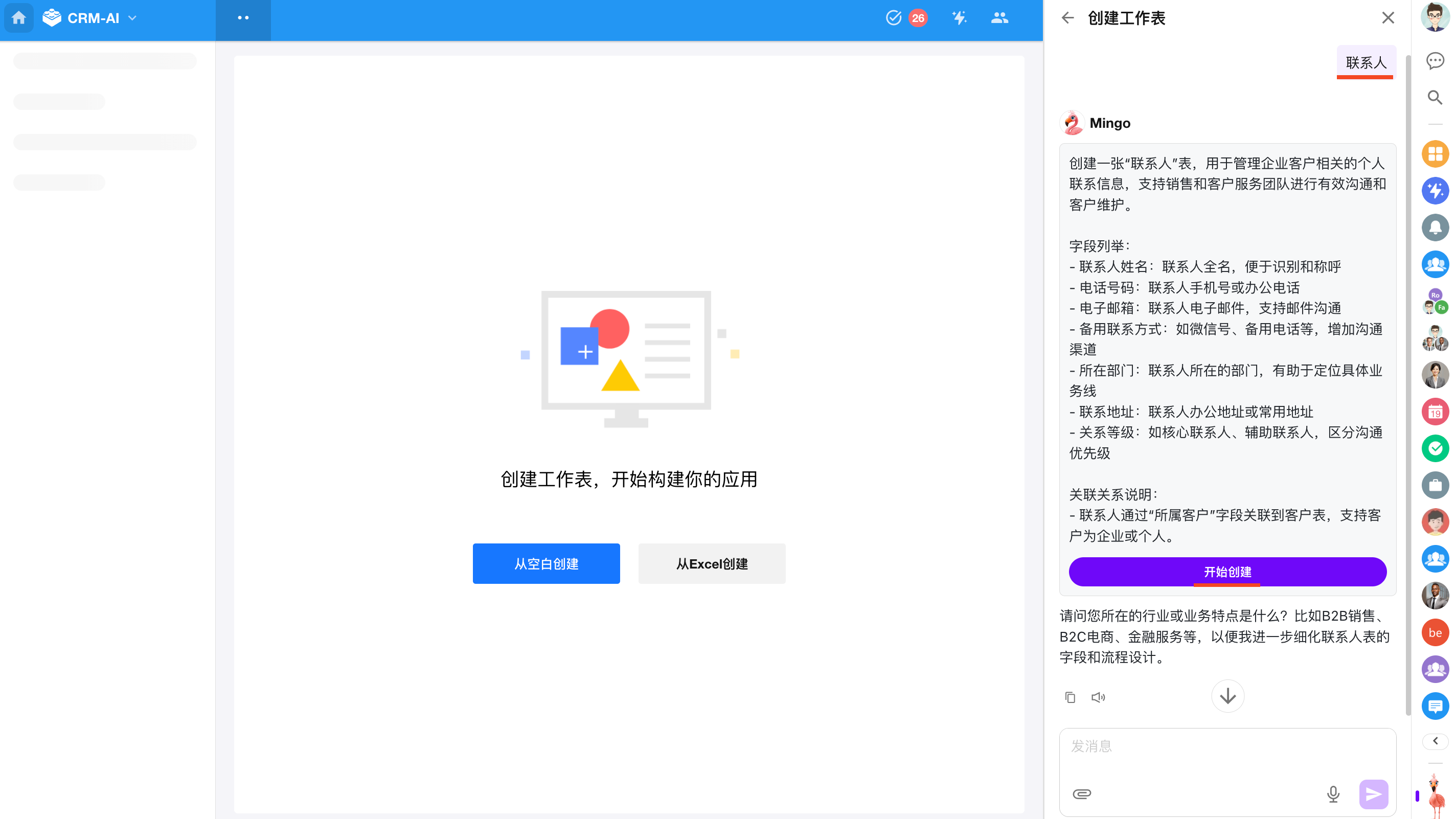 你也可在创建工作表时选择“AI 创建”,系统将自动打开 Mingo 开始创建。