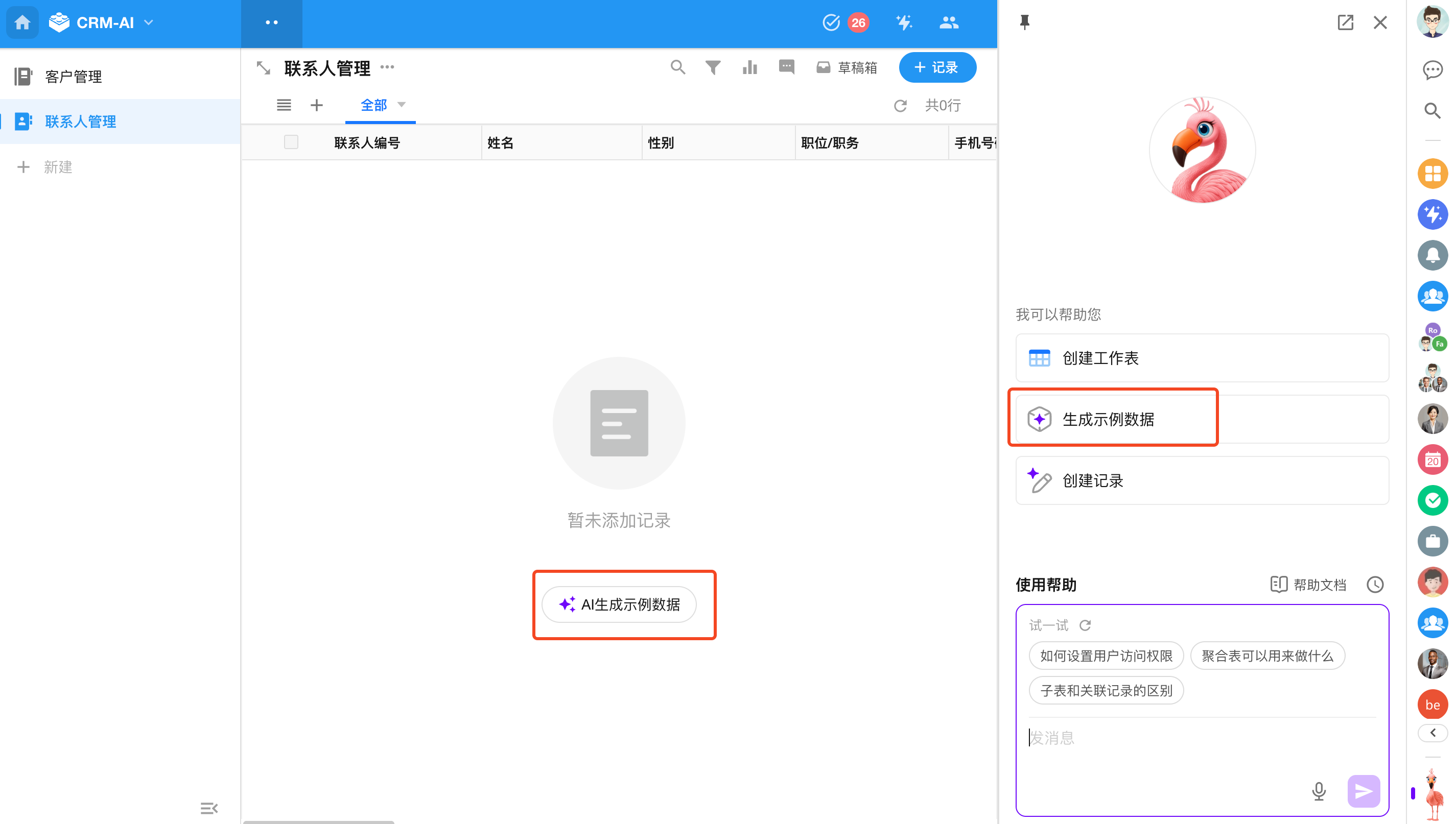 在任一工作表下打开 Mingo,点击“生成示例数据”。 当前视图无数据时,页面同样会显示“生成示例数据”。