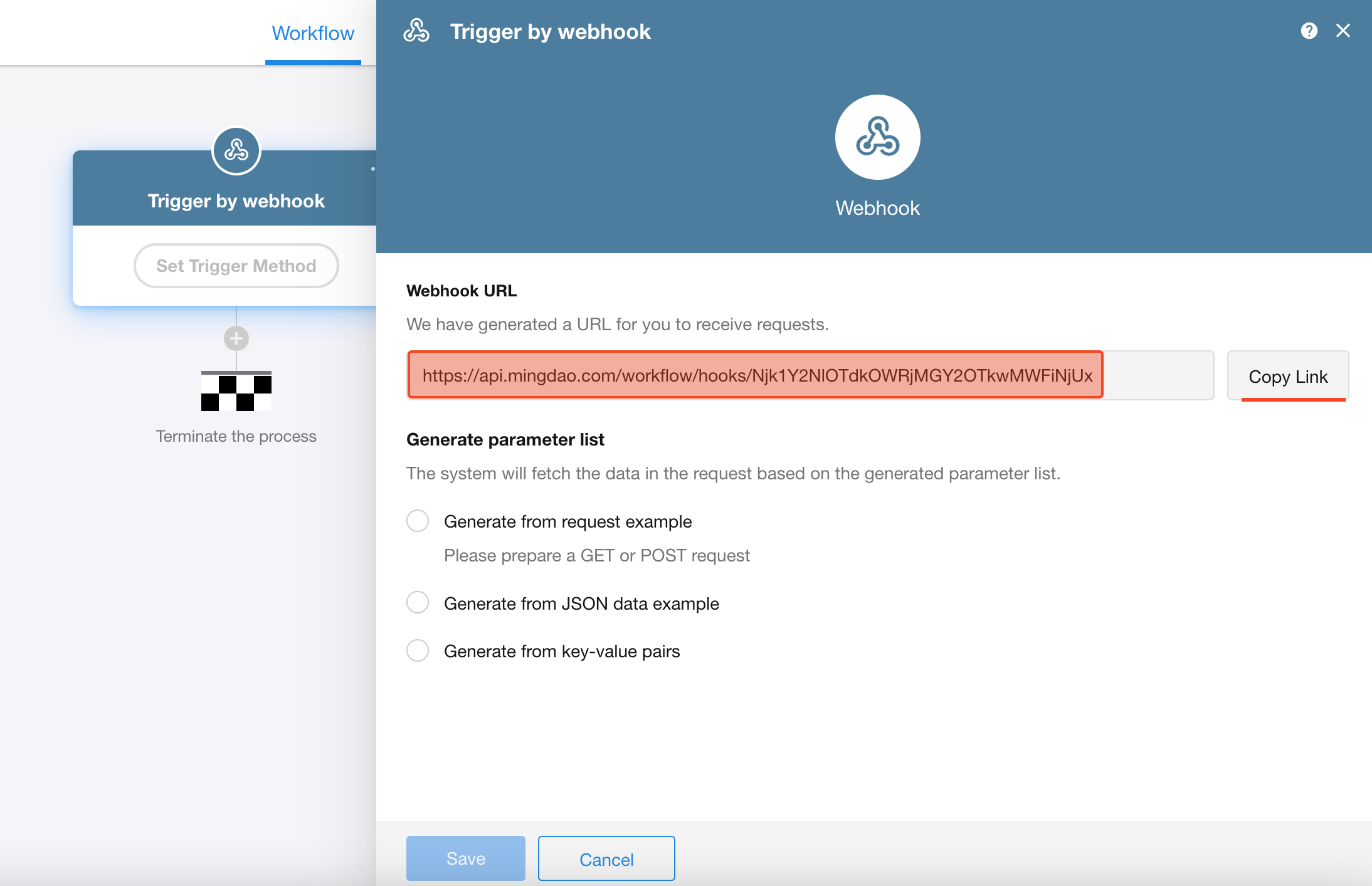 A unique Webhook URL will be generated for you. Simply send the data from your external system to this URL. Click to copy the link and paste it into your external system's configuration.