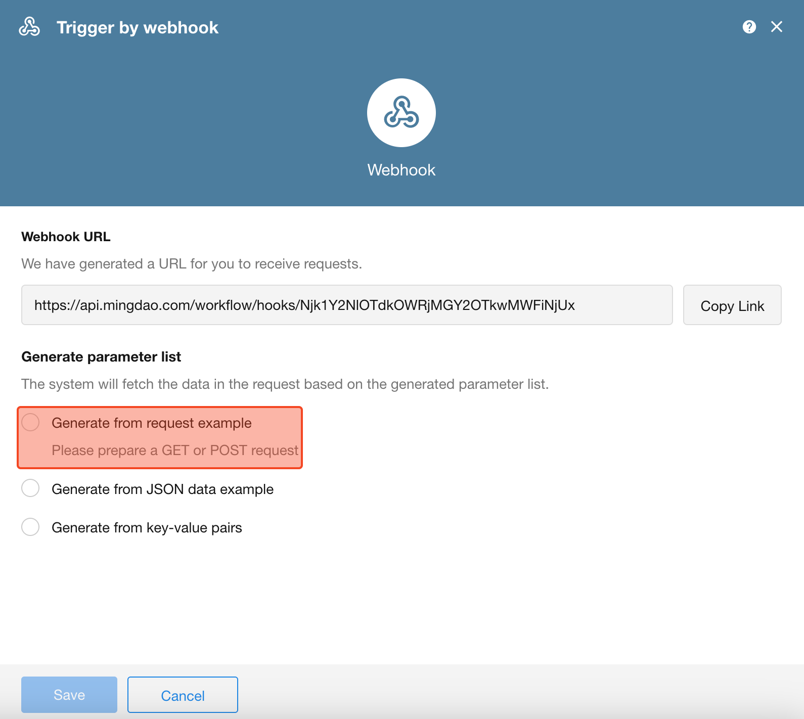 We recommend selecting "Generate from Sample Request". After that, you need to send a test request to the Webhook URL from your external system within 3 minutes.