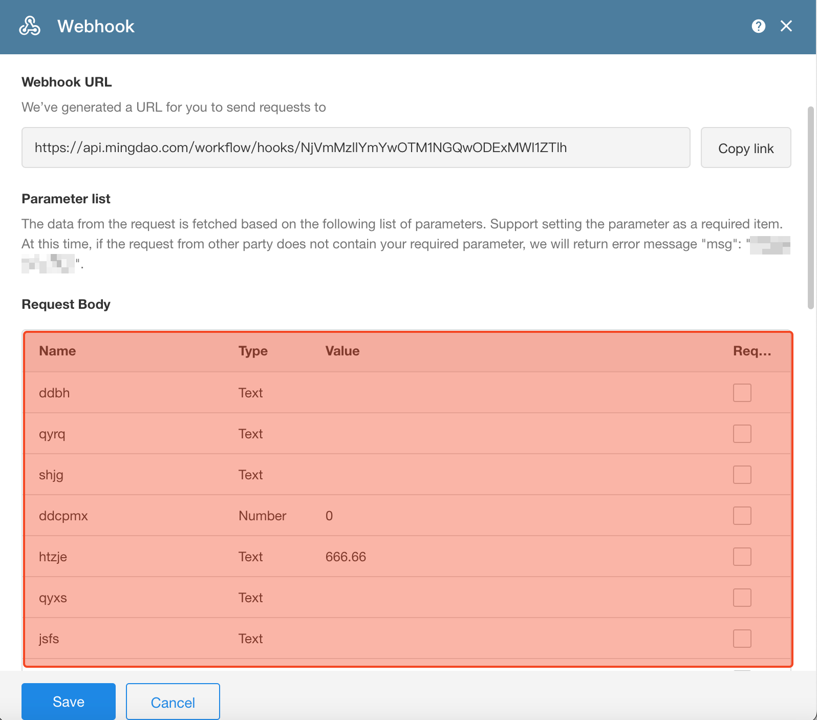 Once the platform receives the request, it will generate the corresponding parameter list. Confirm and save the configuration.