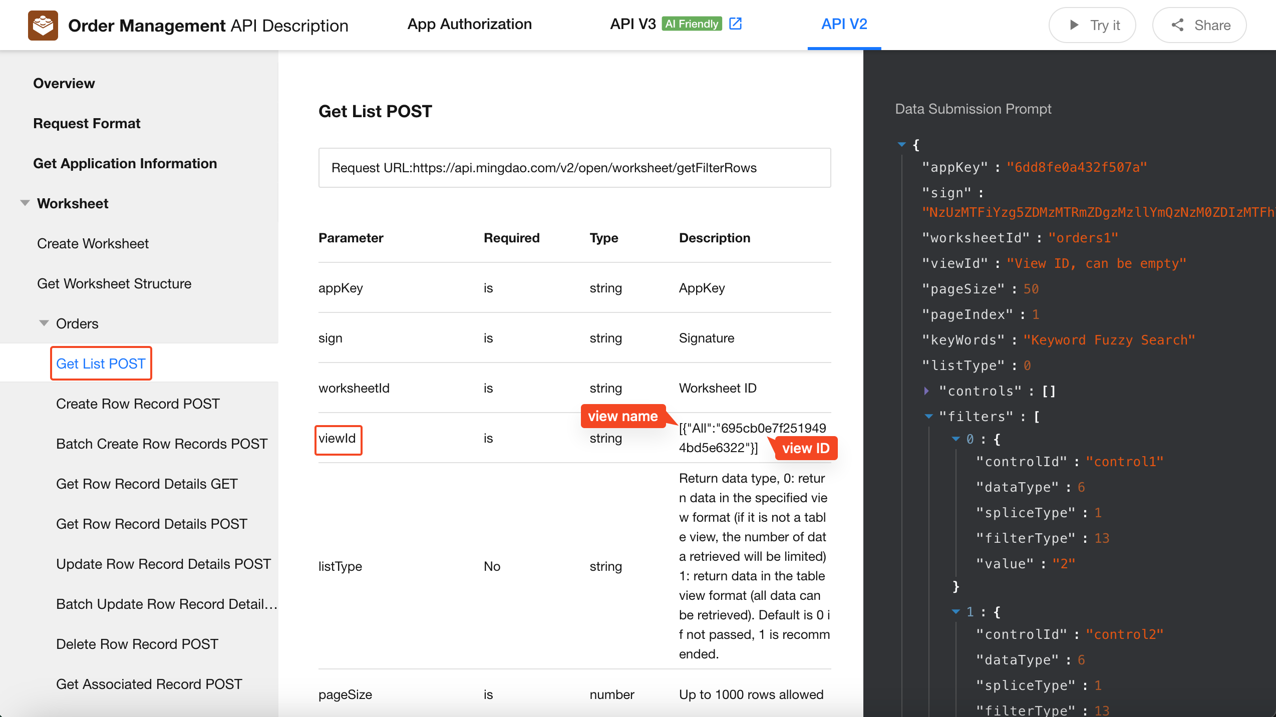 The parametersappkey,sign,worksheetid,controls, andcontrolIdcan be reused directly from the values provided on the right side of the API documentation interface.