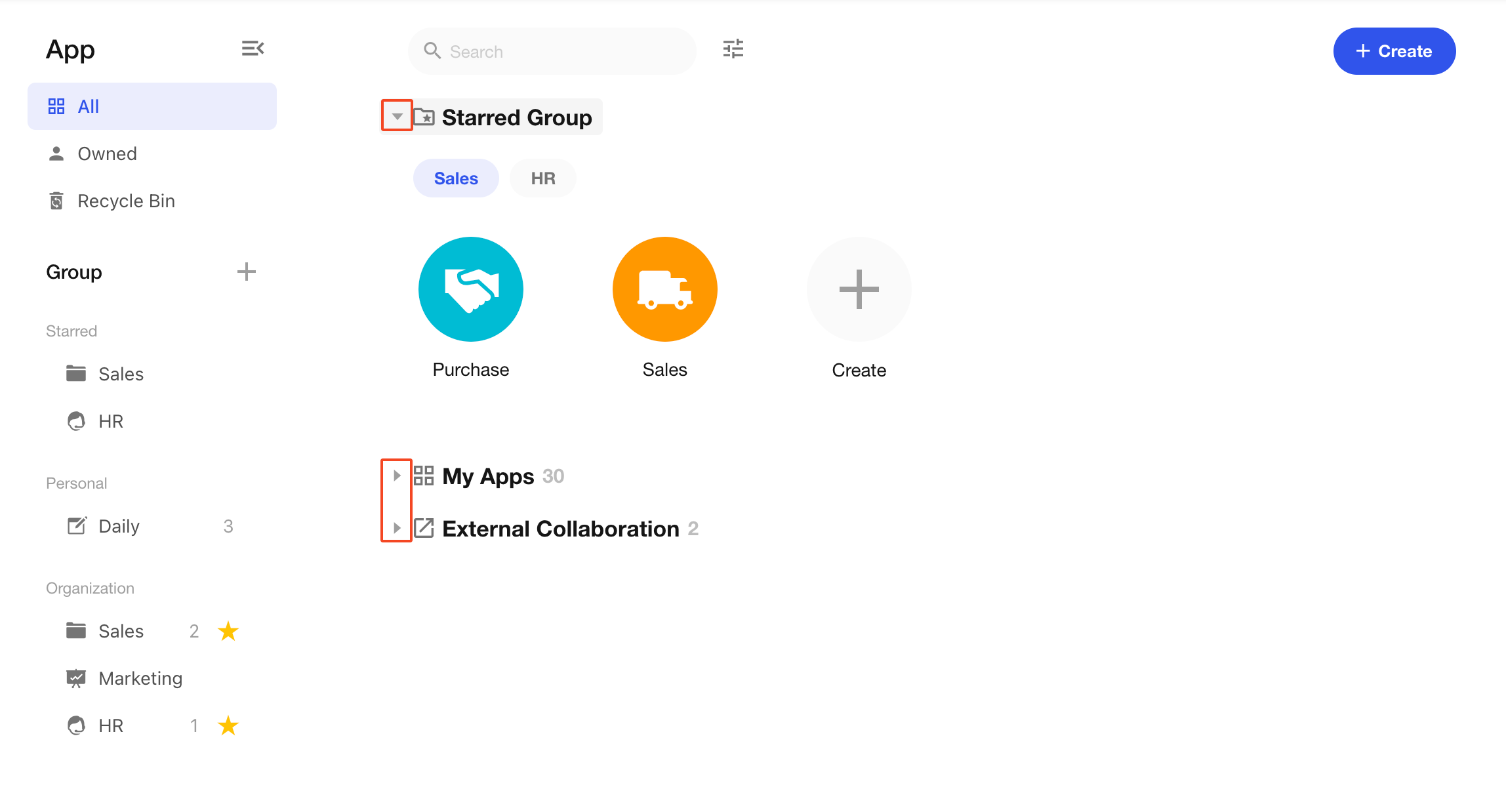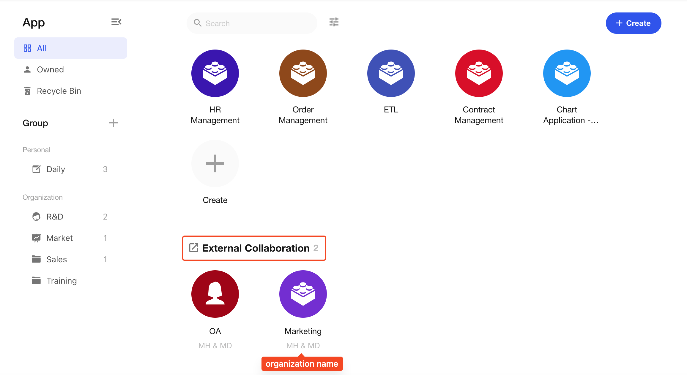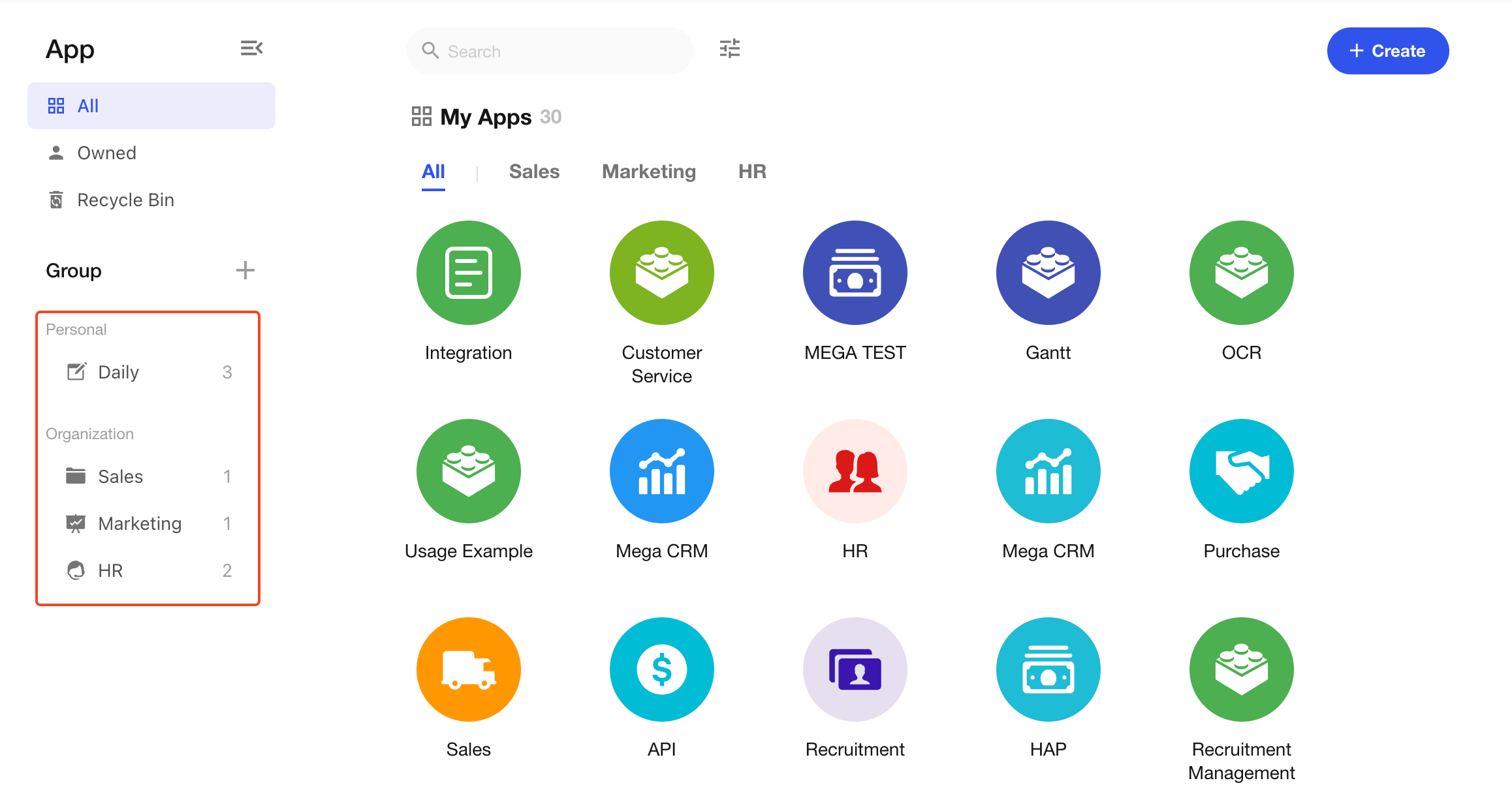 If you have many applications, you can organize them into custom groups—for example, by department, project, or business type—to quickly locate relevant applications.
