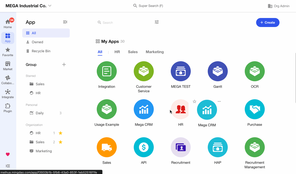 On the HAP application page, applications can be organized into groups (such as personal groups and organization groups). You can also quickly find target applications using search.