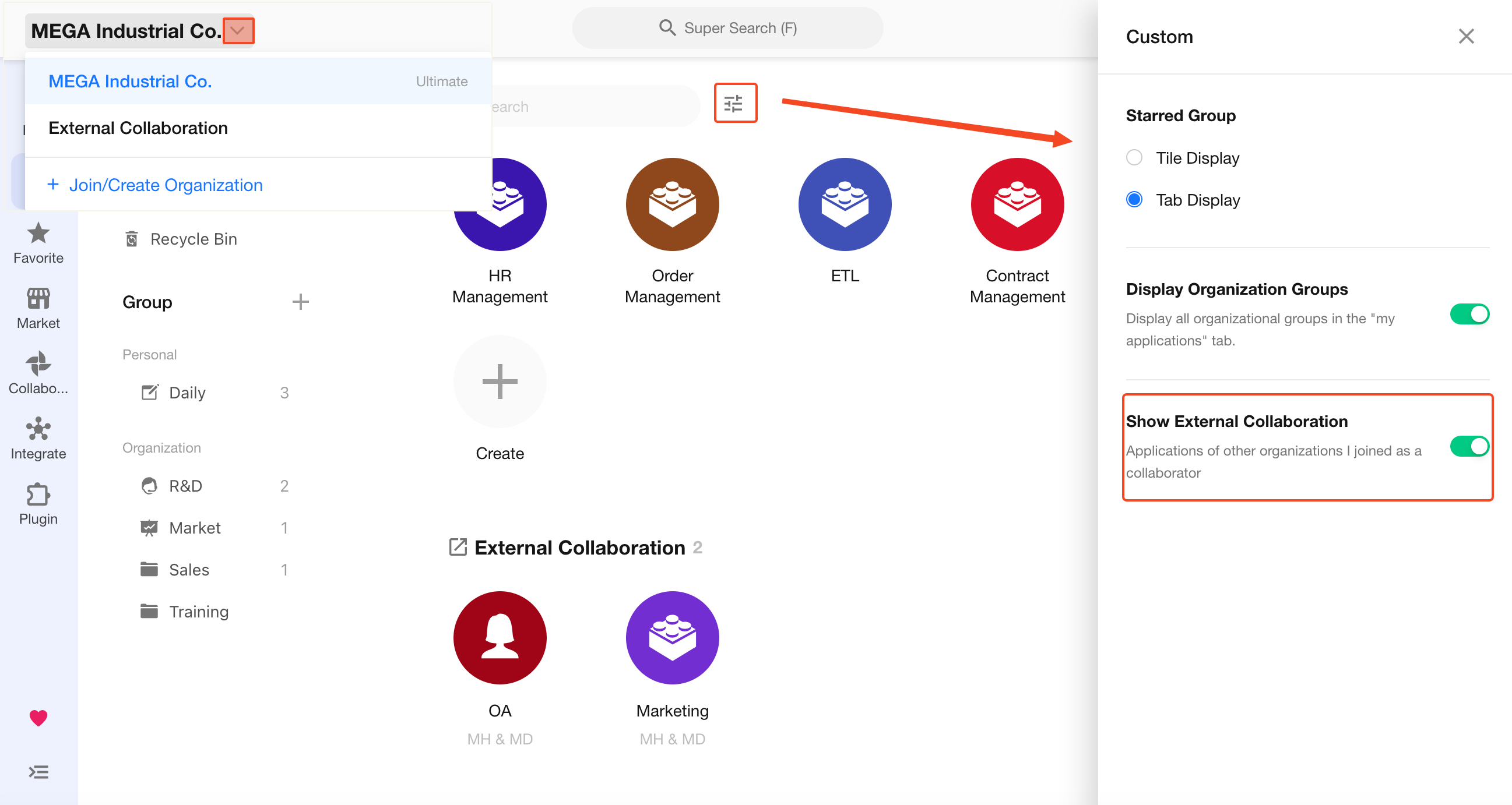 The External Collaboration group is displayed by default. You can hide it if needed. To view it, click the organization switch button in the top-left corner and select External Collaboration.