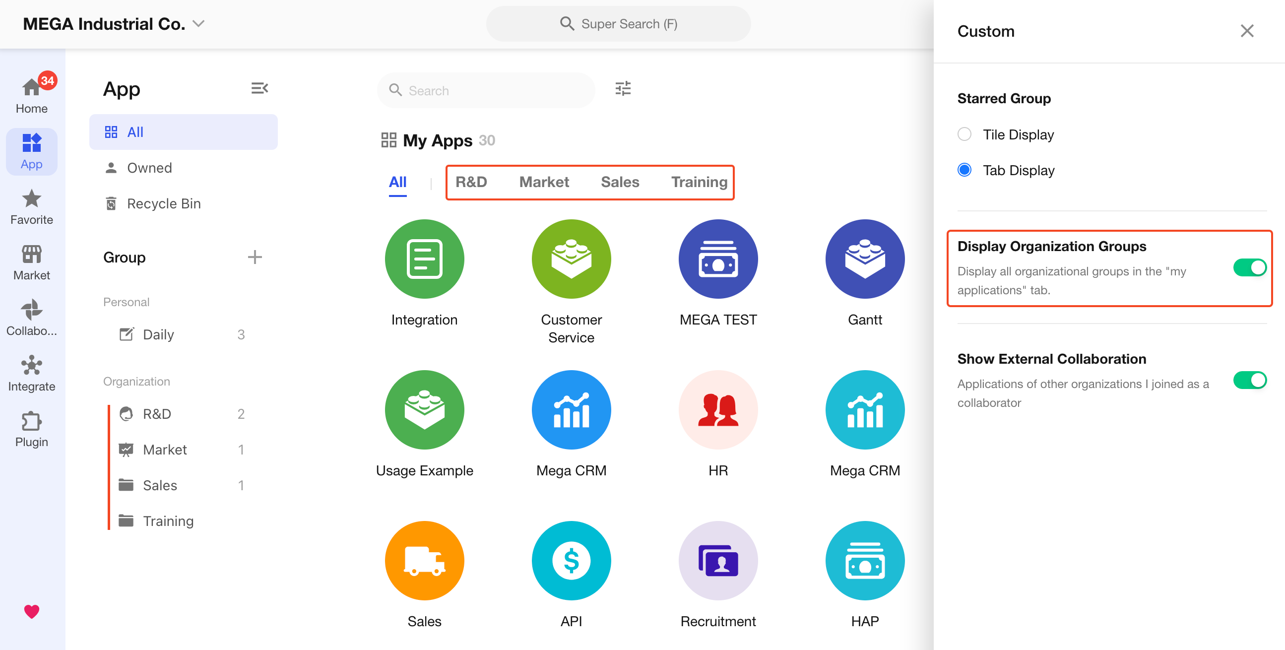 All applications you have joined within the current organization are displayed in a flat list. As shown below, this group displays all applications you have joined in the MEGA Industrial Co. organization.