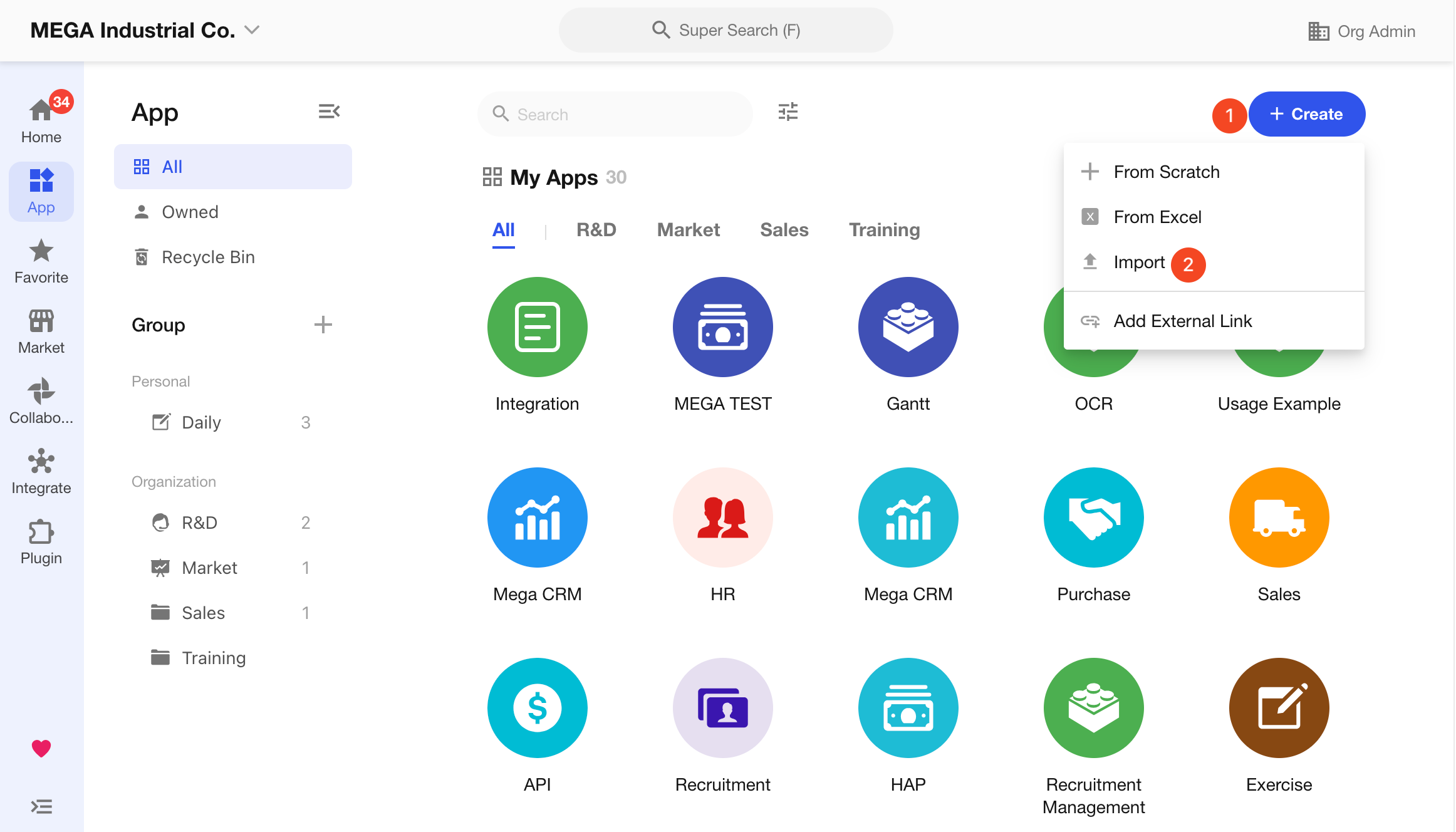 Path: Click the avatar → Org Admin > App Management > App, then click the top-right button and select Import App.
