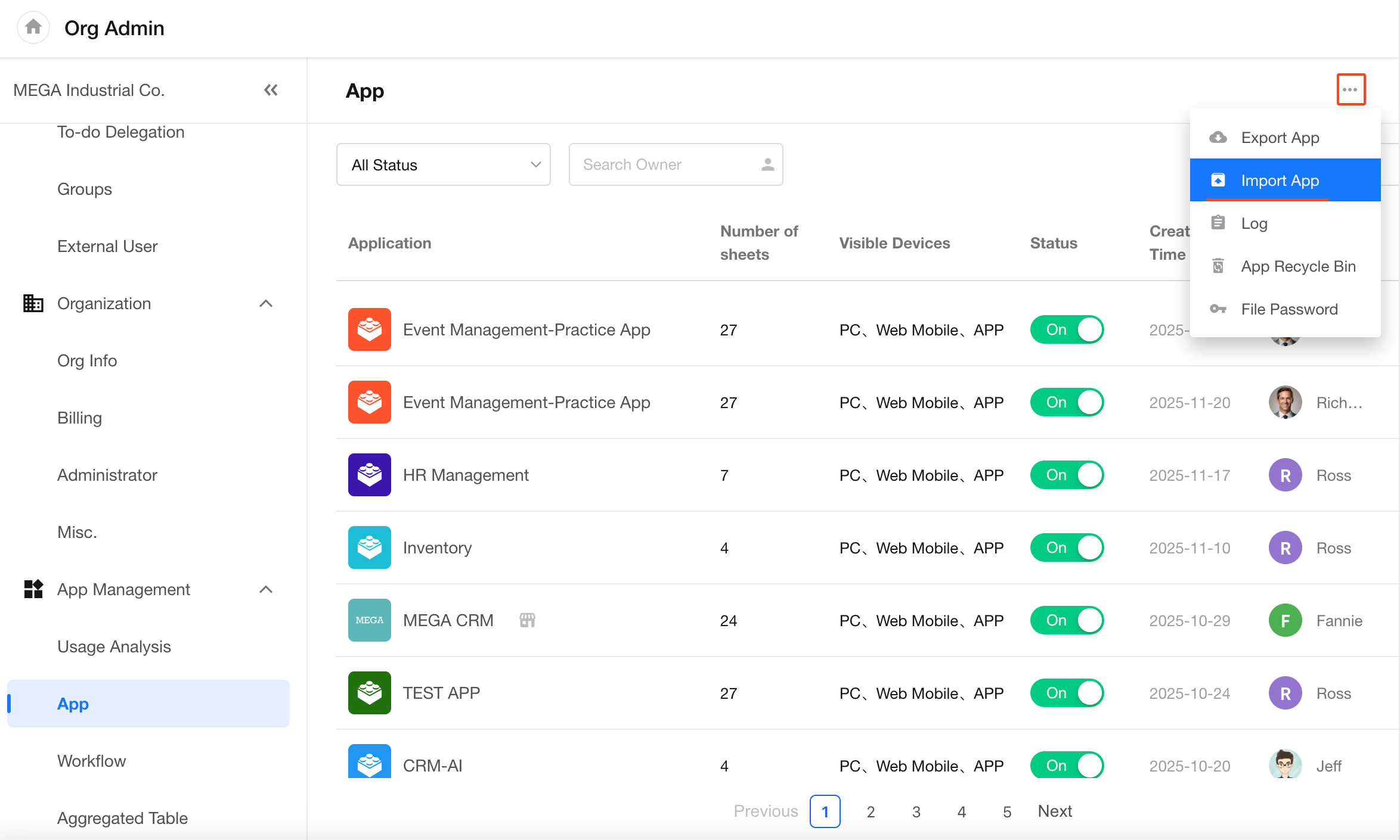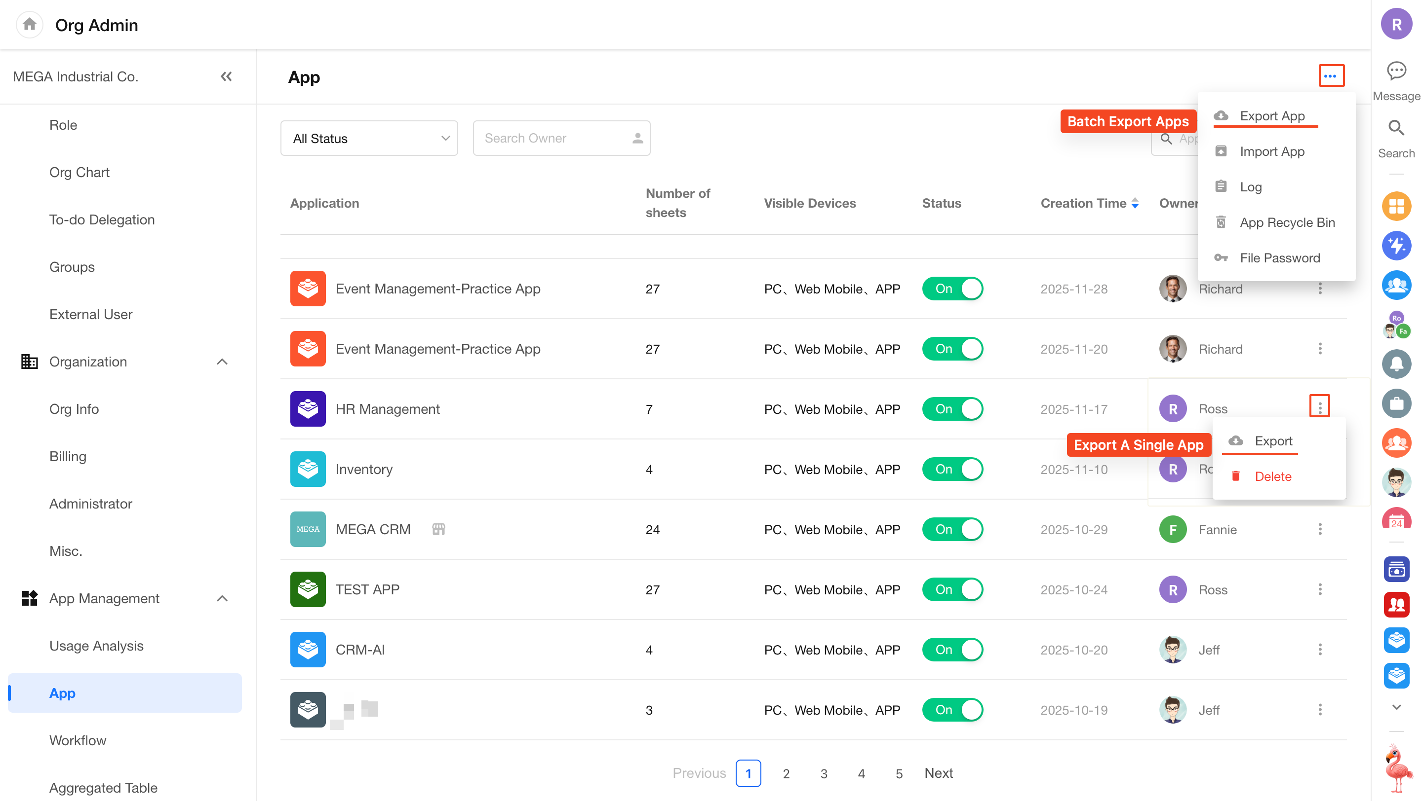 App admins can click their profile avatar and go to Org Admin > App Management > App, then click the More button in the top-right corner to export apps.