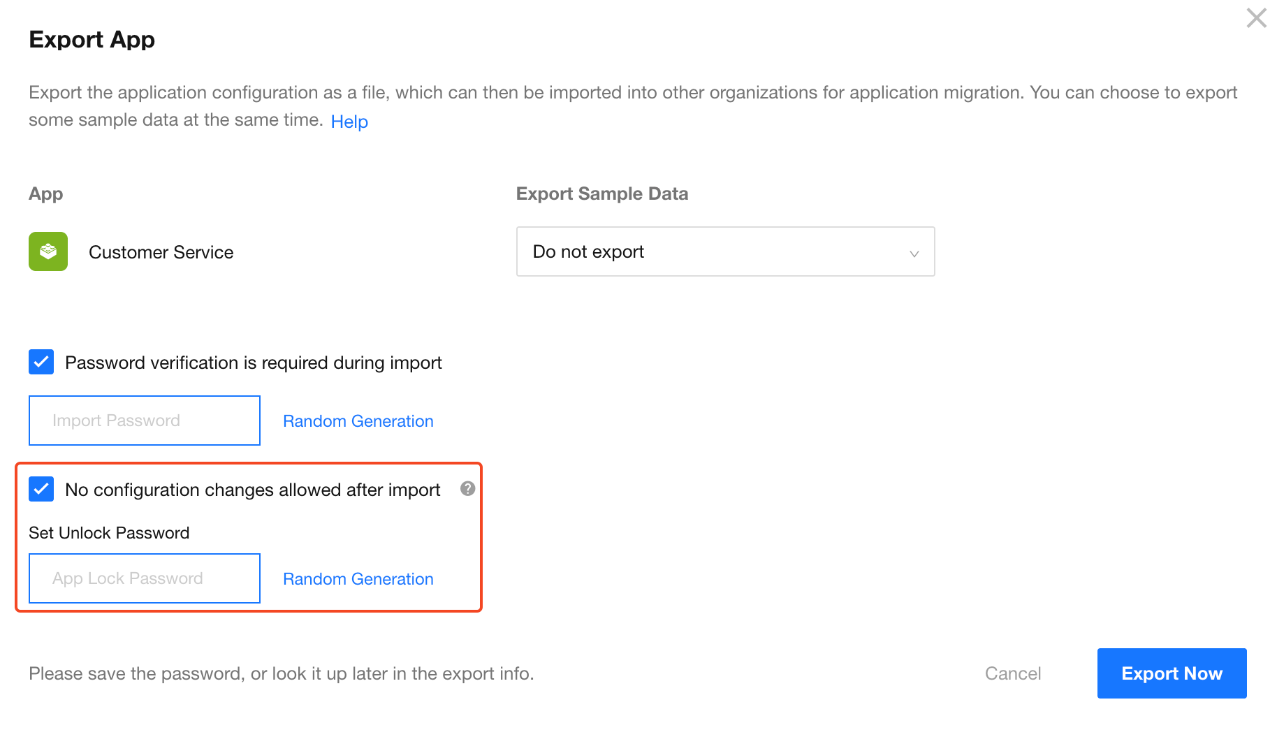 The password can be generated automatically or set manually. If forgotten, it can be viewed in the export record list.