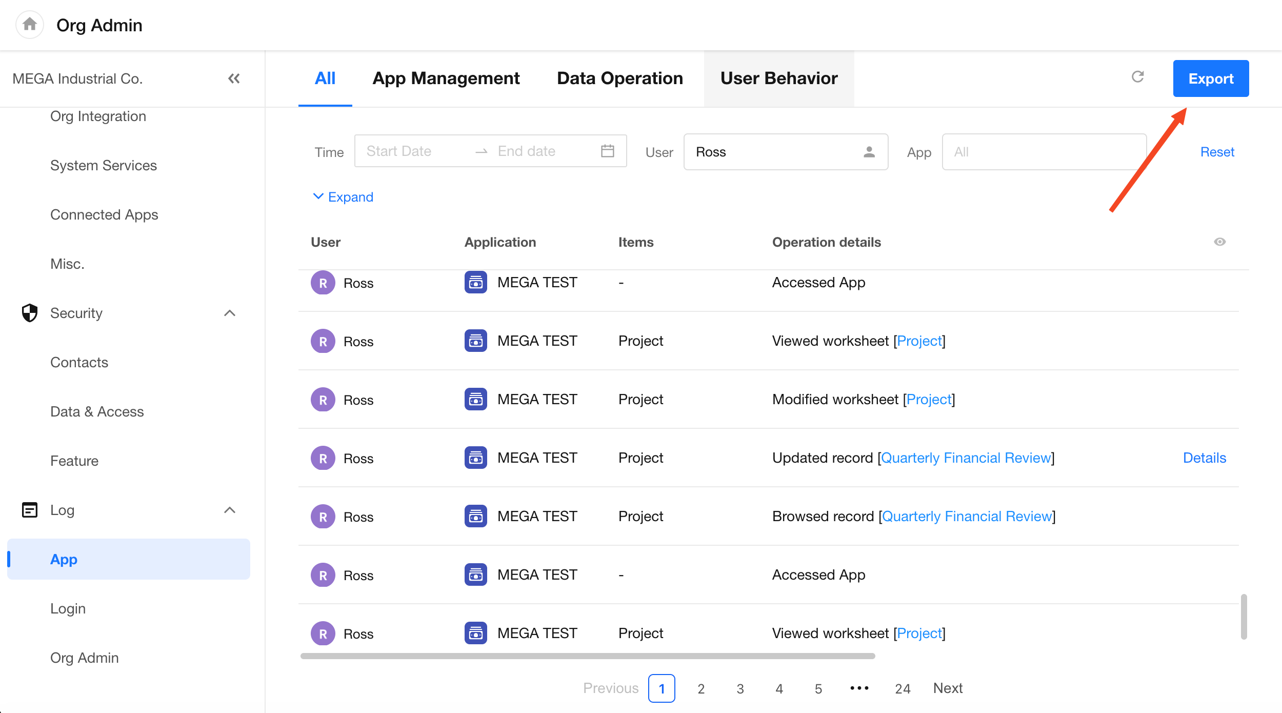 Organization administrators can view user activity logs in the Organization Management Console, including application logs and user login logs. These logs help administrators monitor and analyze system activity, and support troubleshooting and security investigations when issues occur.