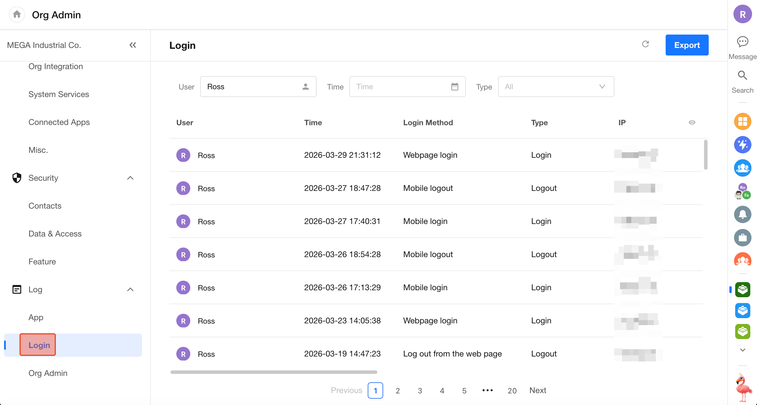 In the Organization Management Console, go to Log > Login to view login logs. You can use filters and customize displayed columns. Logs in the list can also be exported.