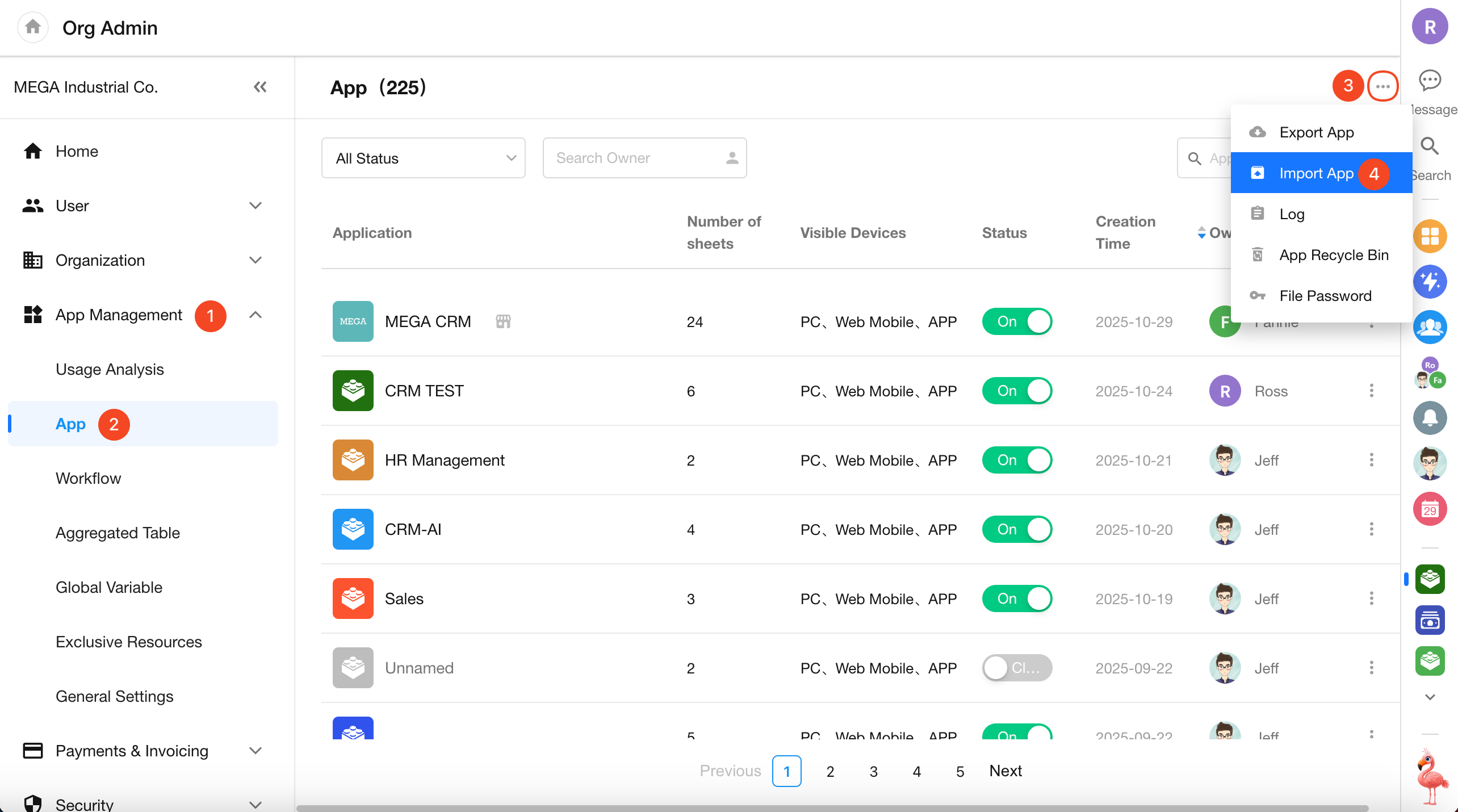 Navigate to [Org Admin] > [App Management] > [App], click the three-dot More button in the top-right corner, and select Import App.
