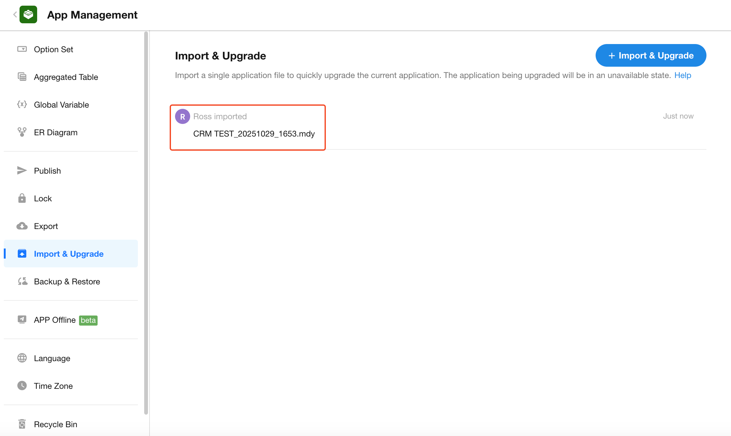 After the import is complete, an upgrade record will be displayed in the Application Import and Upgrade page.