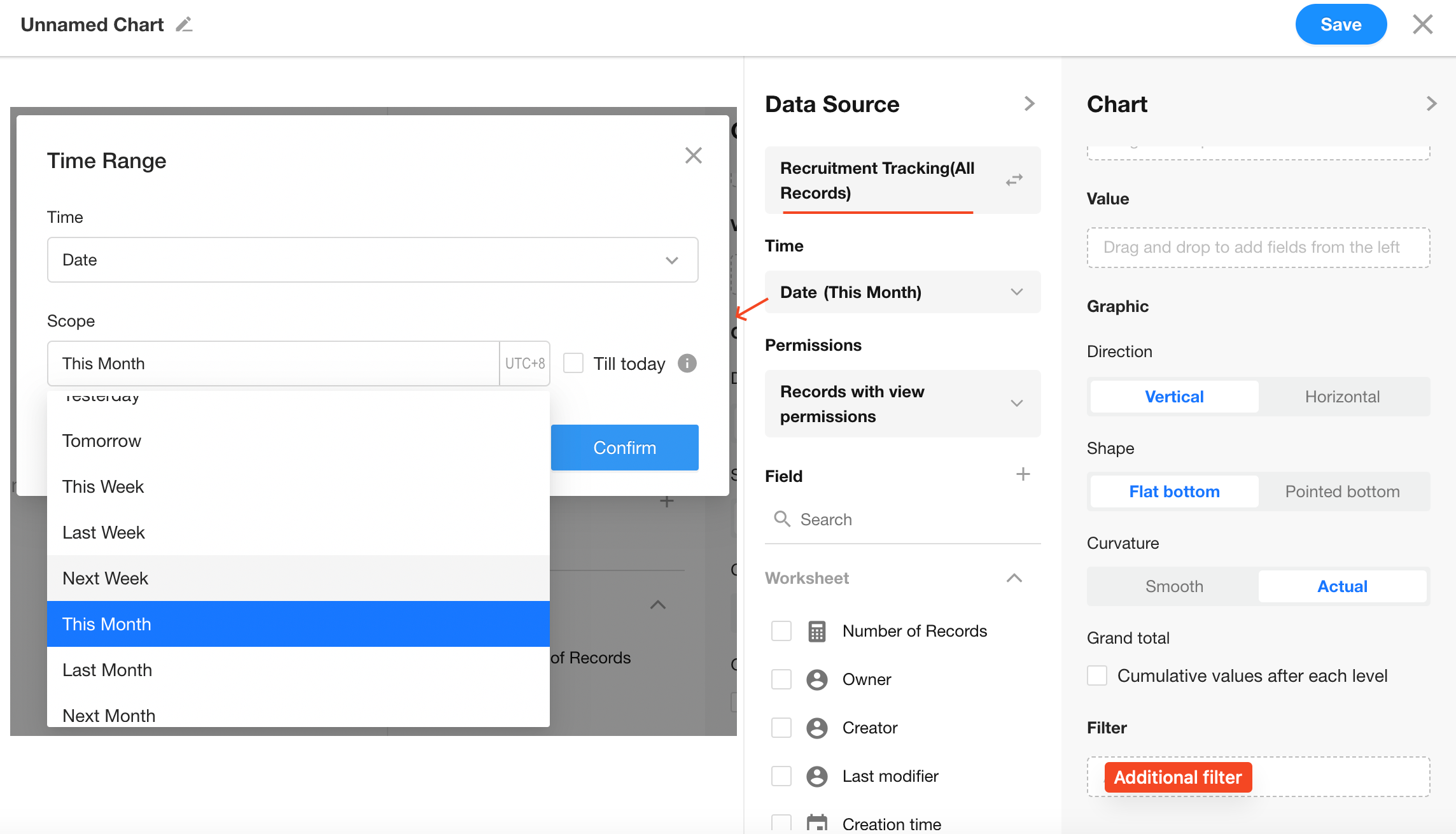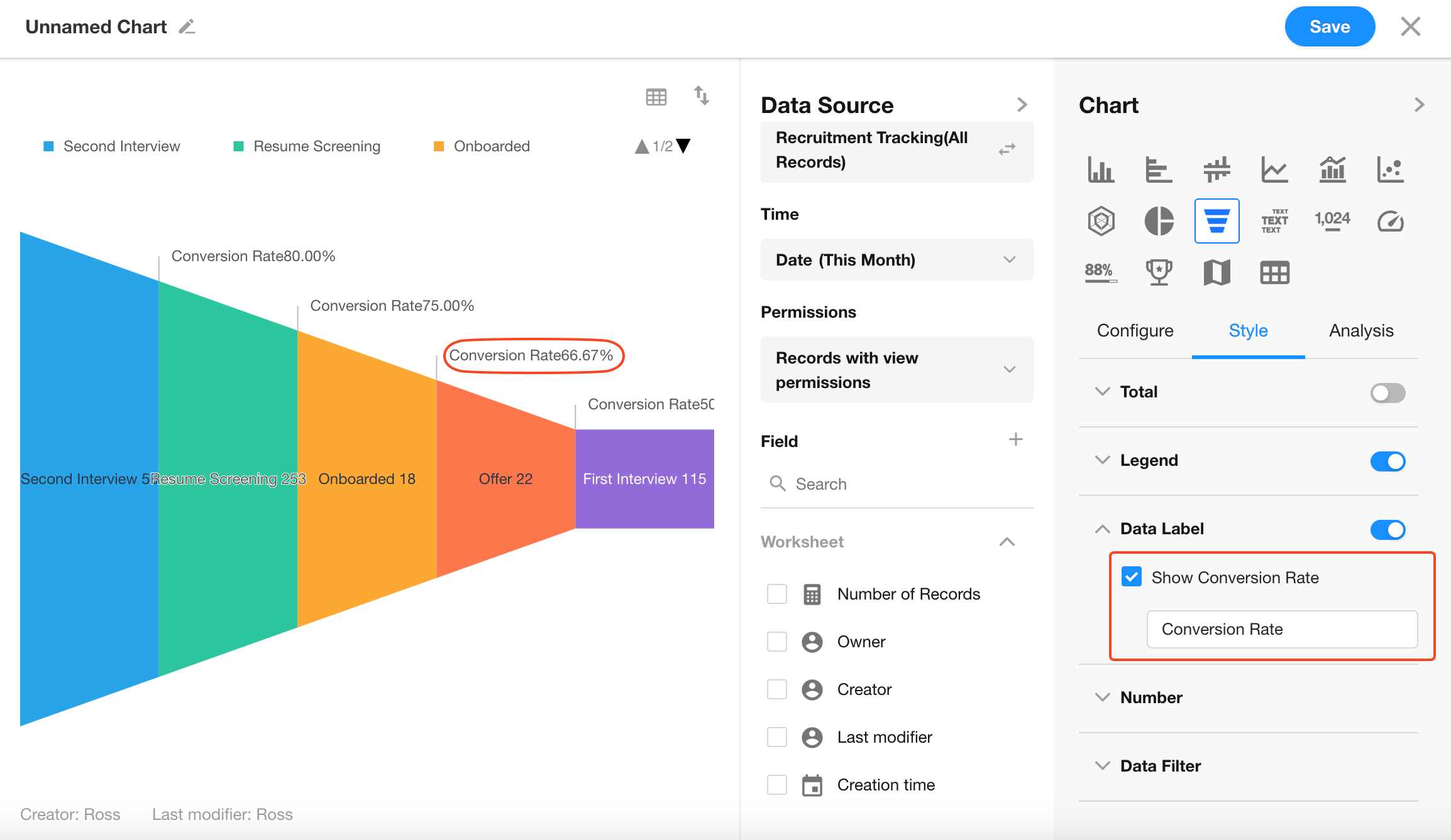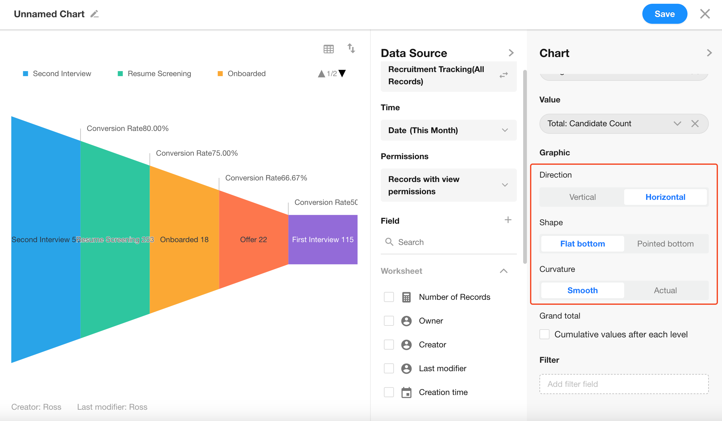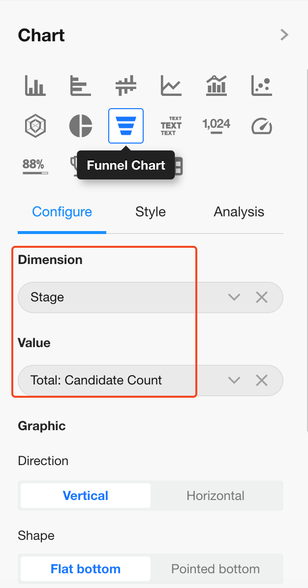 Value: Select a numeric field (e.g., number of records or a custom numeric field). The value determines the size of each stage in the funnel.