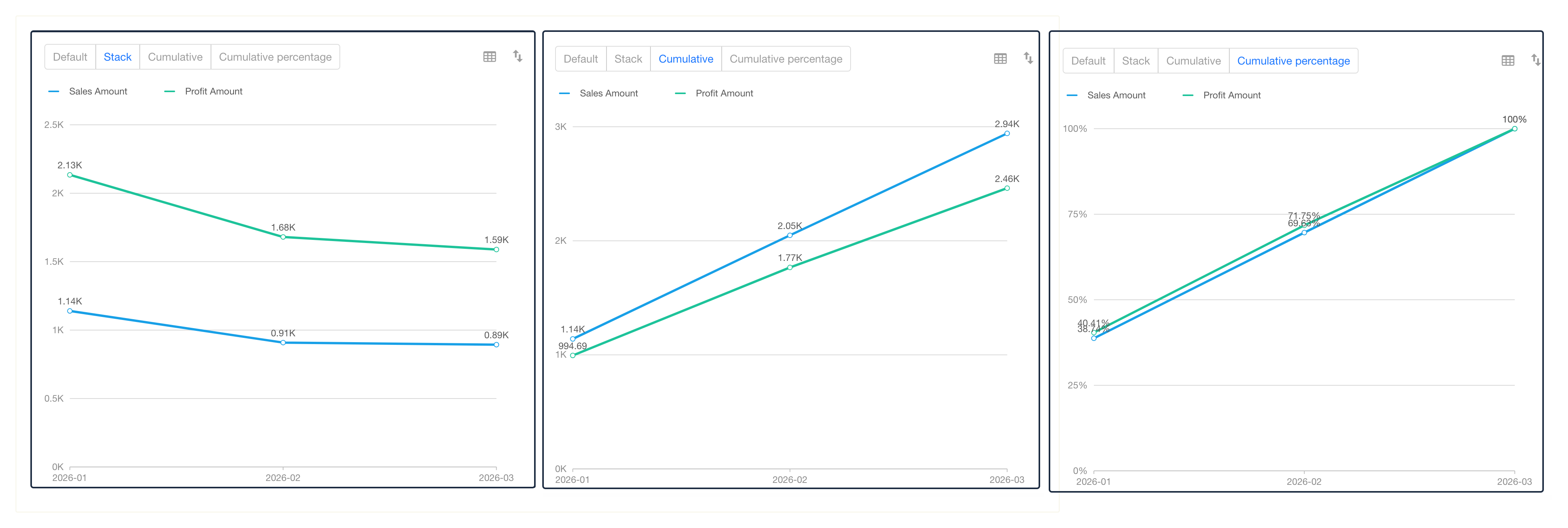 In the chart preview toolbar, you can switch calculation modes to support different analysis goals: