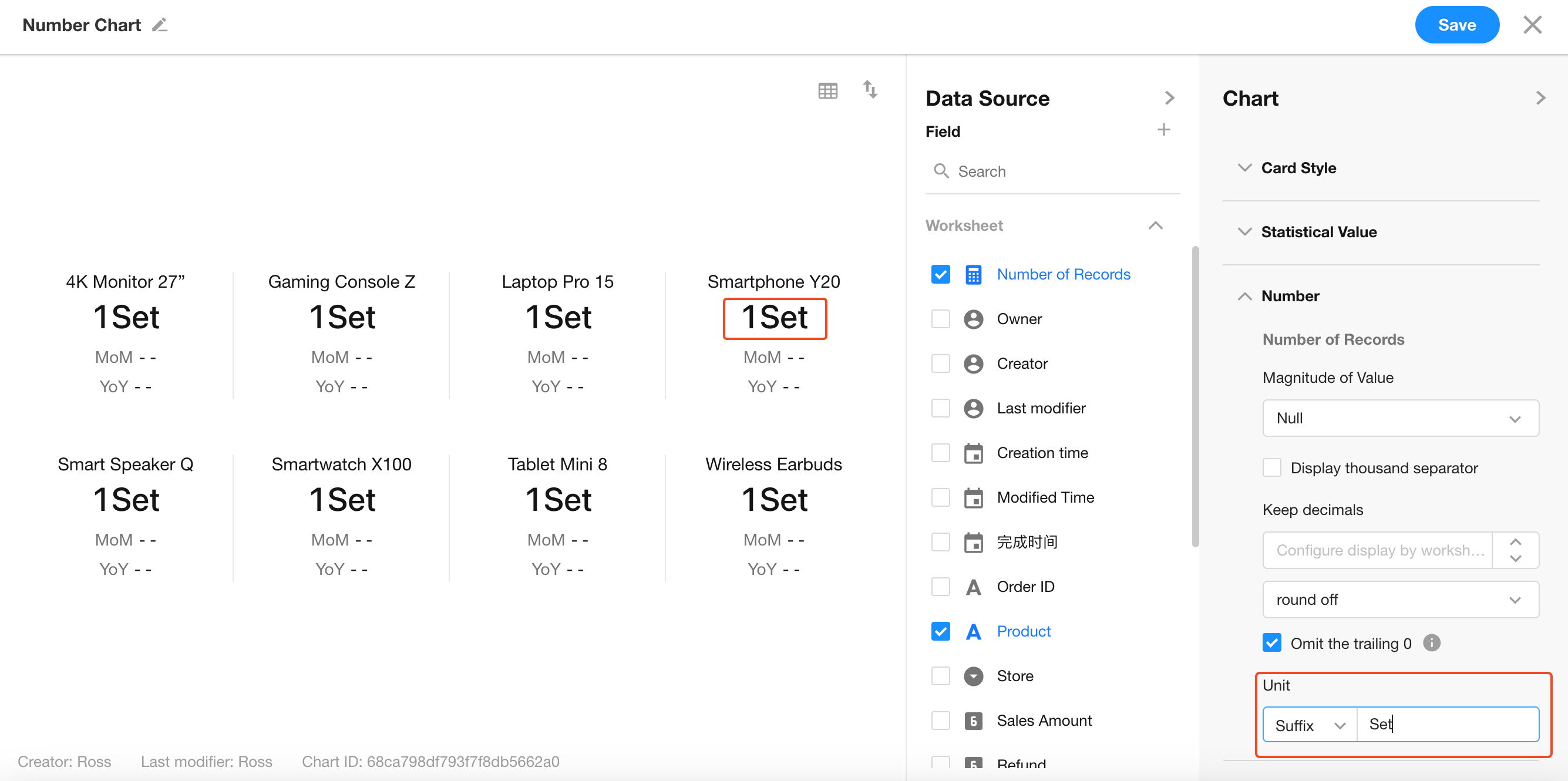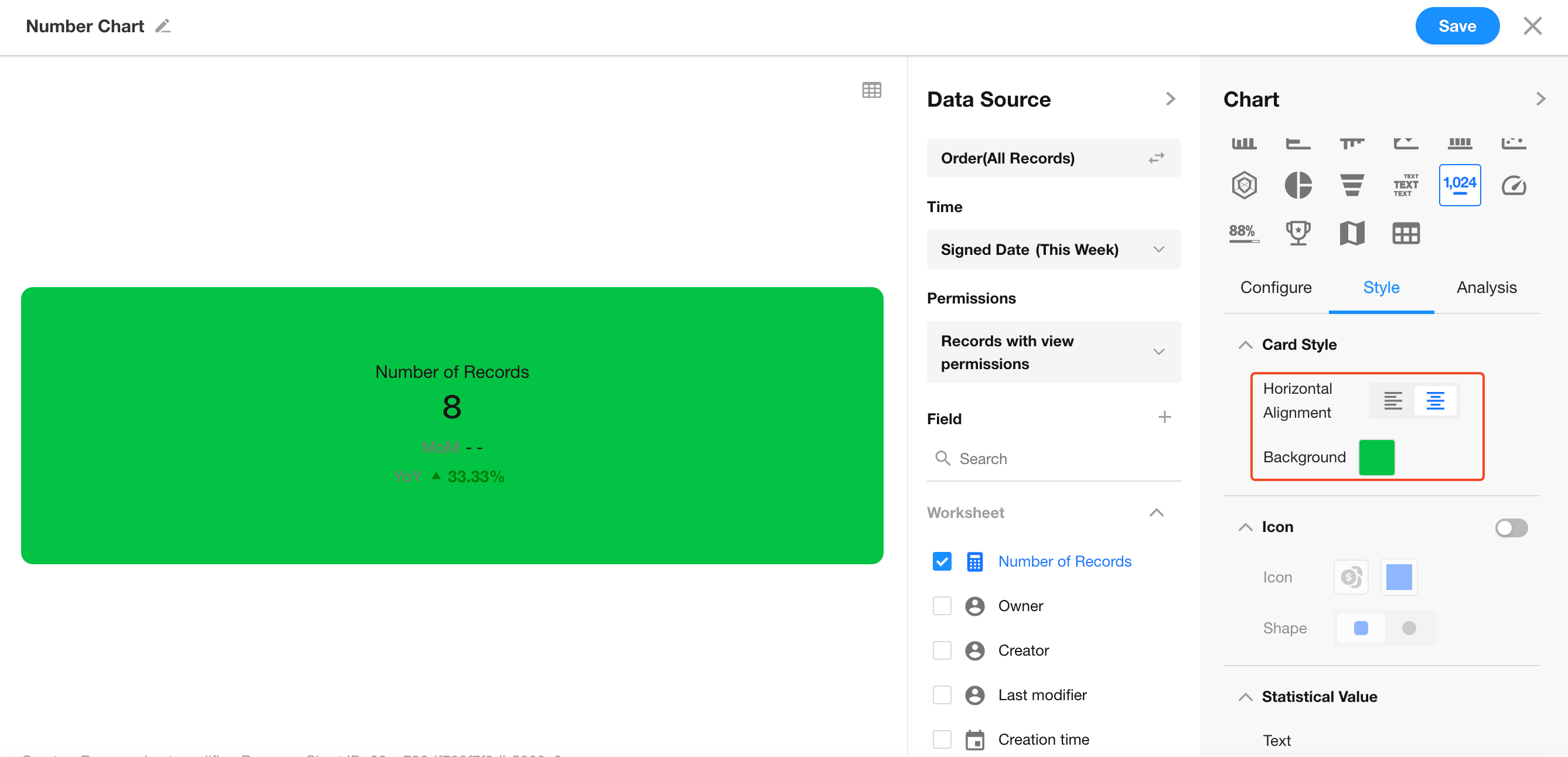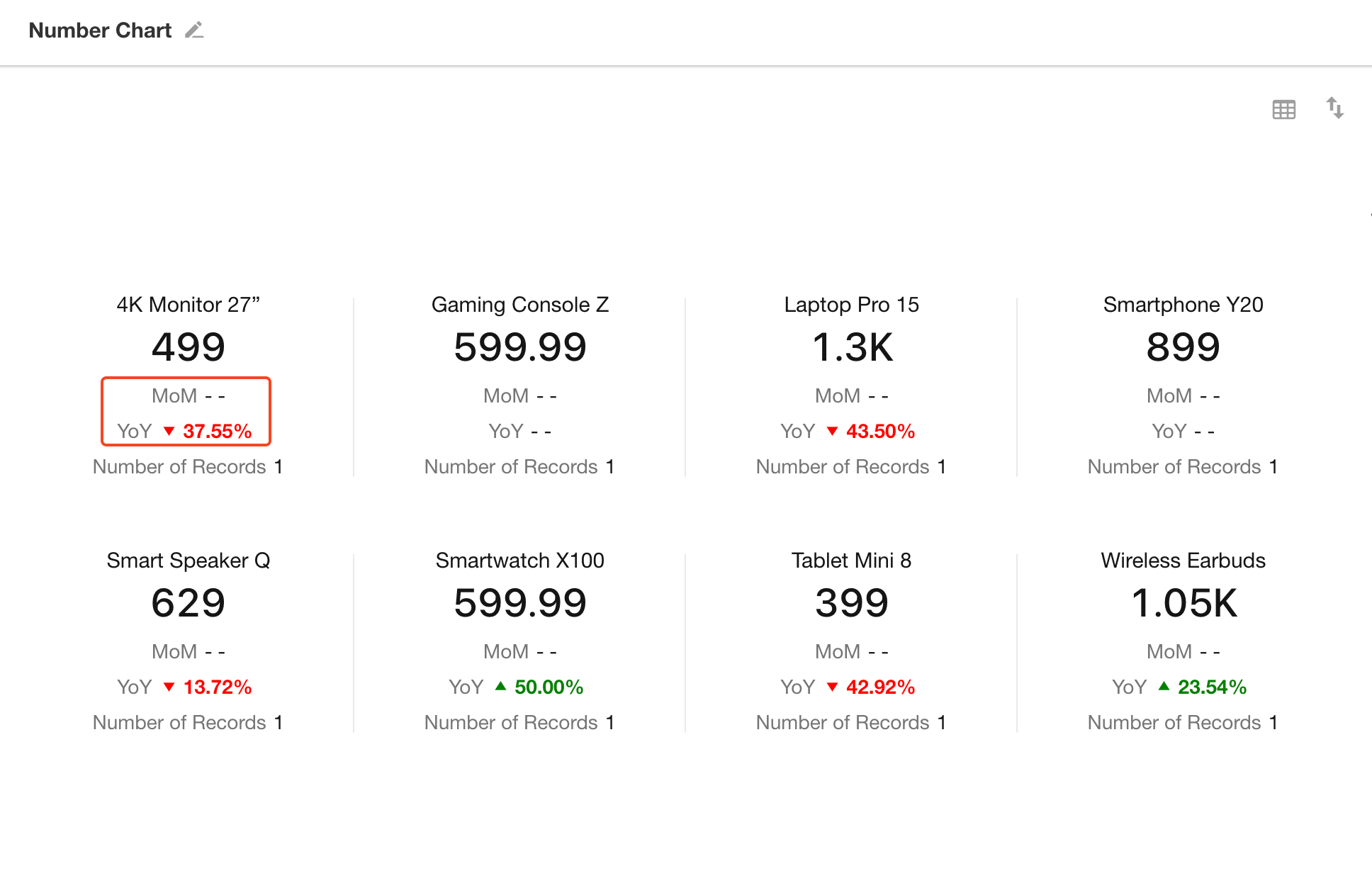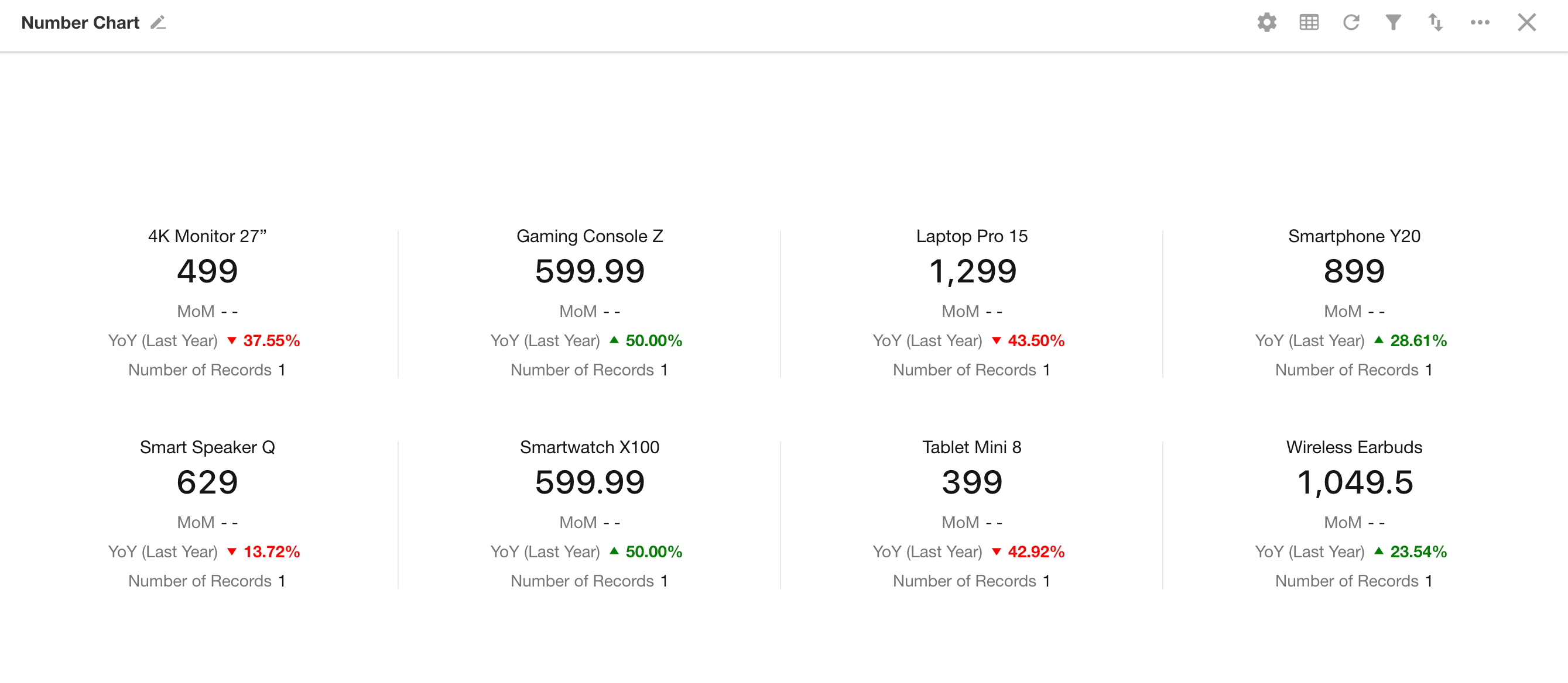 A number chart presents a single numerical value (e.g., sum, average, maximum, or minimum) calculated from records that meet specific conditions. It is one of the most intuitive ways to represent key data points.