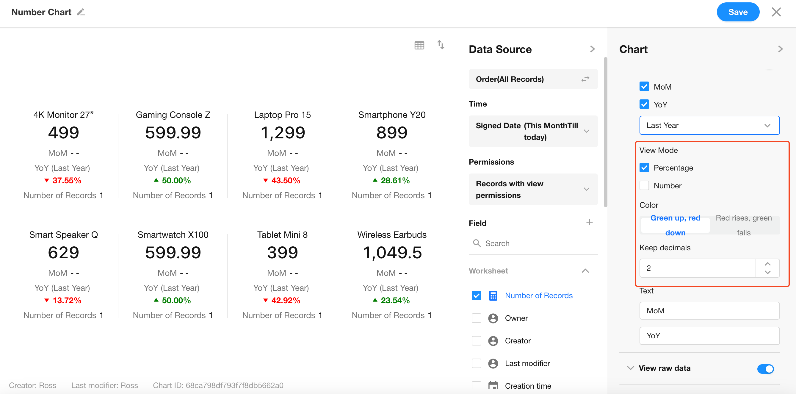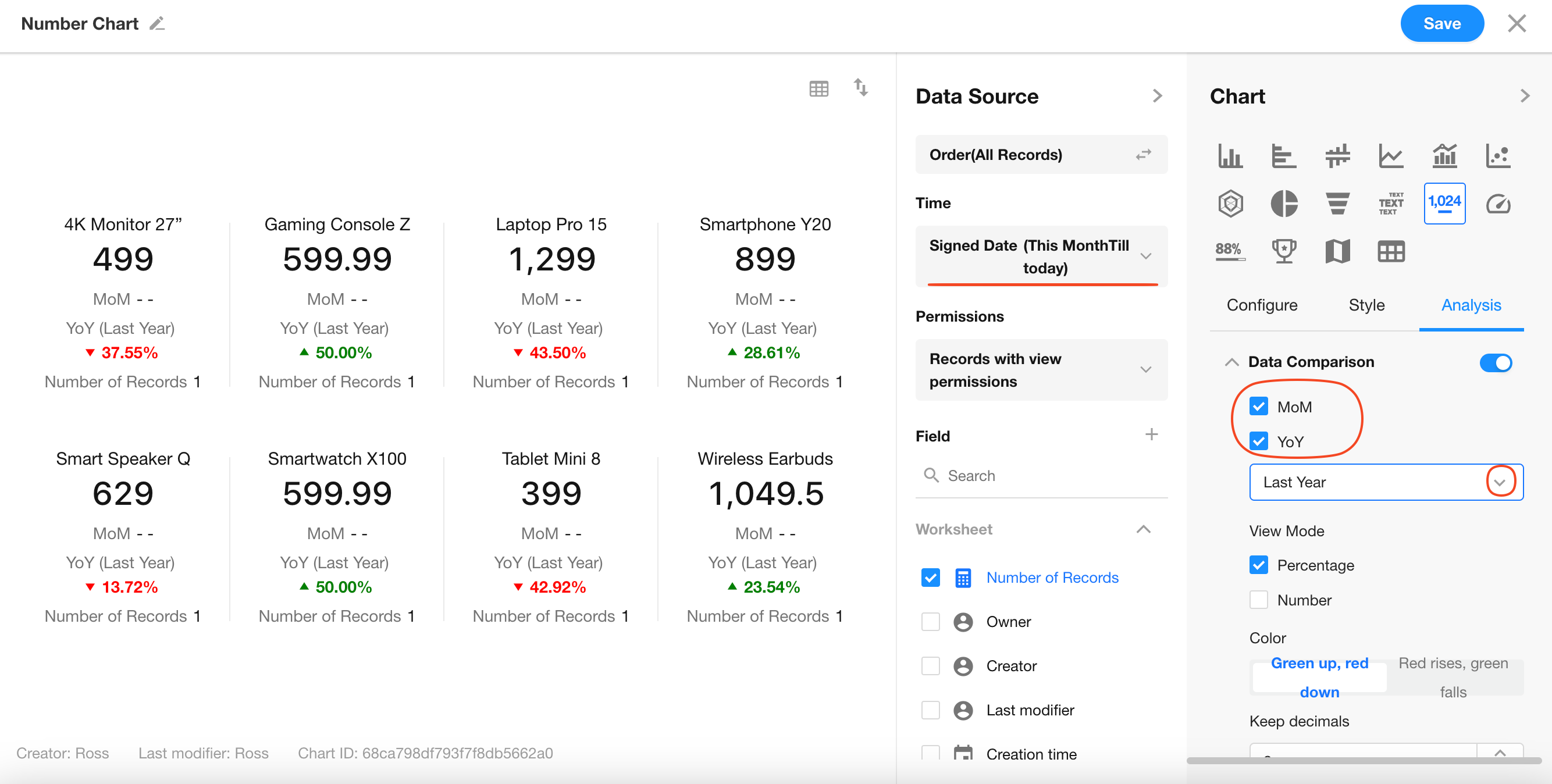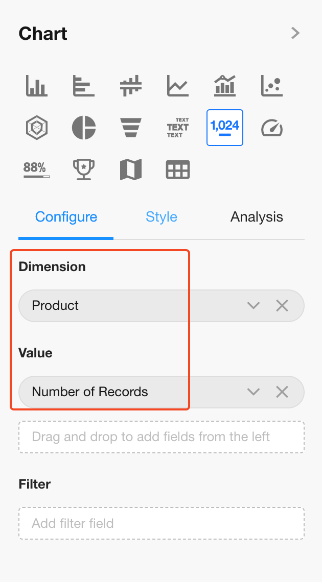 You can configure multiple value fields. If a dimension is selected, only the first value field supports MoM/YoY comparison; additional fields do not.