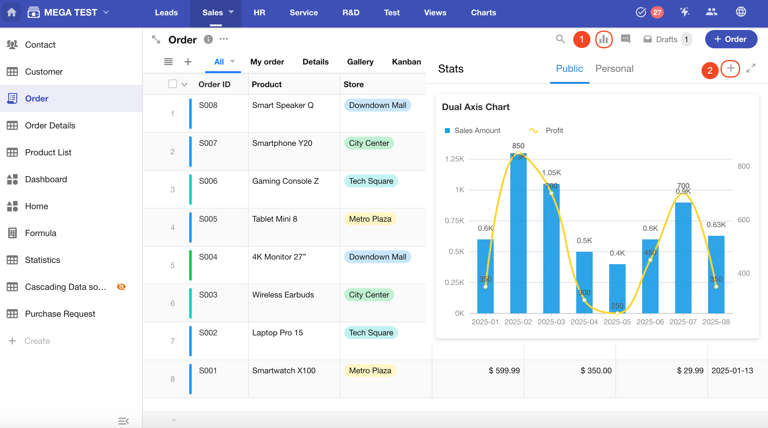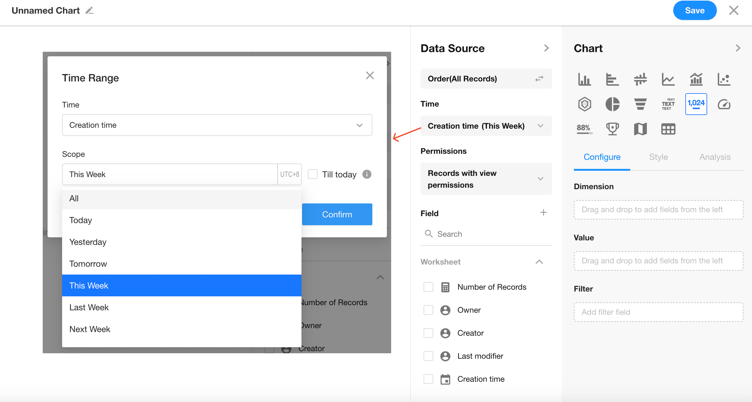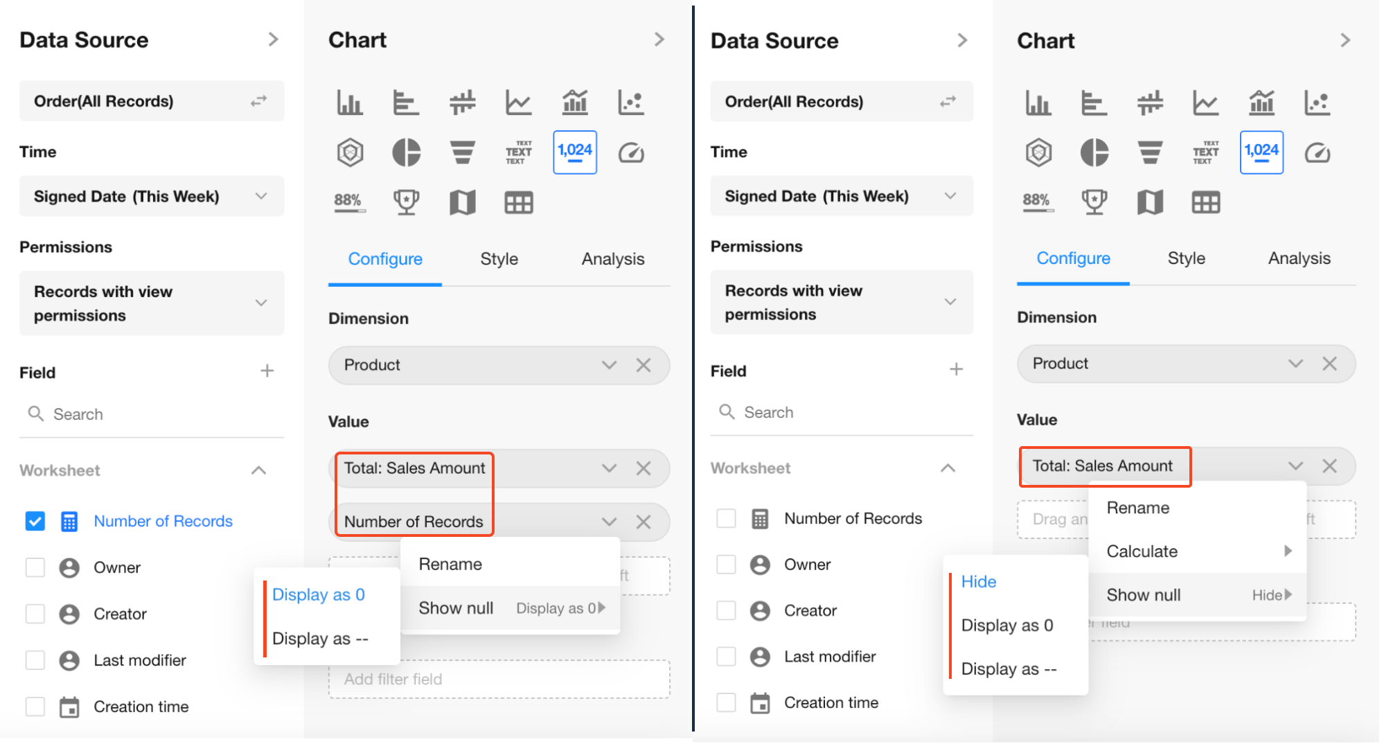 You can configure multiple value fields. If a dimension is selected, only the first value field supports MoM/YoY comparison; additional fields do not.