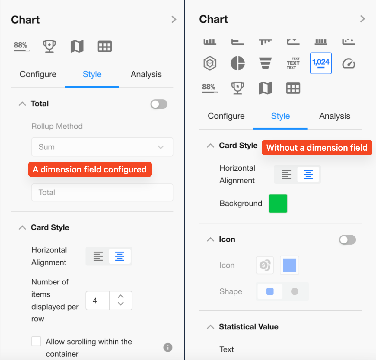 When no dimension is selected and only one value is displayed, you can enable or disable icons, and customize icon style, color, and shape.