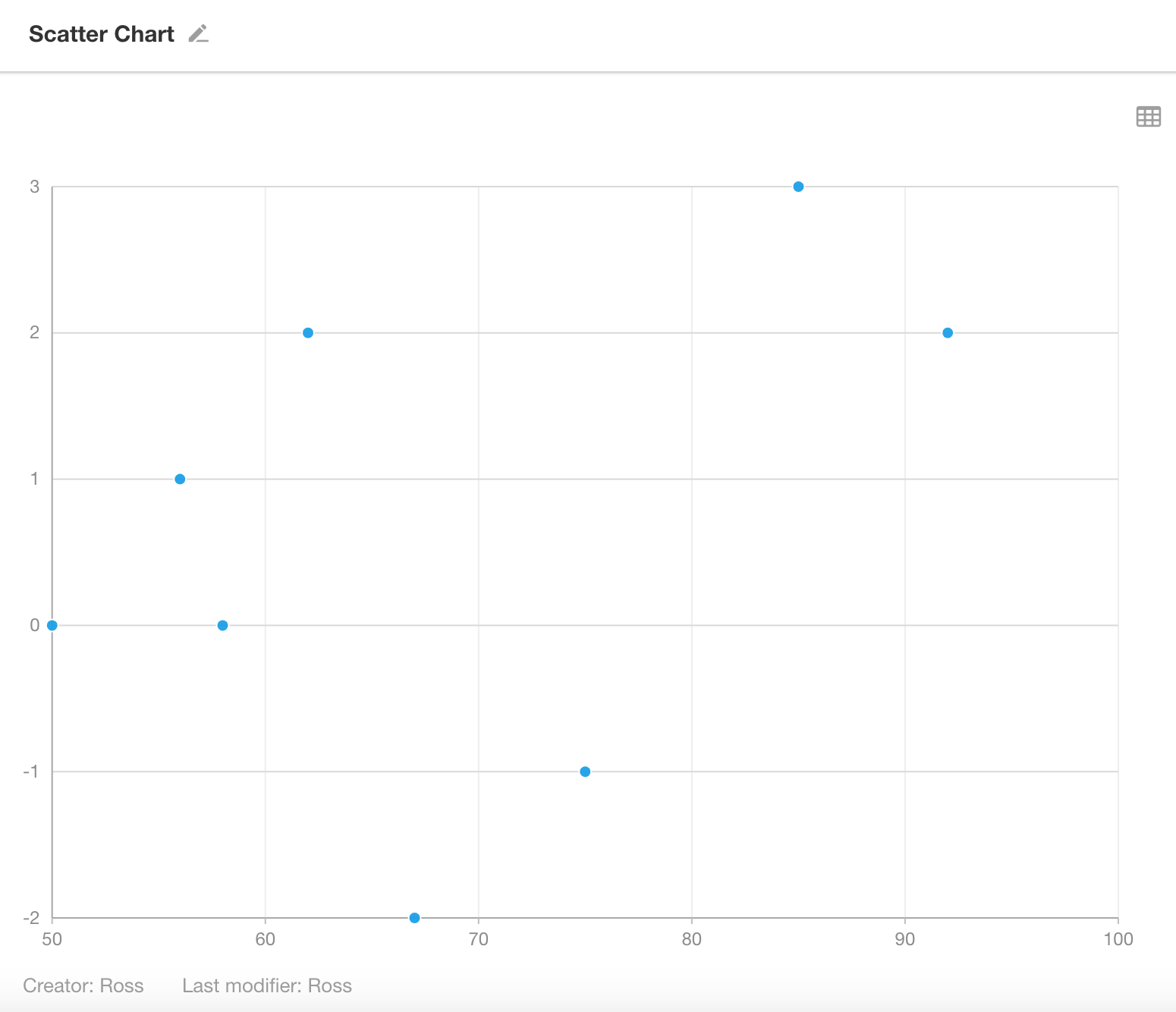 A scatter chart displays data points plotted on the chart using X and Y values. It shows the overall trend of how a dependent variable (Y-axis) changes with respect to an independent variable (X-axis). It also helps to visualize the data distribution across dimensions and color groups.