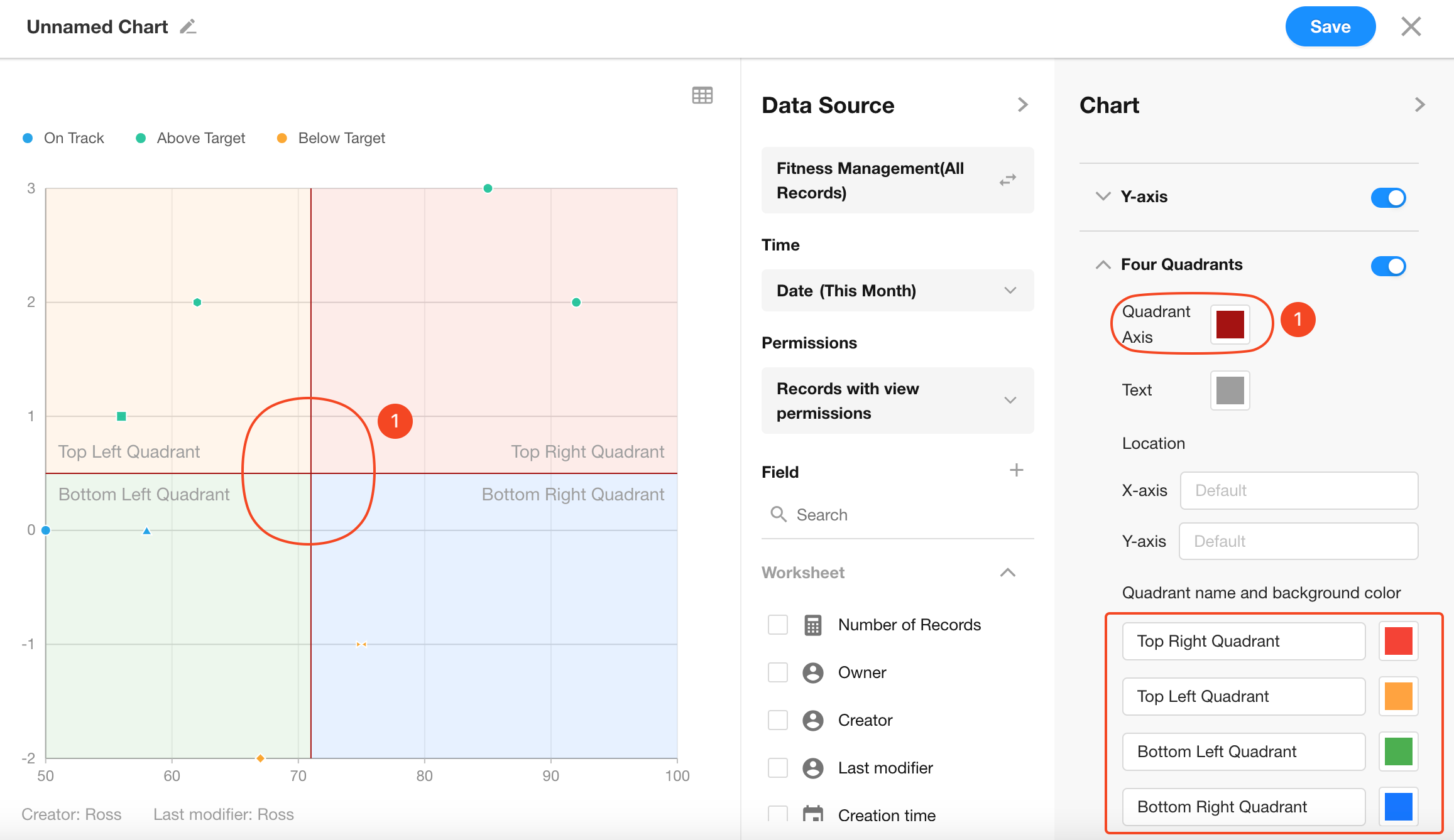 You can optionally configure quadrant lines, including custom colors and labels for each quadrant.