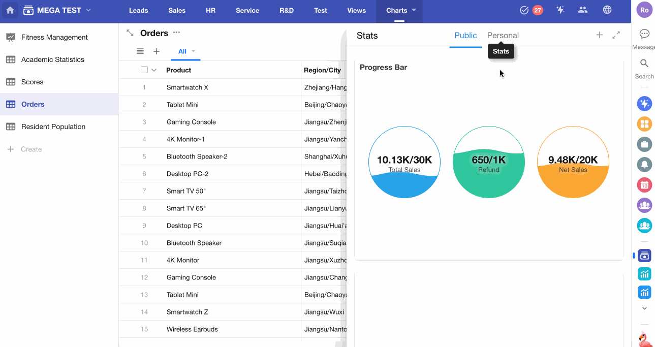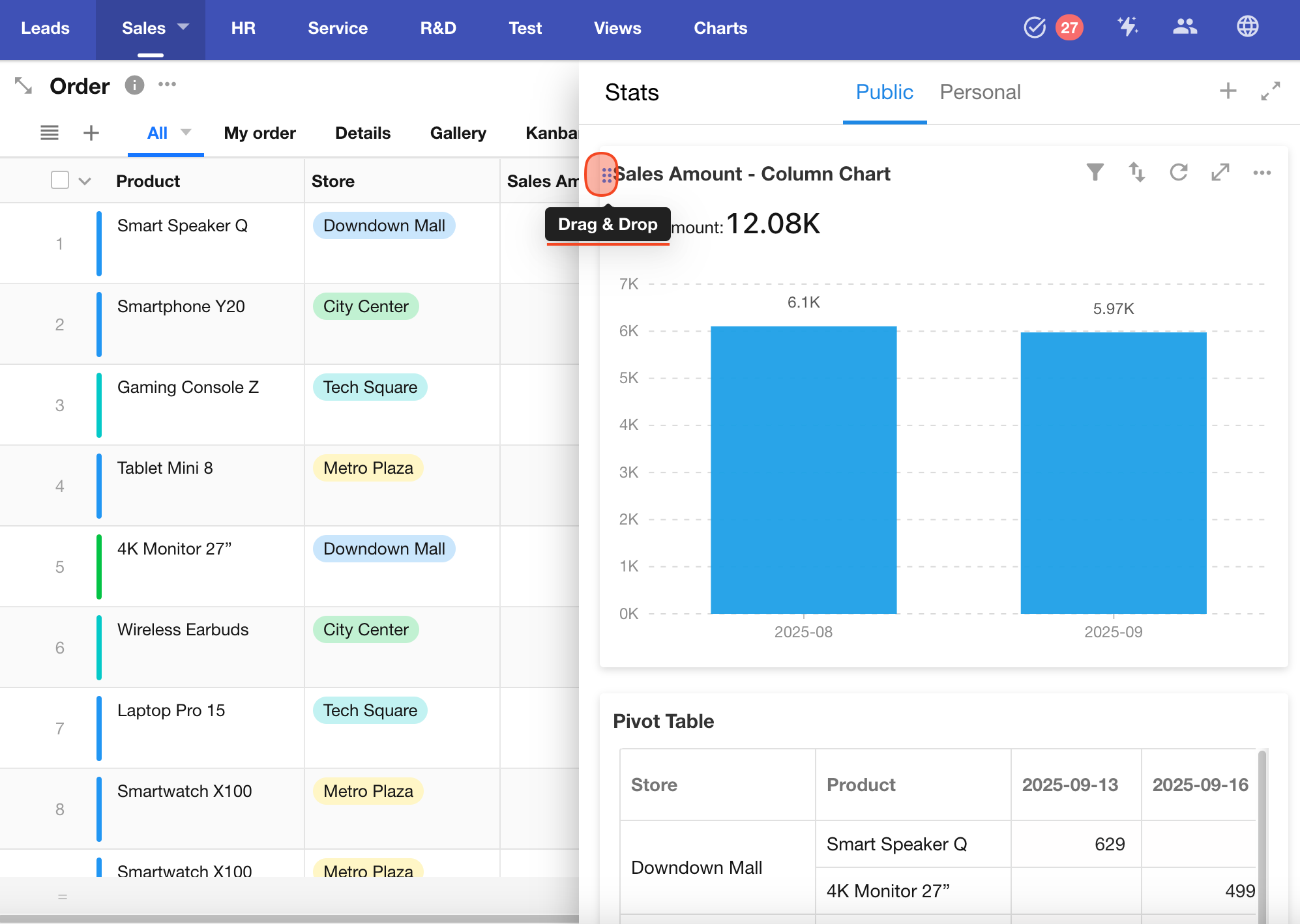 App administrators can reorder charts. Click and drag the icon in the top-left corner of a chart to adjust its position. The order will be applied for all members.