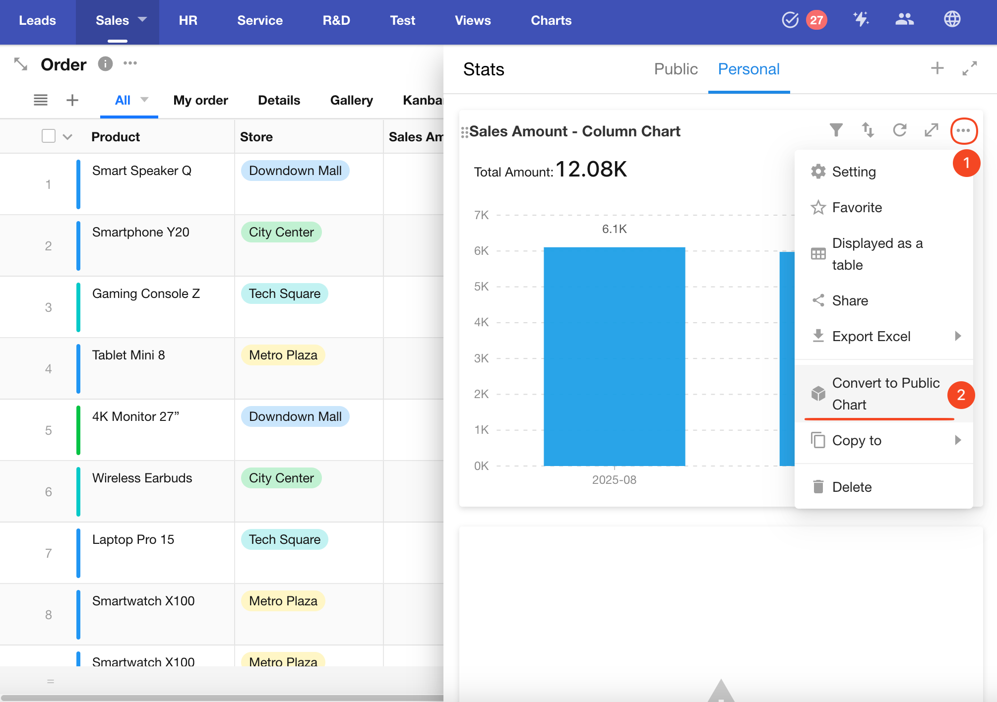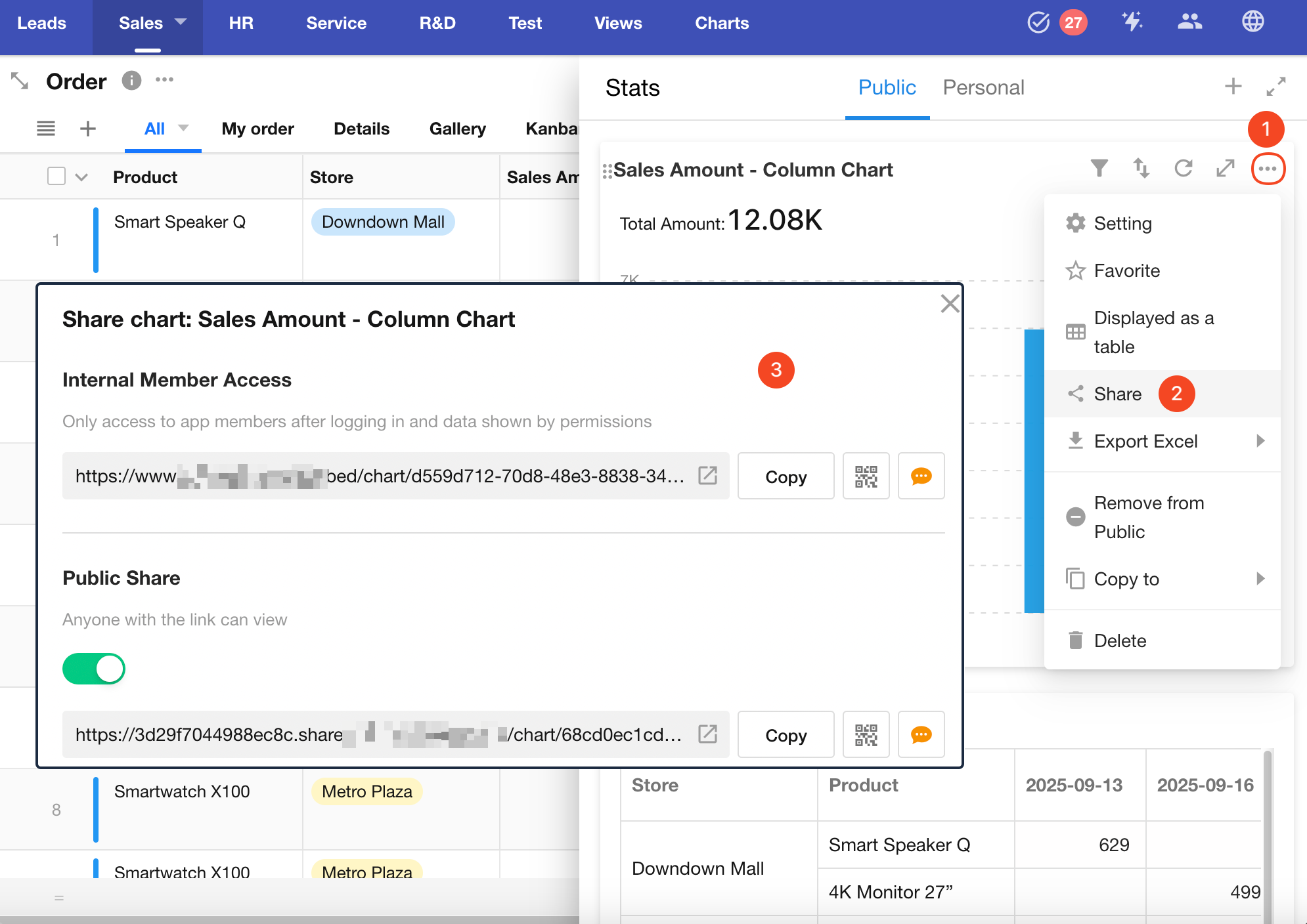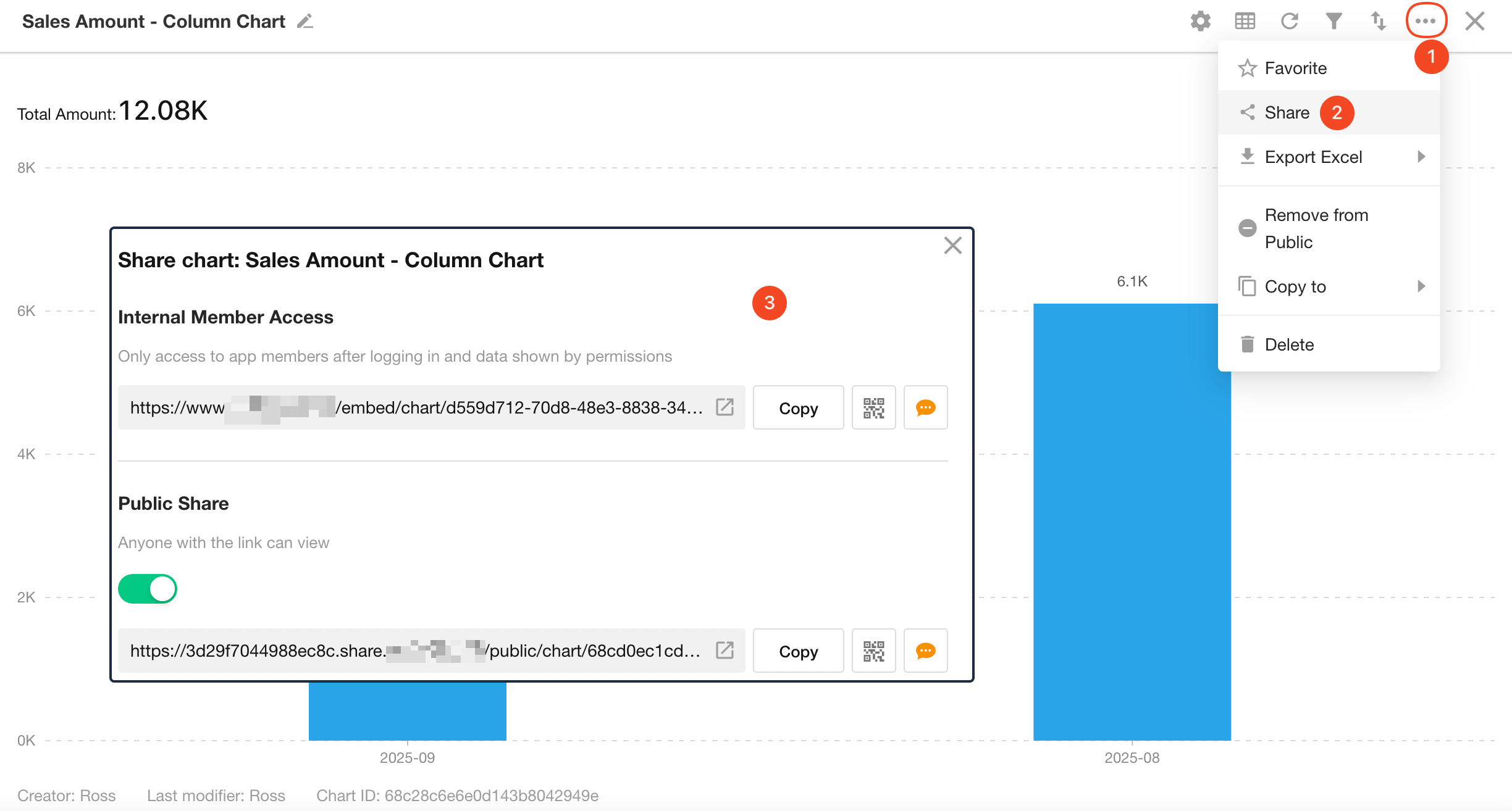 App administrators can enable chart sharing. Once enabled, other members can generate a public link or QR code to share the chart externally.