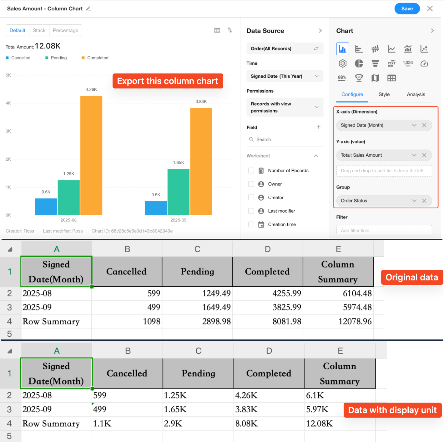 Chart dada can be exported in Excel format. The exported file will use the chart's name as the file name. You can choose to export:
