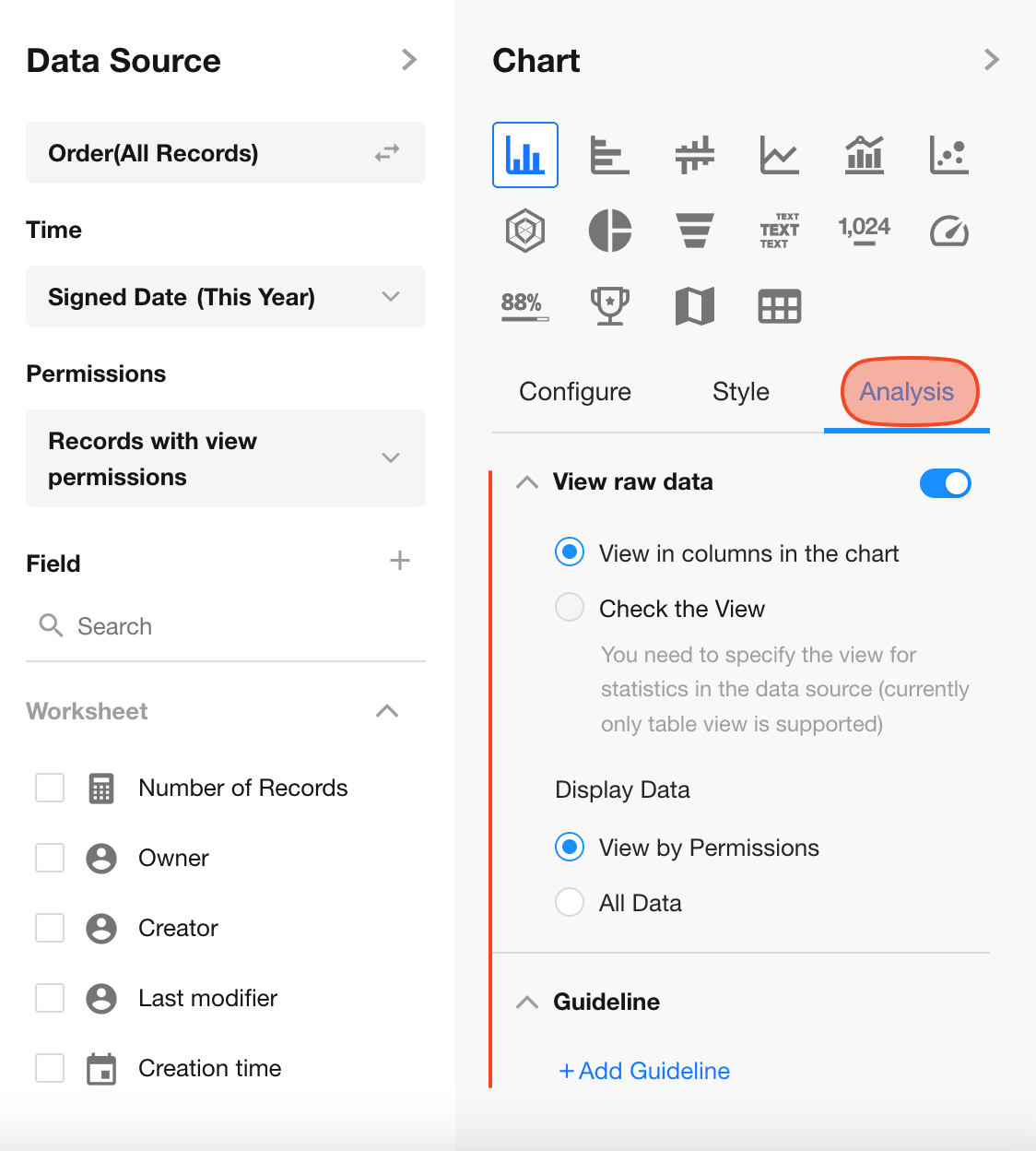 To assist with analysis, you can view the original data behind the chart or add one or more reference lines for better visual interpretation.