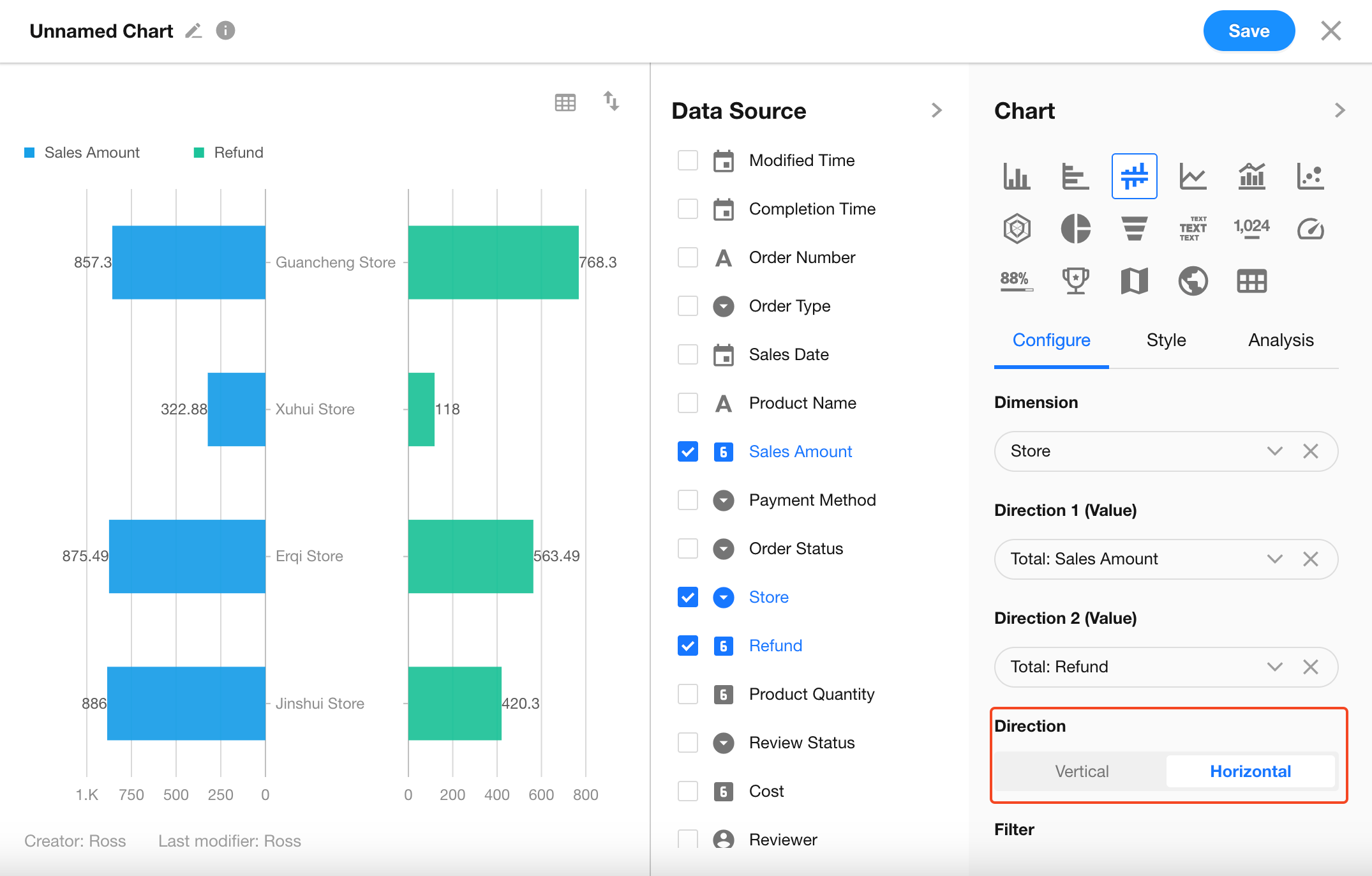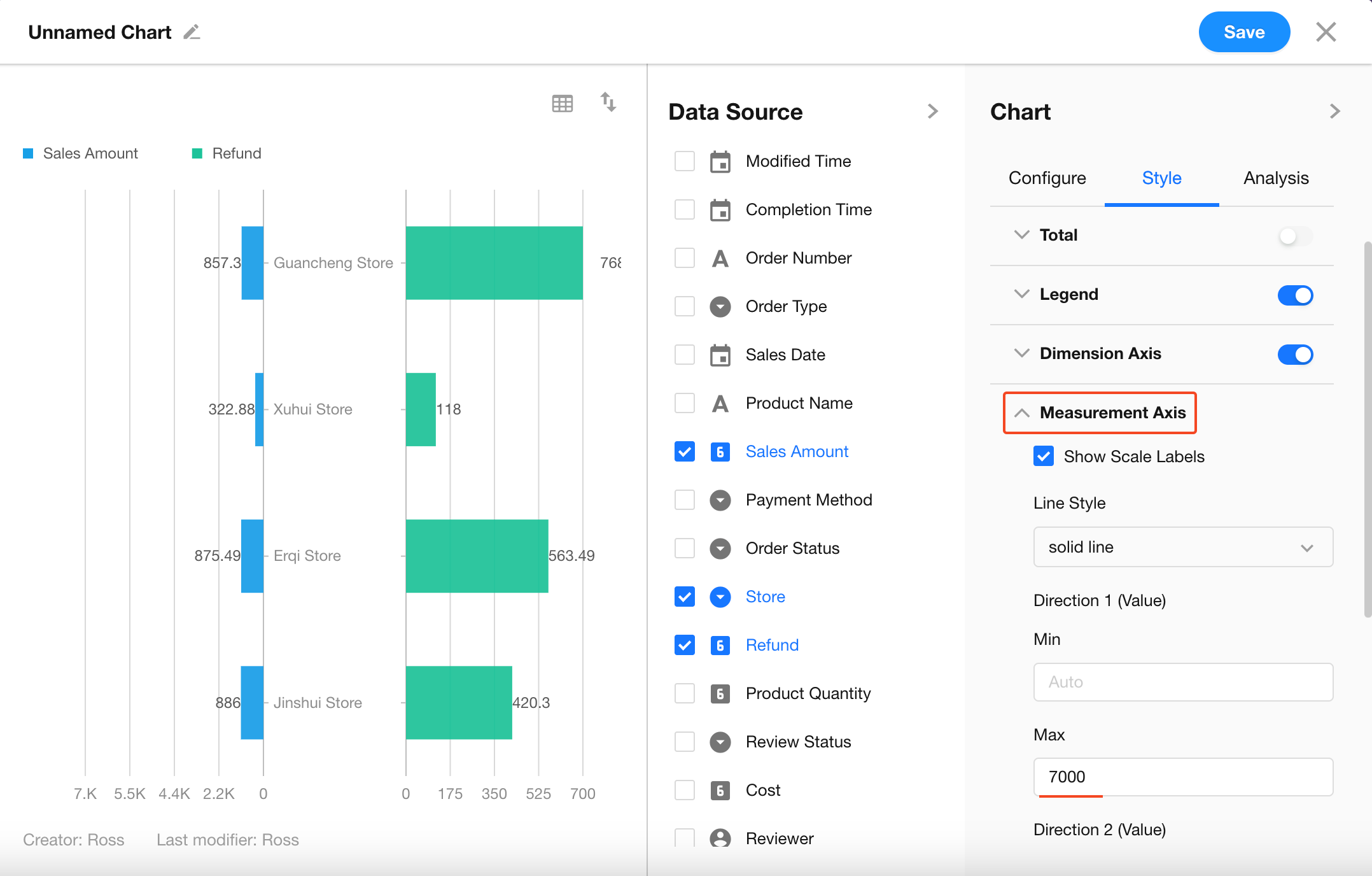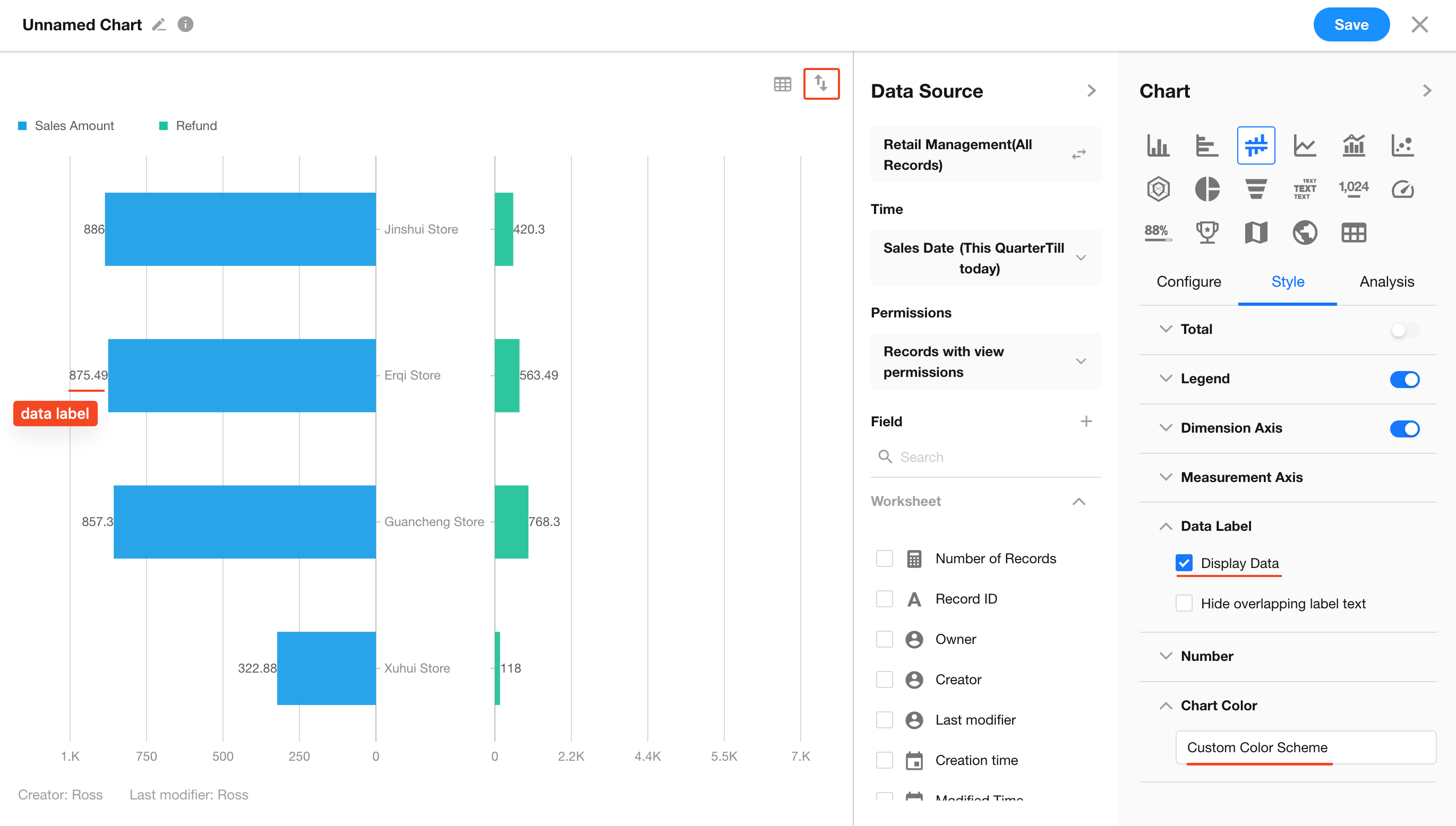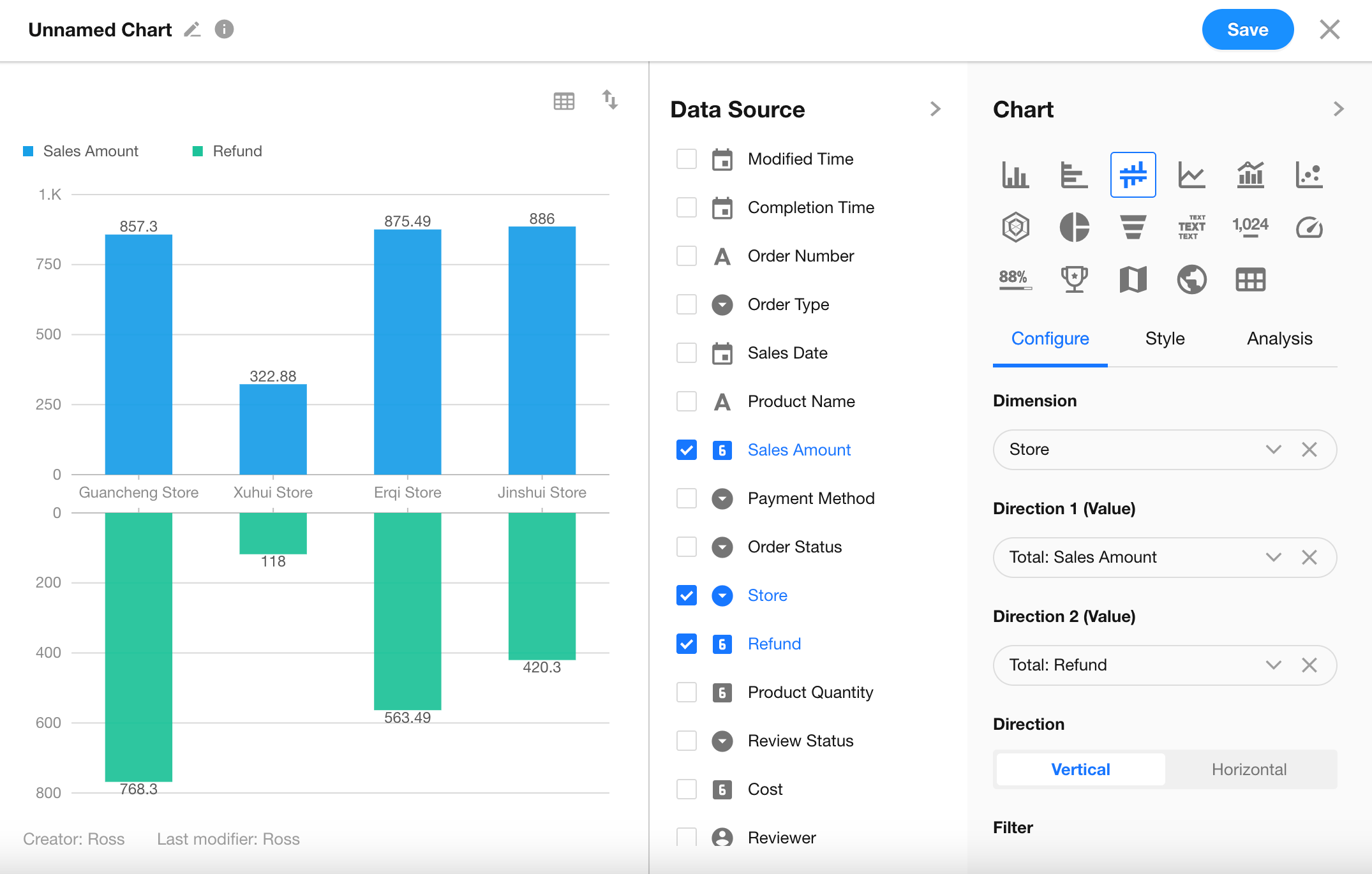 If your worksheet already includes two fields (e.g., Sales Amount and Refund), you can configure the chart directly. This example uses this structure.