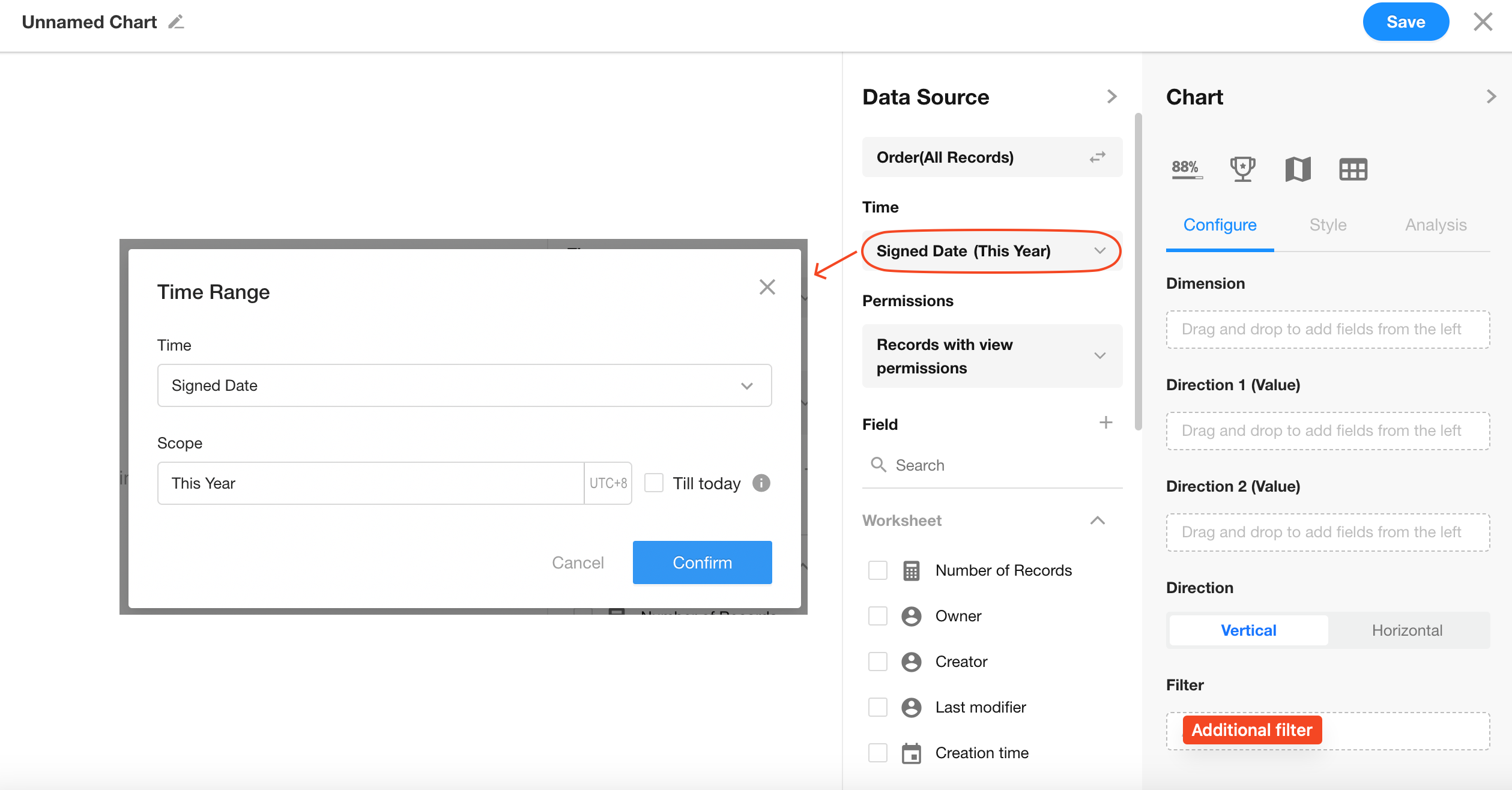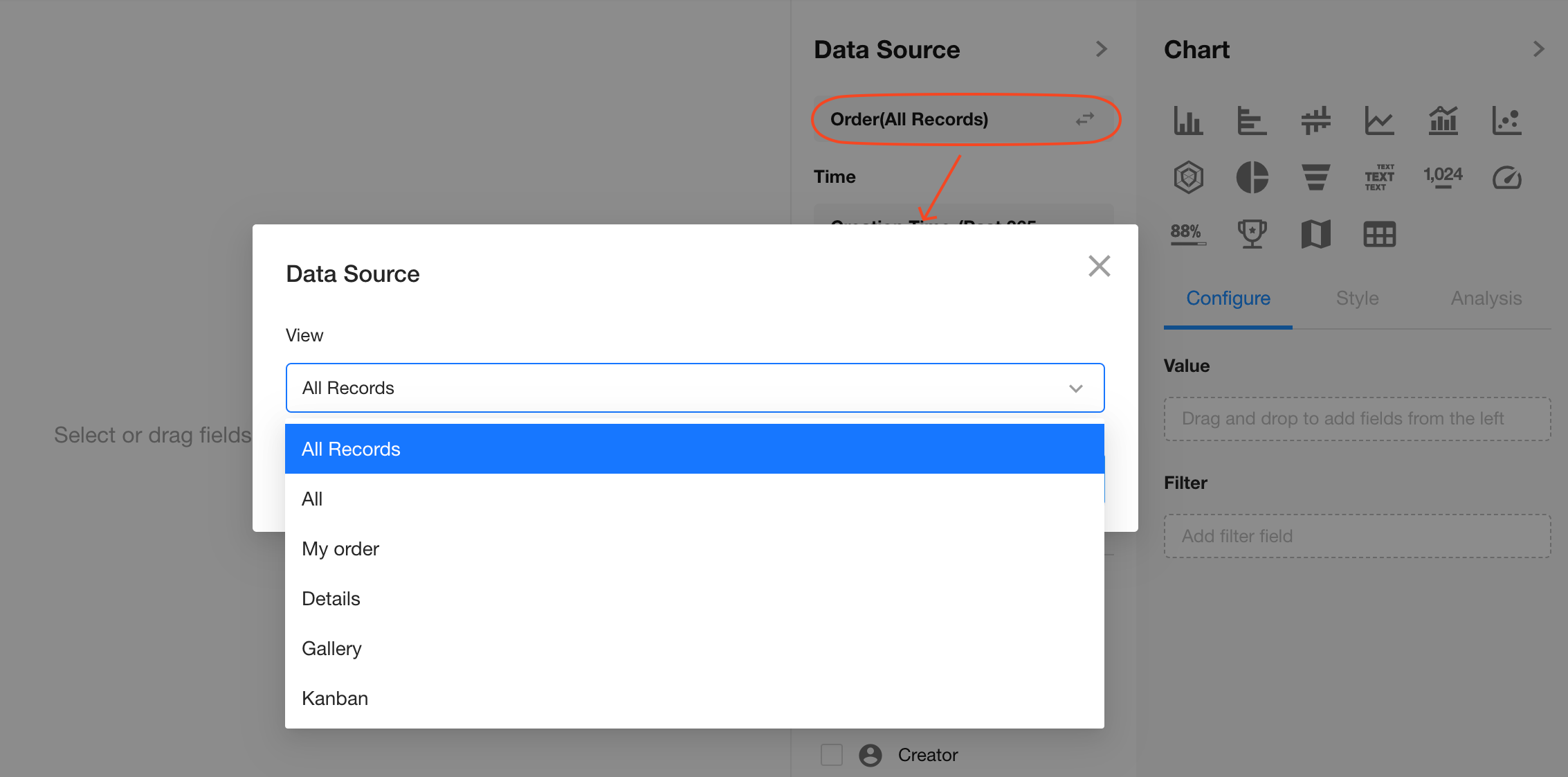 Choose whether to base the chart on a specific view or all records in the worksheet (default is all records).
