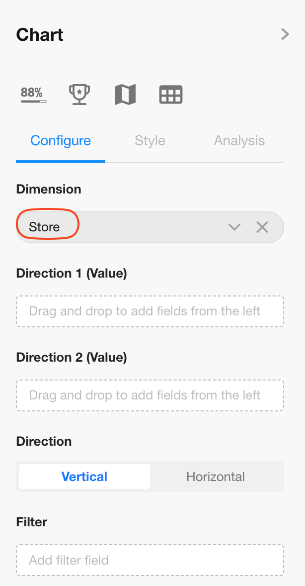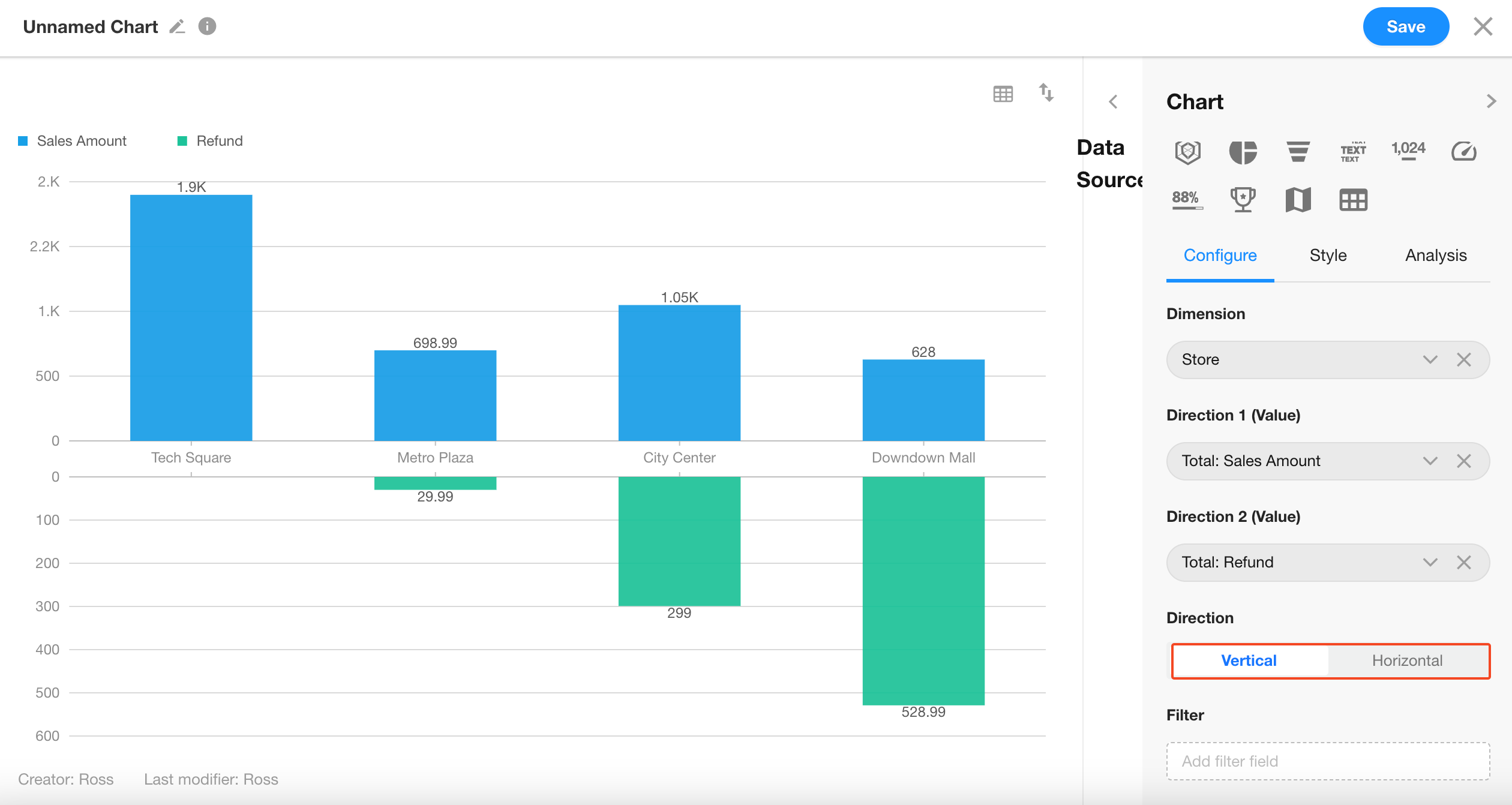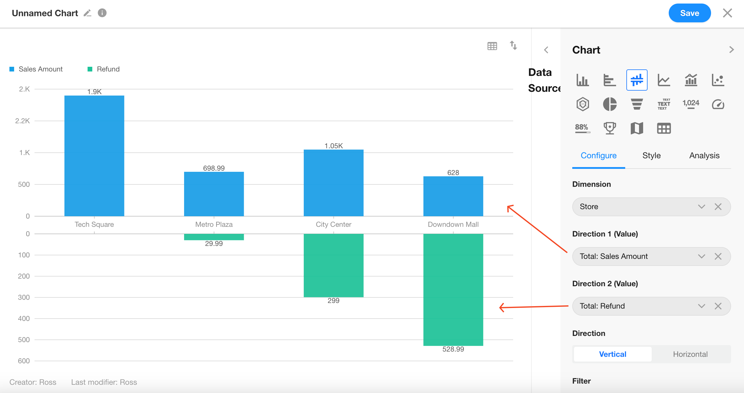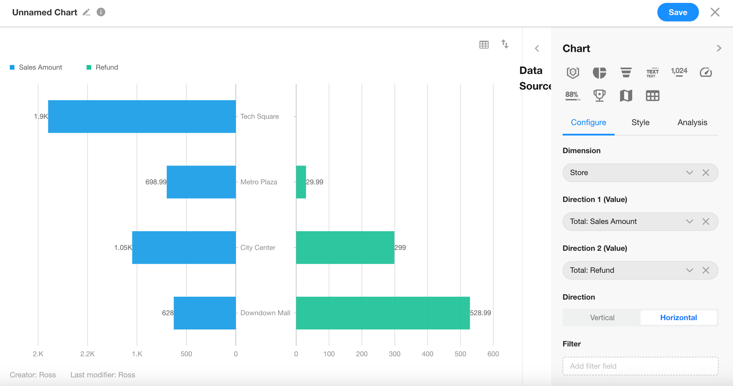 X-Axis: “Store" – Analyze sales amount and refunds per store