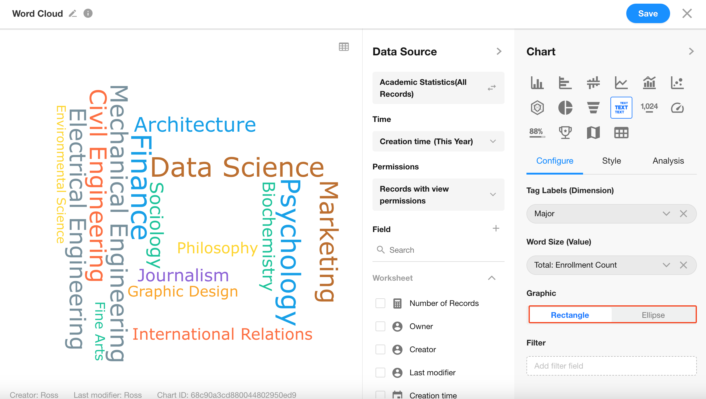 Example: Generate a word cloud to analyze the most popular majors this year in the Academic Statistics worksheet.