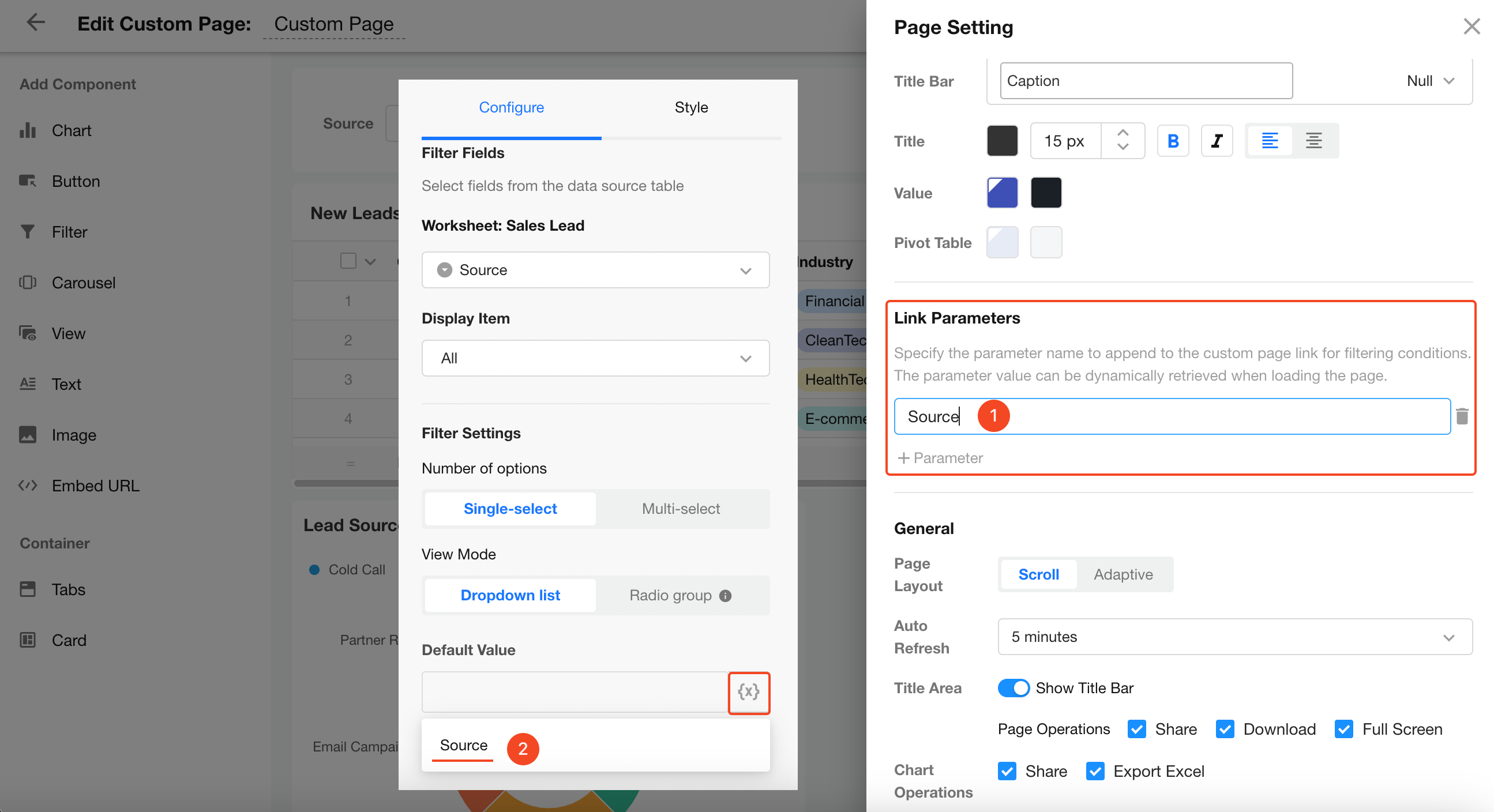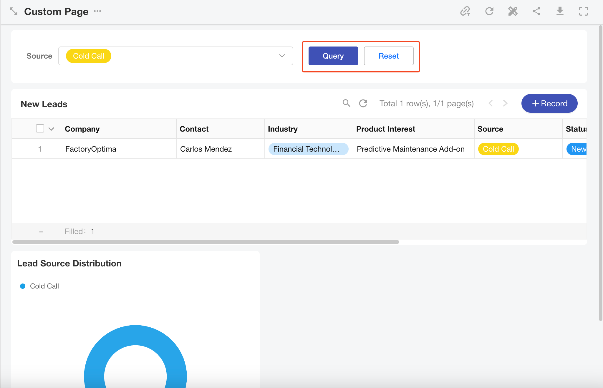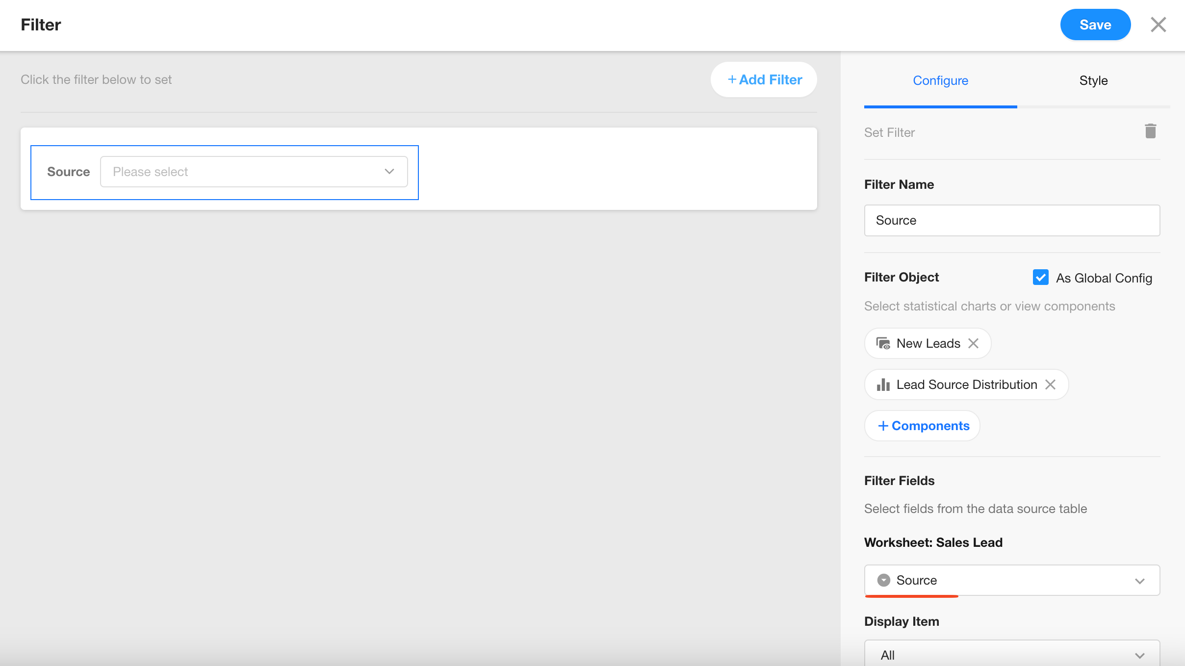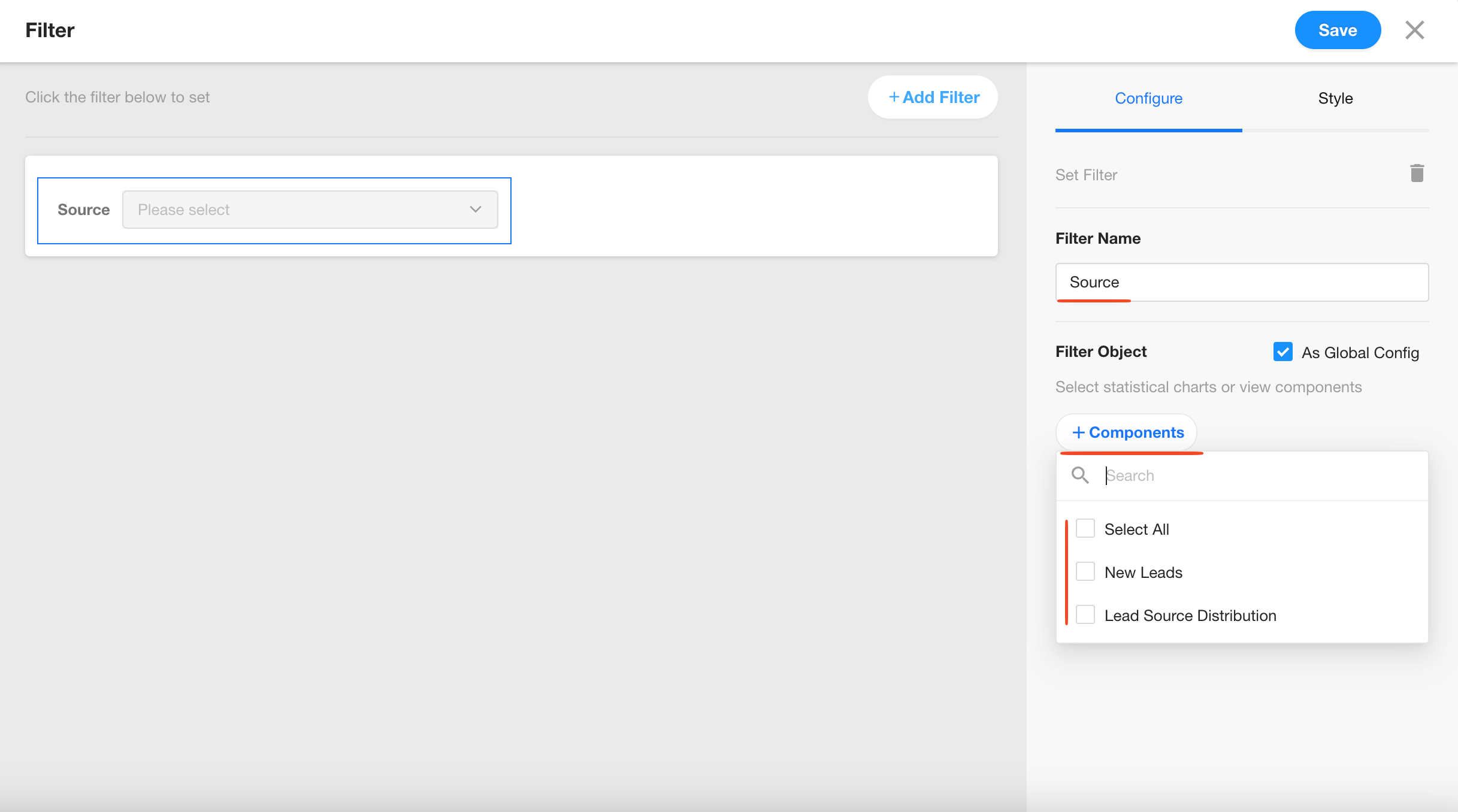 Example: Add a filter based on the "Source" field to view the relevant sales leads statistical data.