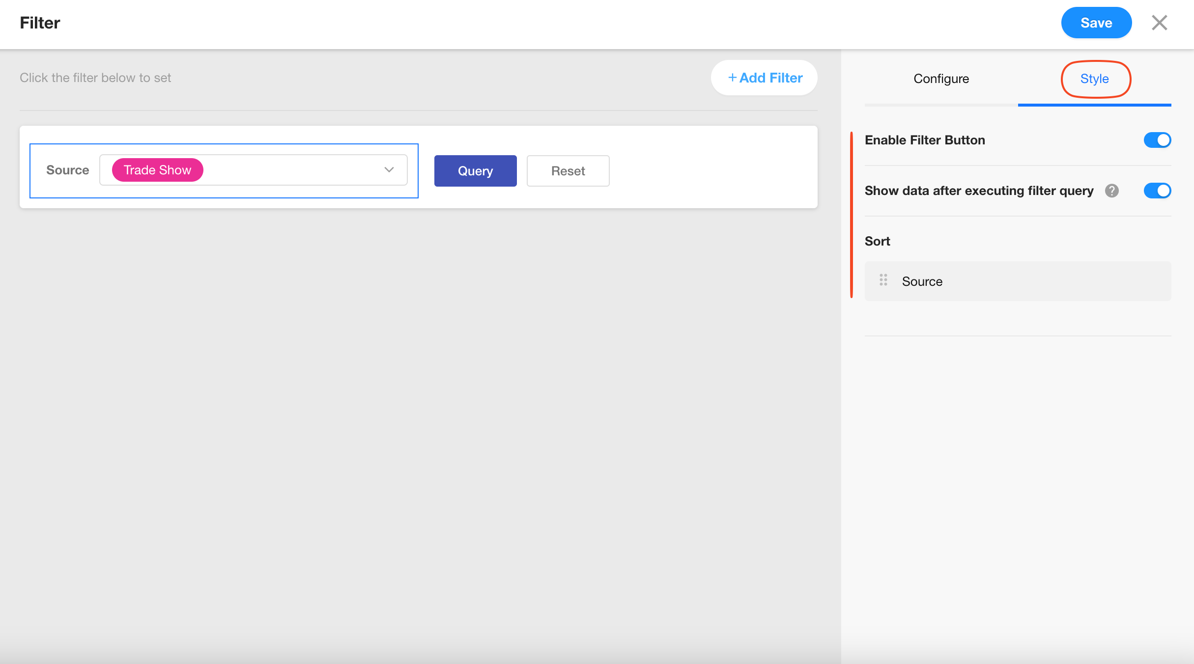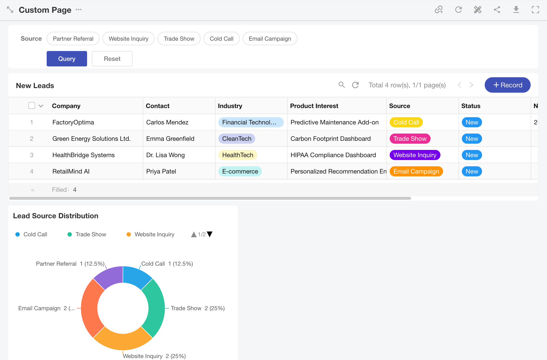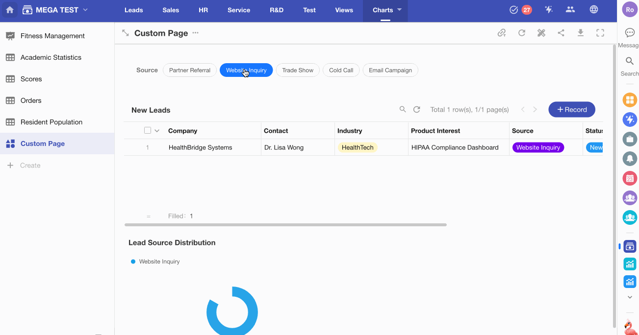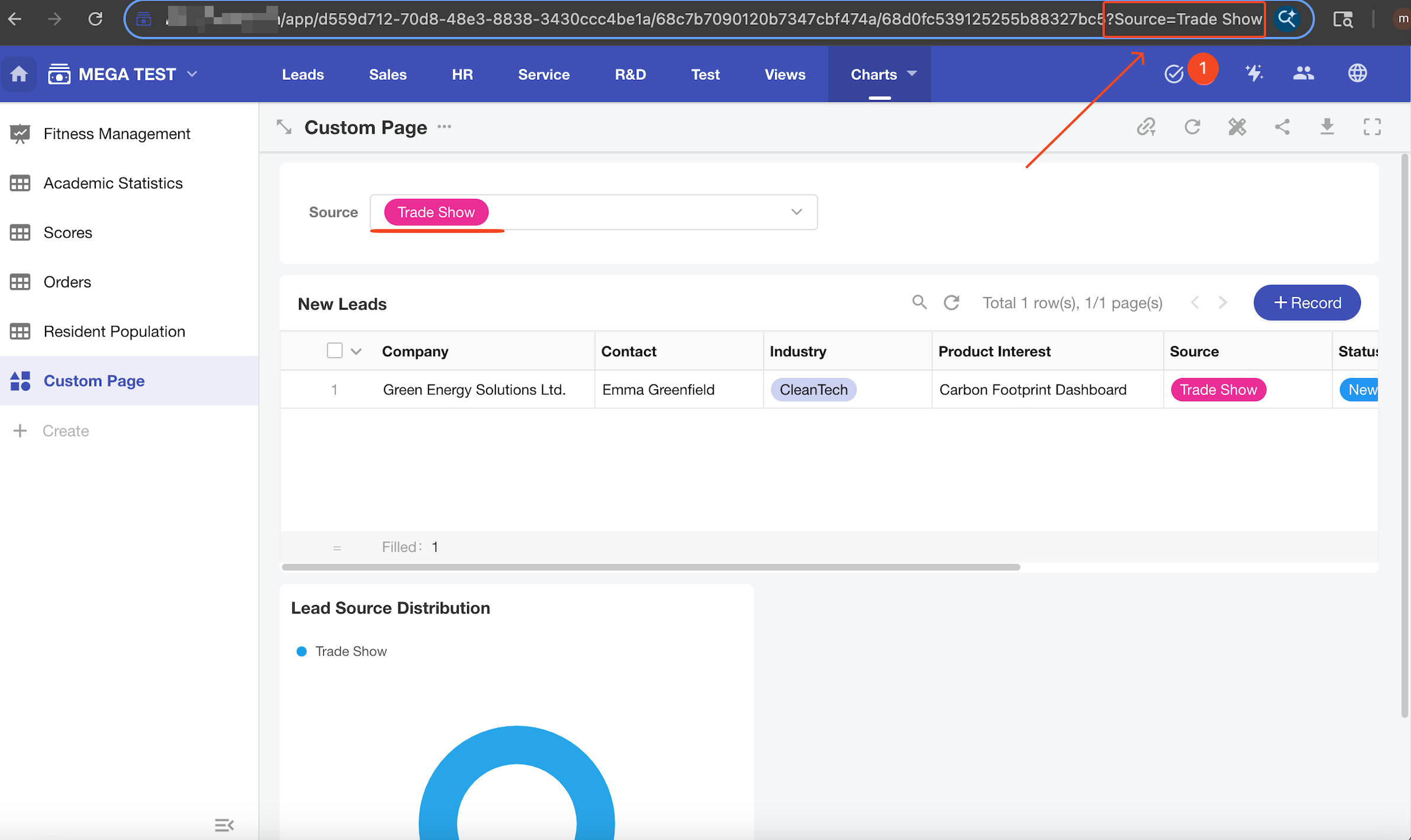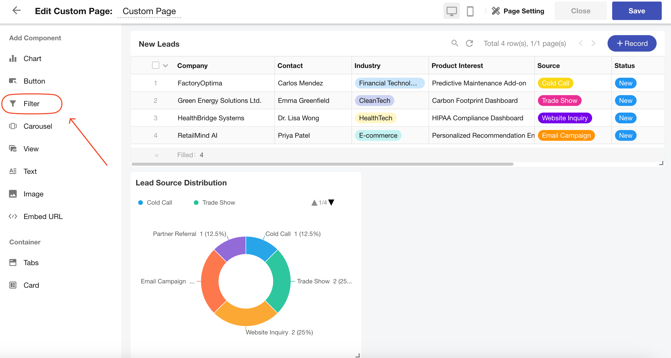 Example: Add a filter based on the "Source" field to view the relevant sales leads statistical data.