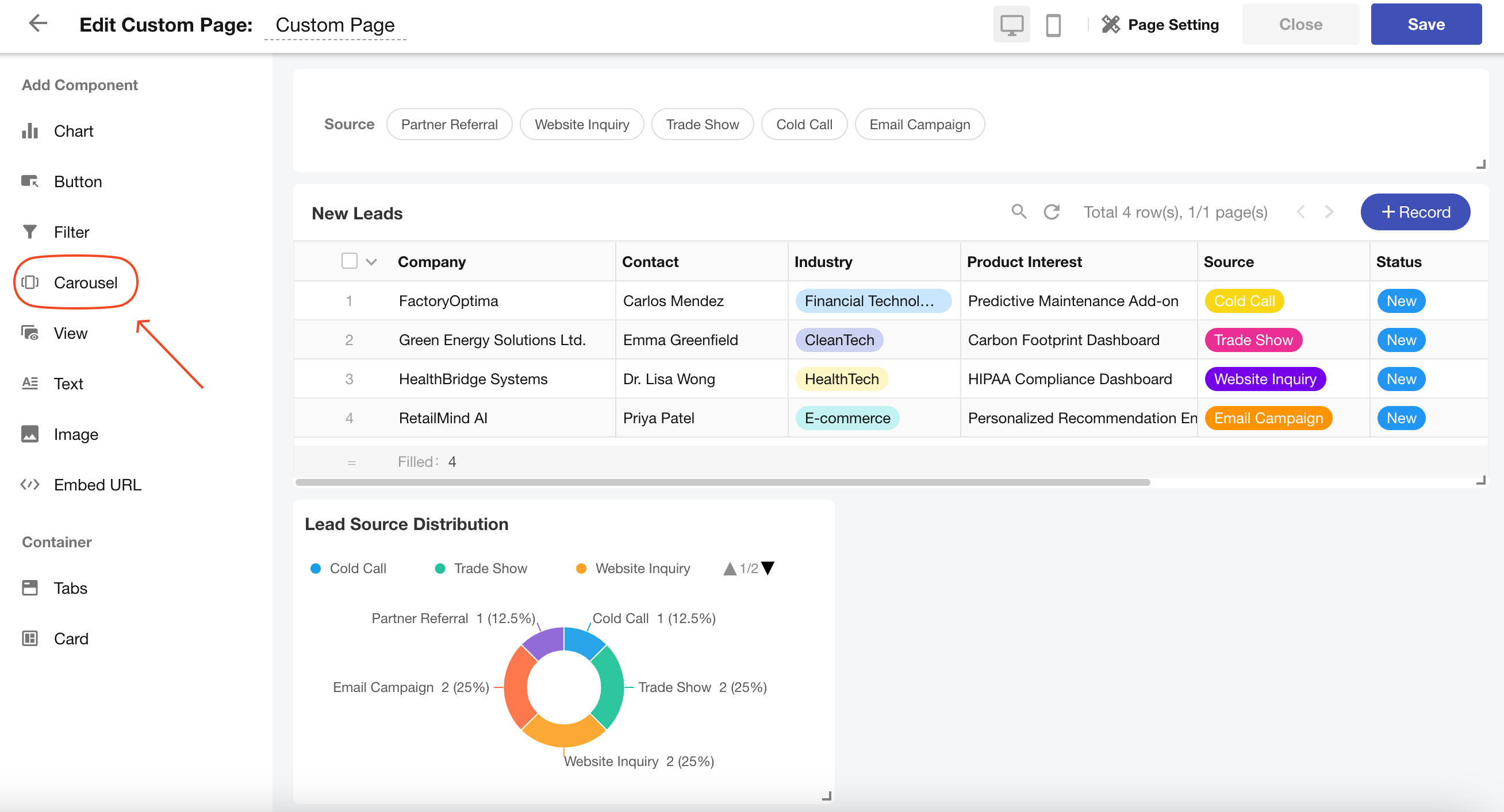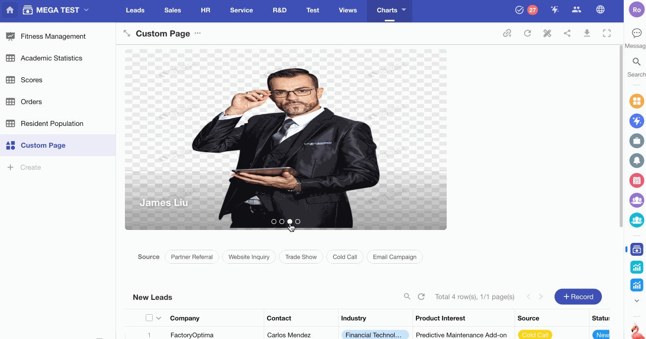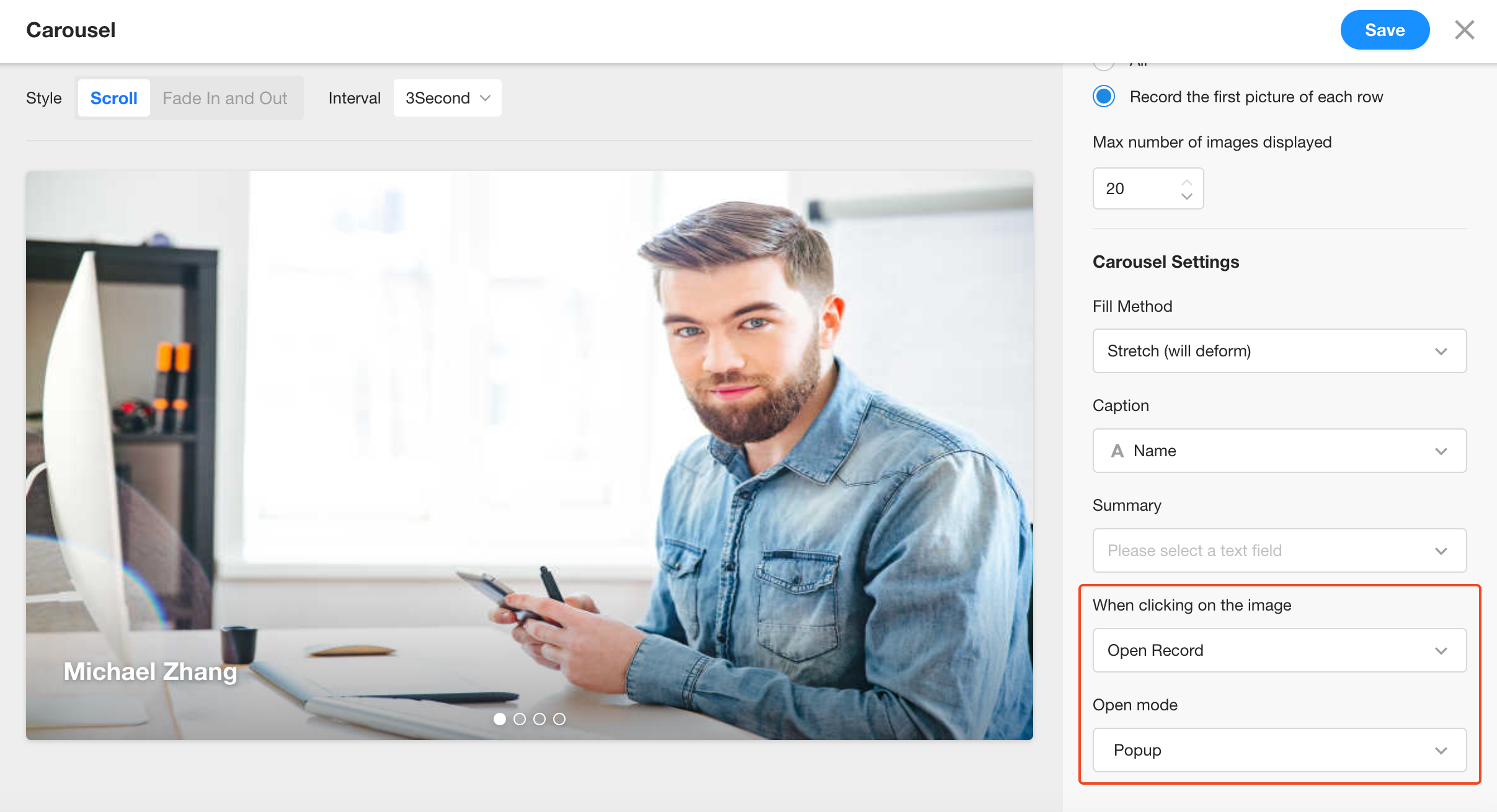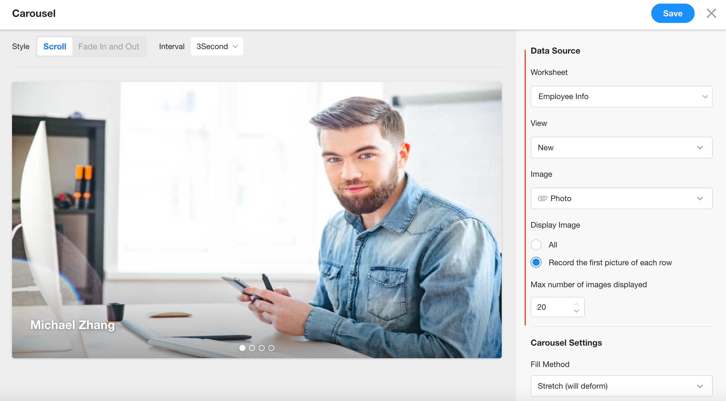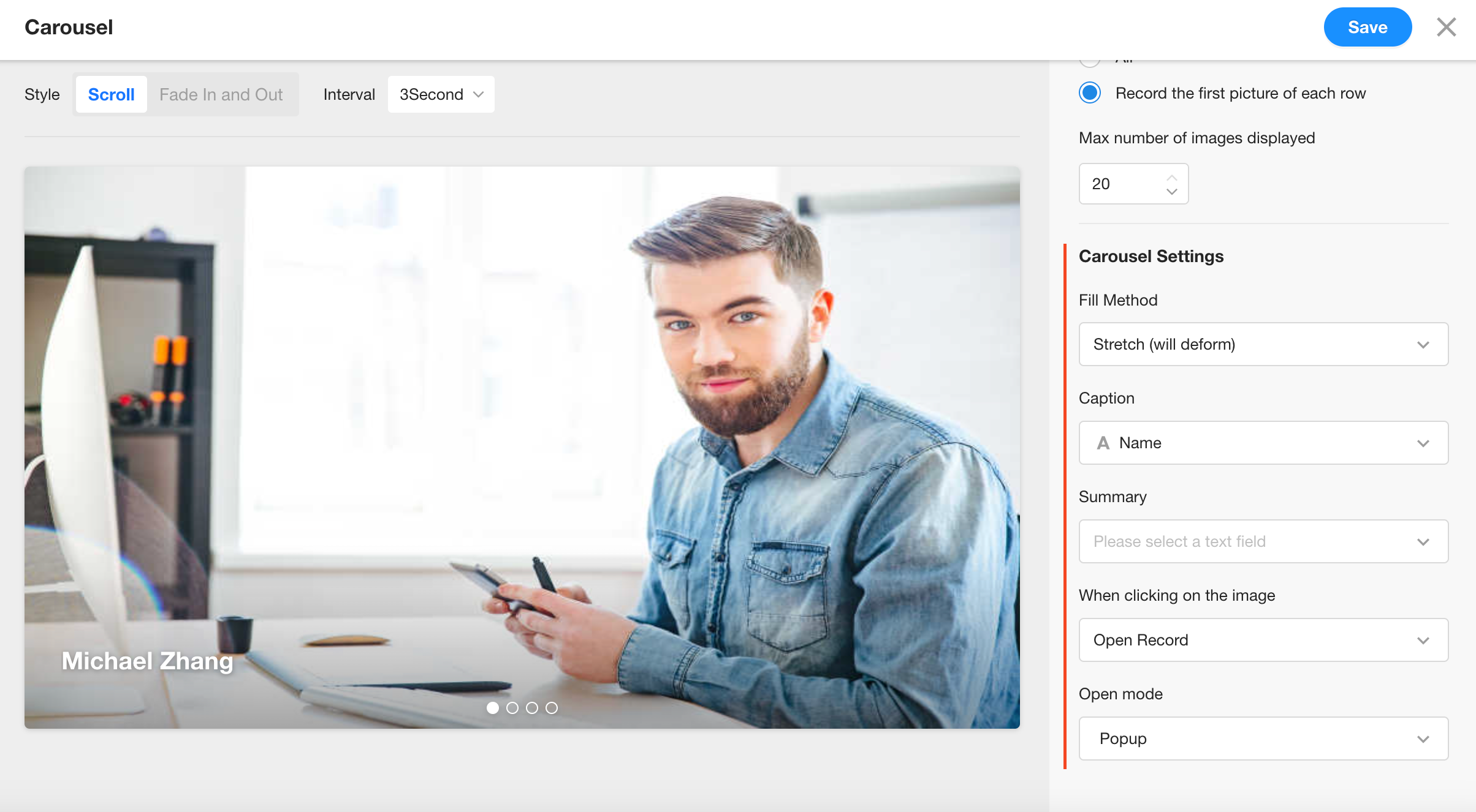 The carousel component allows you to loop through images stored in records. Each image can include embedded links or descriptive text. Carousels are commonly used for showcasing and promotional purposes. For example, display newly onboarded employees from the past 30 days: