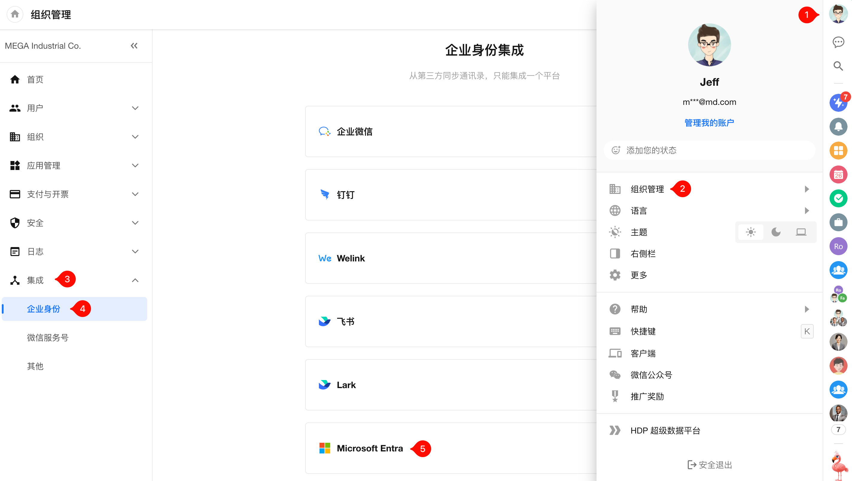 1. 在HAP中,超级管理员点击【个人头像】 > 【组织管理】 > 【集成】 >【企业身份】,选择 “Microsoft Entra”。