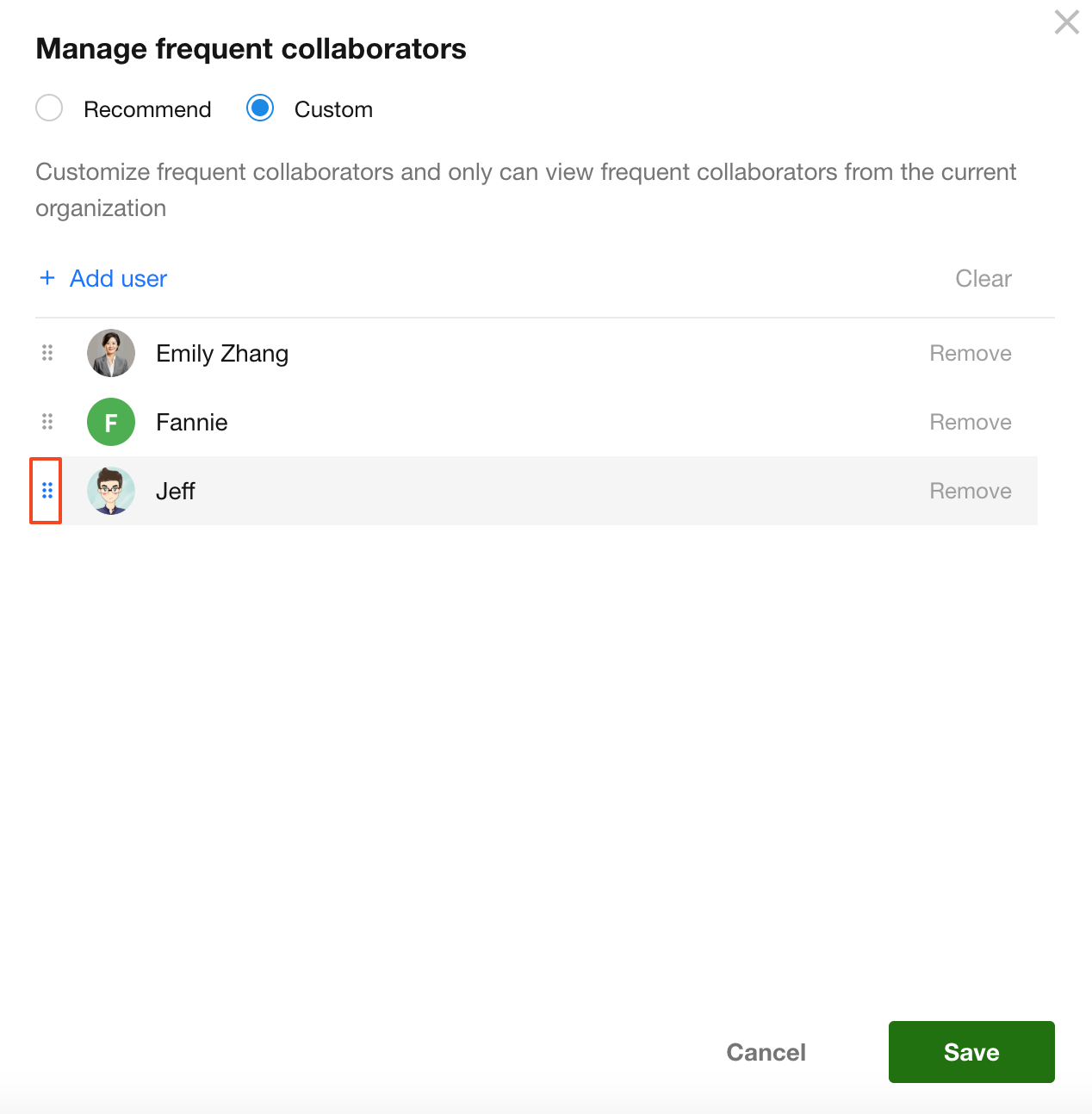 To manage this list, go to Contacts, then click Manage Frequent Collaborators.
