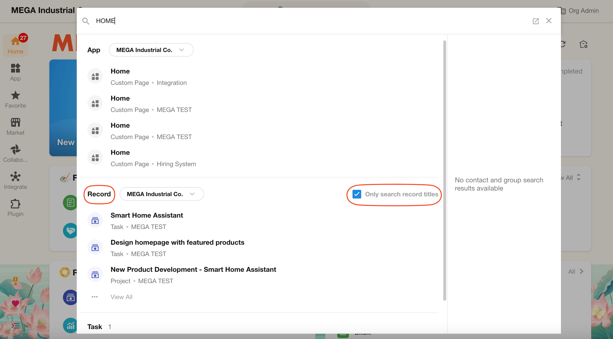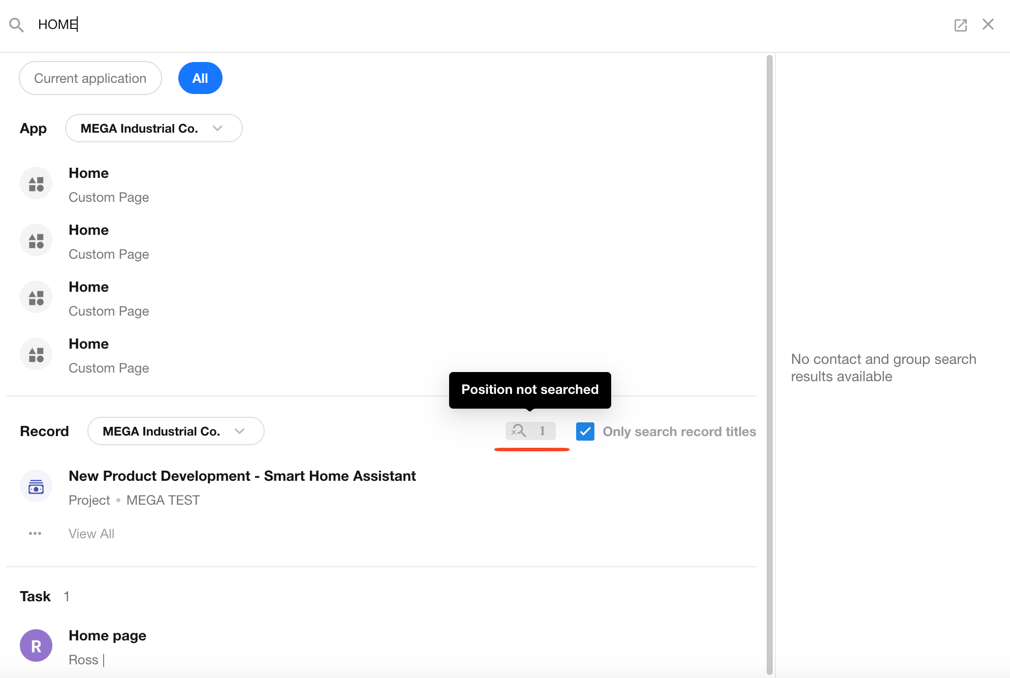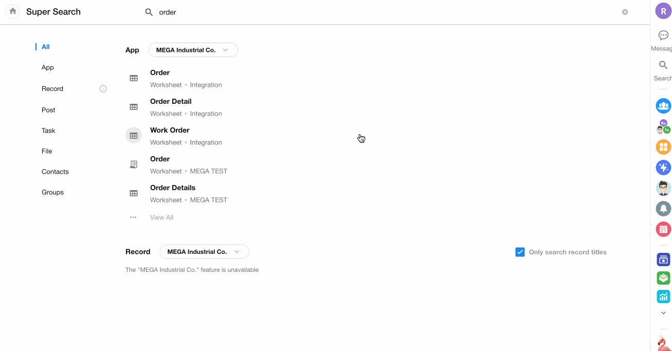 If the search box is triggered within an app, only content from that specific app (such as app groups, worksheet names, and records) will be searched. Other apps and modules (posts, tasks, files) are excluded.